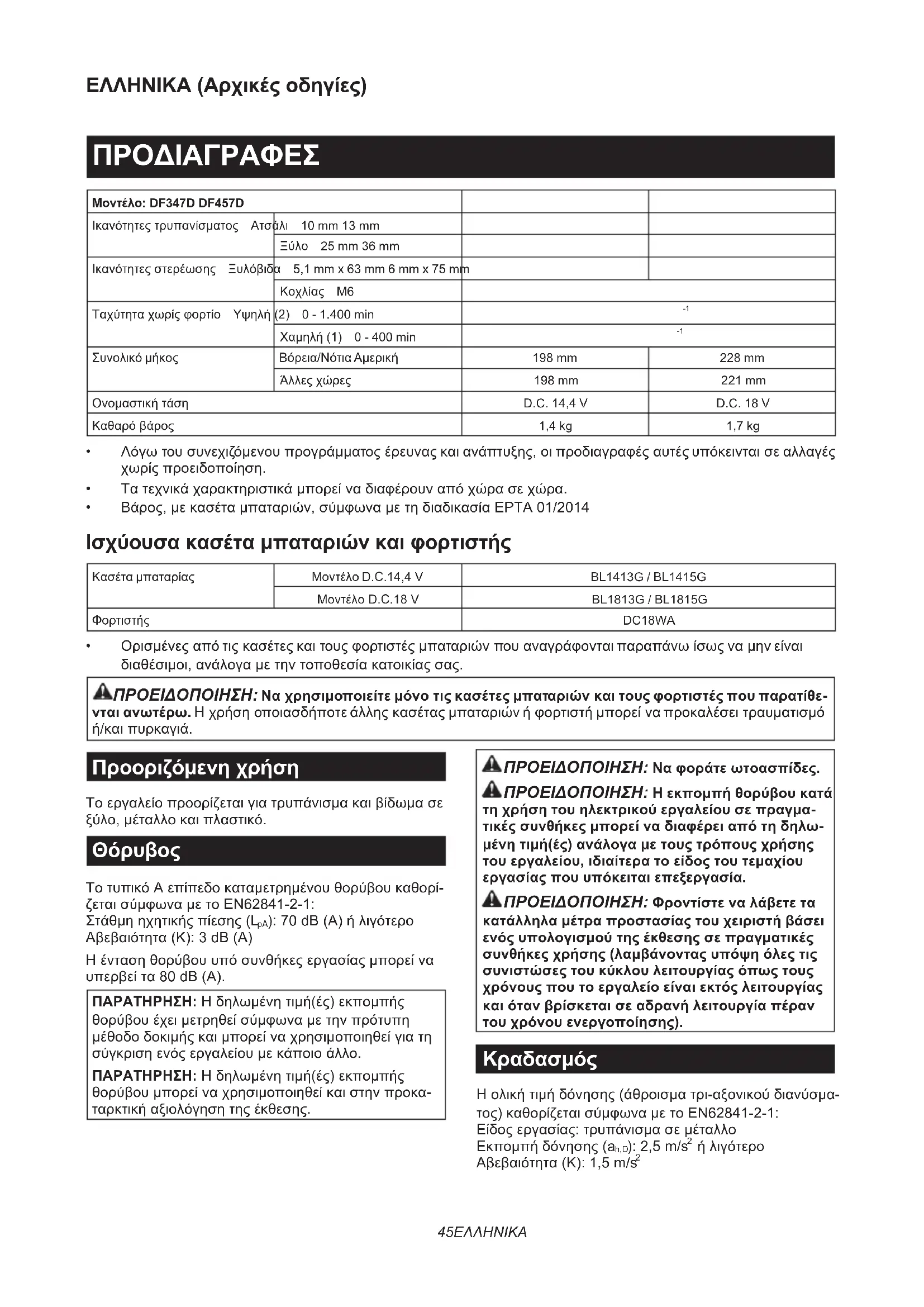 - Plastbæretasken BEMÆRK:Nogletingpådennelistekanværeinklu- deretiværktøjspakkensomstandardtilbehør.Detkan væreforskelligefralandtilland.45 ΕΛΛΗΝΙΚΑ ΕΛΛΗΝΙΚΑ (Αρχικές οδηγίες) ΠΡΟΔΙΑΓΡΑΦΕΣ Μοντέλο: DF347D DF457D Ικανότητεςτρυπανίσματος Ατσάλι 10 mm 13 mm Ξύλο 25 mm 36 mm Ικανότητεςστερέωσης Ξυλόβιδα 5,1 mm x 63 mm 6 mm x 75 mm Κοχλίας M6 Ταχύτηταχωρίςφορτίο Υψηλή(2) 0 - 1.400 min