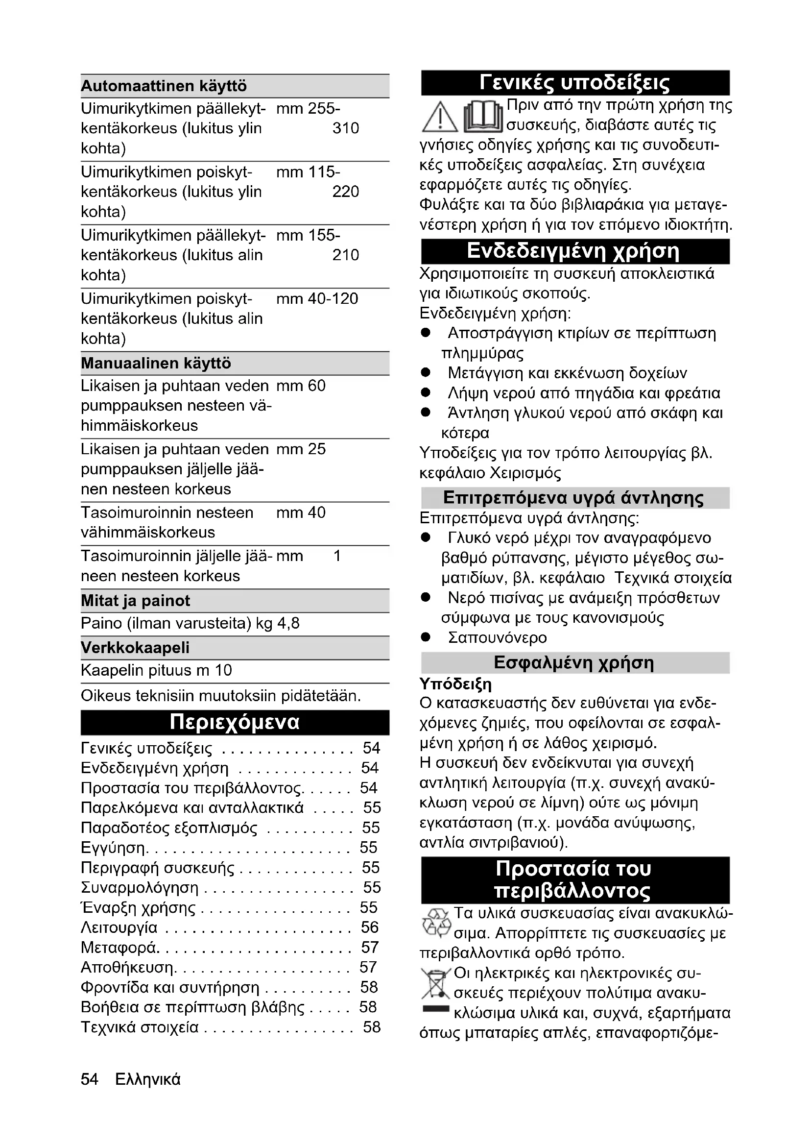 Ο κατασκευαστής δεν ευθύνεται για ενδε- χόμενες ζημιές, που οφείλονται σε εσφαλ- μένη χρήση ή σε λάθος χειρισμό. Η συσκευή δεν ενδείκνυται για συνεχή αντλητική λειτουργία (π.χ. συνεχή ανακύ- κλωση νερού σε λίμνη) ούτε ως μόνιμη εγκατάσταση (π.χ. μονάδα ανύψωσης, αντλία σιντριβανιού). Προστασία του περιβάλλοντος Τα υλικά συσκευασίας είναι ανακυκλώ- σιμα. Απορρίπτετε τις συσκευασίες με περιβαλλοντικά ορθό τρόπο. Οι ηλεκτρικές και ηλεκτρονικές συ- σκευές περιέχουν πολύτιμα ανακυ- κλώσιμα υλικά και, συχνά, εξαρτήματα όπως μπαταρίες απλές, επαναφορτιζόμε- Automaattinen käyttö Uimurikytkimen päällekyt- kentäkorkeus (lukitus ylin kohta) mm 255-