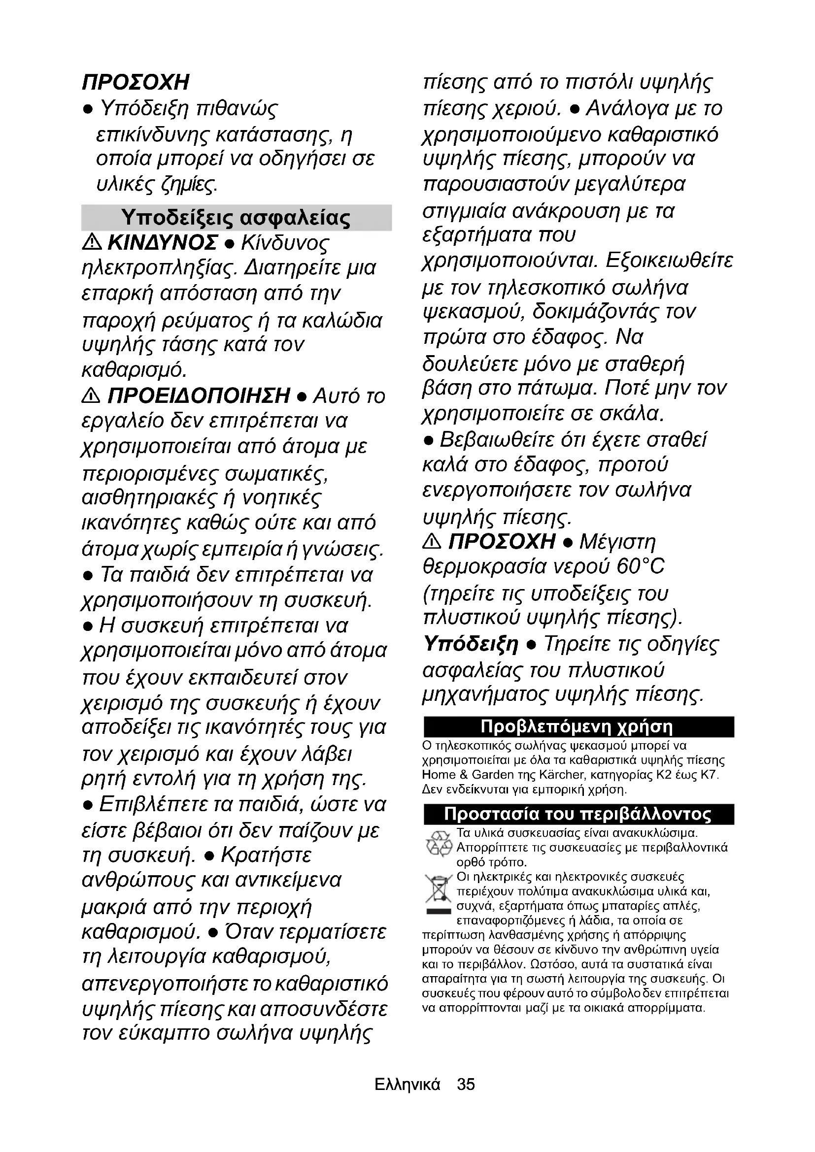ικανότητες καθώς ούτε και από άτομα χωρίς εμπειρία ή γνώσεις. ● Τα παιδιά δεν επιτρέπεται να χρησιμοποιήσουν τη συσκευή. ● Η συσκευή επιτρέπεται να χρησιμοποιείται μόνο από άτομα που έχουν εκπαιδευτεί στον χειρισμό της συσκευής ή έχουν αποδείξει τις ικανότητές τους για τον χειρισμό και έχουν λάβει ρητή εντολή για τη χρήση της. ● Επιβλέπετε τα παιδιά, ώστε να είστε βέβαιοι ότι δεν παίζουν με τη συσκευή. ● Κρατήστε ανθρώπους και αντικείμενα μακριά από την περιοχή καθαρισμού. ● Όταν τερματίσετε τη λειτουργία καθαρισμού, απενεργοποιήστε το καθαριστικό υψηλής πίεσης και αποσυνδέστε τον εύκαμπτο σωλήνα υψηλής πίεσης από το πιστόλι υψηλής πίεσης χεριού. ● Ανάλογα με το χρησιμοποιούμενο καθαριστικό υψηλής πίεσης, μπορούν να παρουσιαστούν μεγαλύτερα στιγμιαία ανάκρουση με τα εξαρτήματα που χρησιμοποιούνται. Εξοικειωθείτε με τον τηλεσκοπικό σωλήνα ψεκασμού, δοκιμάζοντάς τον πρώτα στο έδαφος. Να δουλεύετε μόνο με σταθερή βάση στο πάτωμα. Ποτέ μην τον χρησιμοποιείτε σε σκάλα