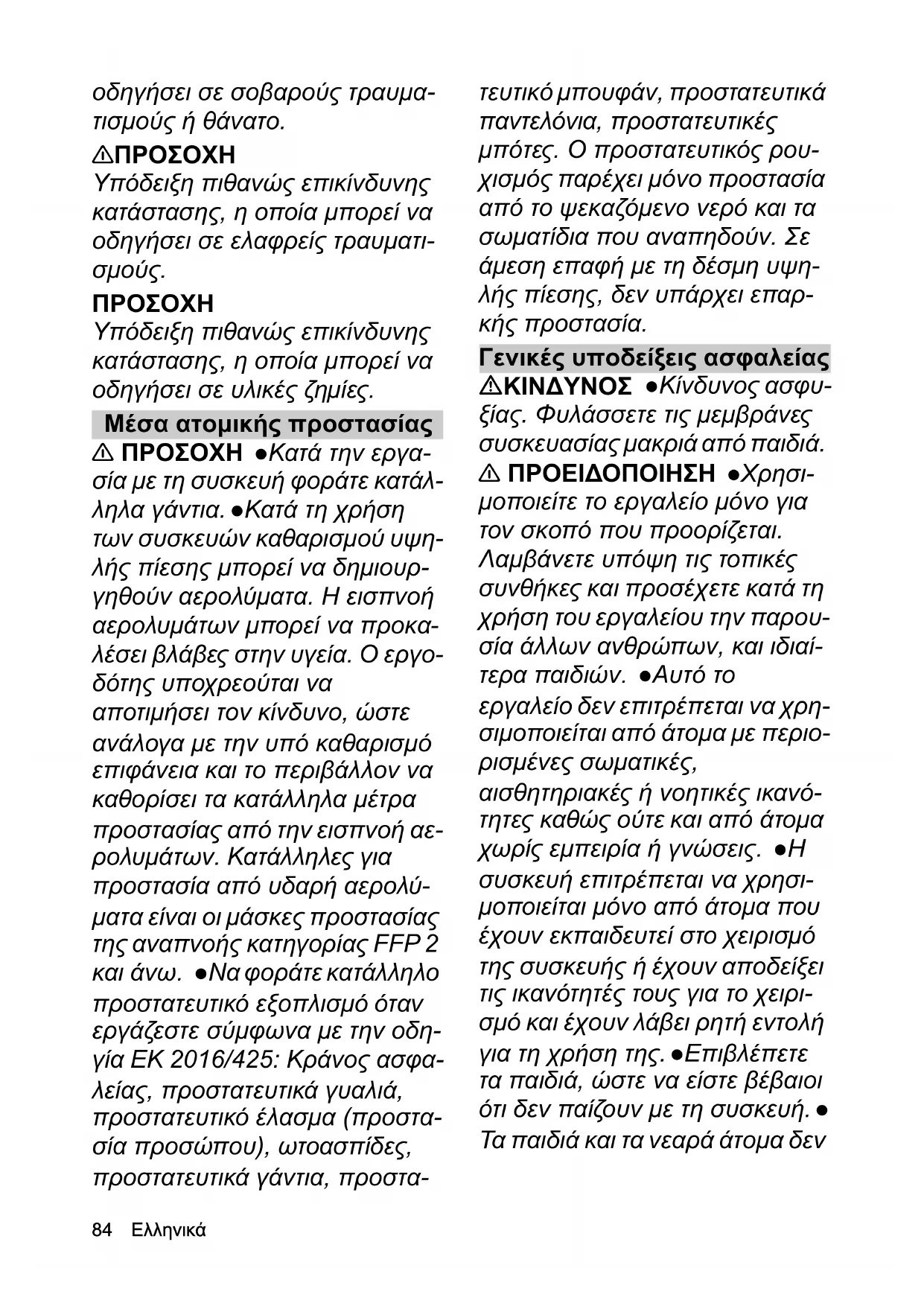 Υπόδειξη πιθανώς επικίνδυνης κατάστασης, η οποία μπορεί να οδηγήσει σε υλικές ζημίες. Μέσα ατομικής προστασίας 몇 ΠΡΟΣΟΧΗ Κατά την εργα- σία με τη συσκευή φοράτε κατάλ- ληλα γάντια. Κατά τη χρήση των συσκευών καθαρισμού υψη- λής πίεσης μπορεί να δημιουρ- γηθούν αερολύματα. Η εισπνοή αερολυμάτων μπορεί να προκα- λέσει βλάβες στην υγεία. Ο εργο- δότης υποχρεούται να αποτιμήσει τον κίνδυνο, ώστε ανάλογα με την υπό καθαρισμό επιφάνεια και το περιβάλλον να καθορίσει τα κατάλληλα μέτρα προστασίας από την εισπνοή αε- ρολυμάτων. Κατάλληλες για προστασία από υδαρή αερολύ- ματα είναι οι μάσκες προστασίας της αναπνοής κατηγορίας FFP 2 και άνω. Να φοράτε κατάλληλο προστατευτικό εξοπλισμό όταν εργάζεστε σύμφωνα με την οδη- γία ΕΚ 2016/425: Κράνος ασφα- λείας, προστατευτικά γυαλιά, προστατευτικό έλασμα (προστα- σία προσώπου), ωτοασπίδες, προστατευτικά γάντια, προστα- τευτικό μπουφάν, προστατευτικά παντελόνια, προστατευτικές μπότες. Ο προστατευτικός ρου- χισμός παρέχει μόνο προστασία από το ψεκαζόμενο νερό και τα σωματίδια που αναπηδούν. Σε άμεση επαφή με τη δέσμη υψη- λής πίεσης, δεν υπάρχει επαρ- κής προστασία. Γενικές υποδείξεις ασφαλείας