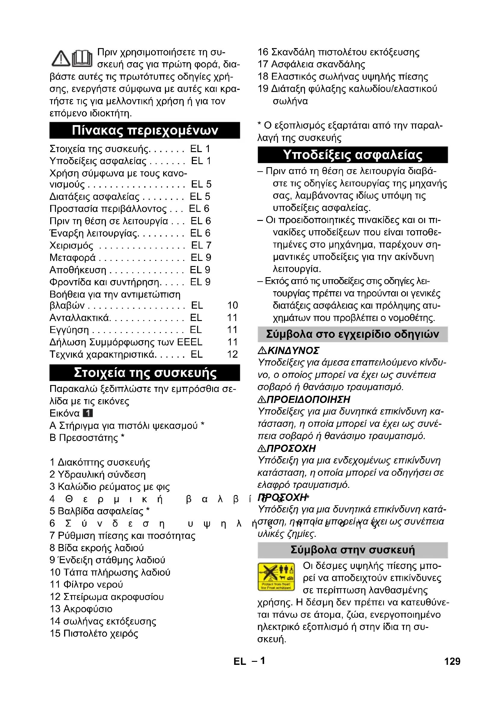 Πίνακας περιεχομένων Στοιχεία της συσκευής. . . . . . . EL 1 Υποδείξεις ασφαλείας . . . . . . . EL 1 Χρήση σύμφωνα με τους κανο- νισμούς . . . . . . . . . . . . . . . . . . EL 5 Διατάξεις ασφαλείας . . . . . . . . EL 5 Προστασία περιβάλλοντος . . . EL 6 Πριν τη θέση σε λειτουργία . . . EL 6 Έναρξη λειτουργίας. . . . . . . . . EL 6 Χειρισμός . . . . . . . . . . . . . . . . EL 7 Μεταφορά . . . . . . . . . . . . . . . . EL 9 Αποθήκευση . . . . . . . . . . . . . . EL 9 Φροντίδα και συντήρηση. . . . . EL 9 Βοήθεια για την αντιμετώπιση βλαβών . . . . . . . . . . . . . . . . . . EL 10 Ανταλλακτικά. . . . . . . . . . . . . . EL 11 Εγγύηση . . . . . . . . . . . . . . . . . EL 11 Δήλωση Συμμόρφωσης των ΕEEL 11 Τεχνικά χαρακτηριστικά. . . . . . EL 12 Στοιχεία της συσκευής Υποδείξεις ασφαλείας Σύμβολα στο εγχειρίδιο οδηγιών Σύμβολα στην συσκευή 129EL– 2 Σύμφωνα με τους ισχύοντες κανο- νισμούς, η συσκευή δεν πρέπει ποτέ να λειτουργεί στο δίκτυο πό- σιμου νερού χωρίς διαχωριστή συστήματος. Πρέπει να χρησιμοποιείται κατάλληλος διαχωριστής συστήματος της εταιρείας KÄRCHER ή, εναλλακτικά, δια- χωριστής συστήματος κατά EN 12729 Τύ- πος BA. Το νερό που ρέει μέσα από ένα διαχωριστή συστήματος θεωρείται μη πόσιμο. Η συσκευή διαθέτει ορισμένες καυτές επιφάνειες που μπορούν να προκαλέσουν εγκαύματα. Κίνδυνος ηλεκτροπληξίας. Το πε- ρίβλημα επιτρέπεται να το ανοί- γουν μόνο ηλεκτρολόγοι. – Η αναγραφόμενη τάση στην πινακίδα τύπου πρέπει να είναι ίδια με την τάση της πηγής ρεύματος. – Ελάχιστη ασφάλεια πρίζας (βλ. Τεχνικά χαρακτηριστικά). – Οι συσκευές της κλάσης προστασίας I επιτρέπεται να συνδέονται μόνο σε πη- γές ρεύματος που διαθέτουν κατάλληλη