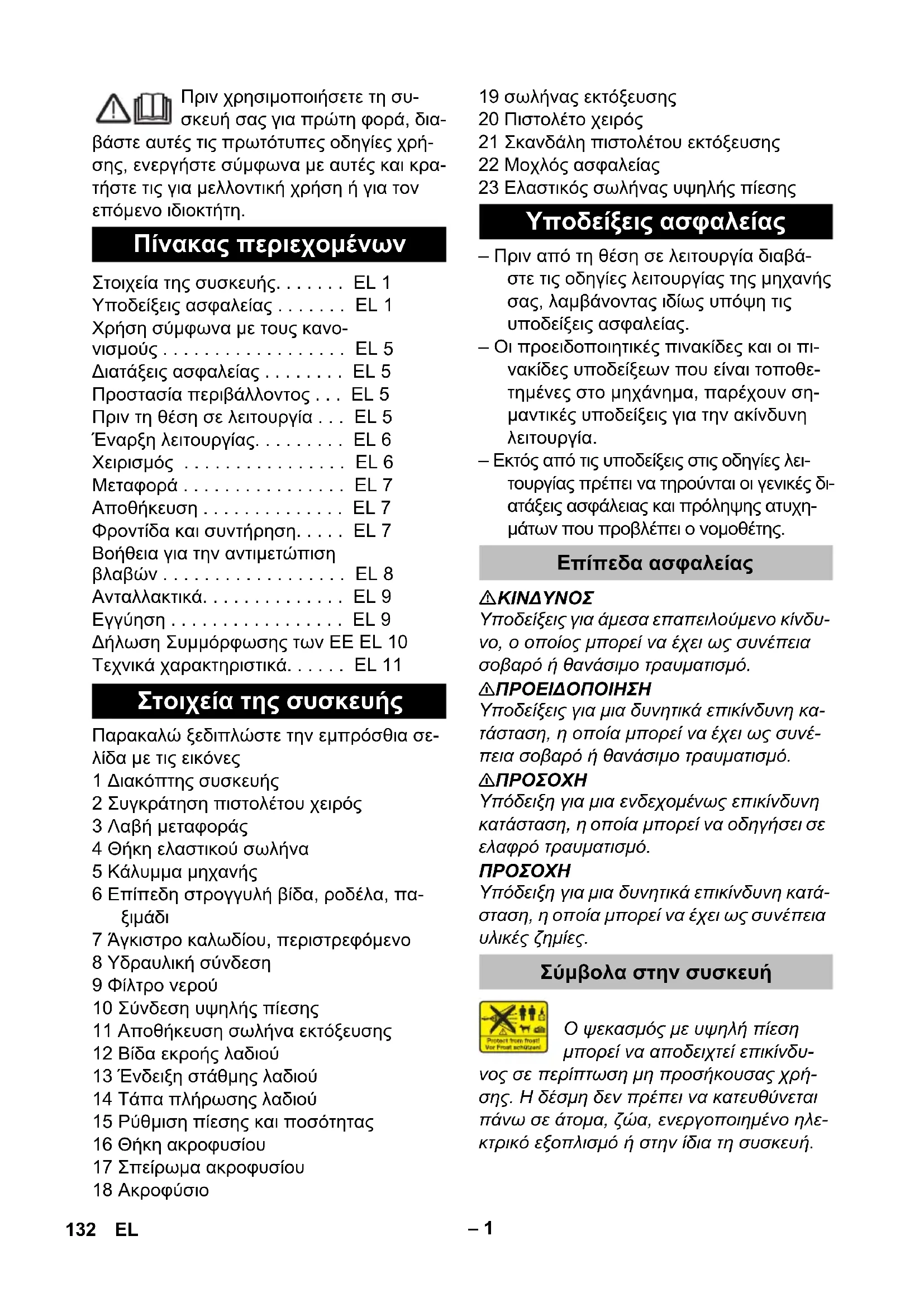 περίπτωση μη προσήκουσας χρή- σης. Η δέσμη δεν πρέπει να κατευθύνεται πάνω σε άτομα, ζώα, ενεργοποιημένο ηλε- κτρικό εξοπλισμό ή στην ίδια τη συσκευή. Πίνακας περιεχομένων Στοιχεία της συσκευής. . . . . . . EL 1 Υποδείξεις ασφαλείας . . . . . . . EL 1 Χρήση σύμφωνα με τους κανο- νισμούς . . . . . . . . . . . . . . . . . . EL 5 Διατάξεις ασφαλείας . . . . . . . . EL 5 Προστασία περιβάλλοντος . . . EL 5 Πριν τη θέση σε λειτουργία . . . EL 5 Έναρξη λειτουργίας. . . . . . . . . EL 6 Χειρισμός . . . . . . . . . . . . . . . . EL 6 Μεταφορά . . . . . . . . . . . . . . . . EL 7 Αποθήκευση . . . . . . . . . . . . . . EL 7 Φροντίδα και συντήρηση. . . . . EL 7 Βοήθεια για την αντιμετώπιση βλαβών . . . . . . . . . . . . . . . . . . EL 8 Ανταλλακτικά. . . . . . . . . . . . . . EL 9 Εγγύηση . . . . . . . . . . . . . . . . . EL 9 Δήλωση Συμμόρφωσης των ΕE EL 10 Τεχνικά χαρακτηριστικά. . . . . . EL 11 Στοιχεία της συσκευής Υποδείξεις ασφαλείας Επίπεδα ασφαλείας Σύμβολα στην συσκευή 132 EL– 2 Σύμφωνα με τους ισχύοντες κανο- νισμούς, το μηχάνημα δεν πρέπει να λειτουργεί στο δίκτυο πόσιμου νερού χωρίς διαχωριστή συστήματος. Να χρησιμοποιείται ένας κατάλληλος διαχωρι- στής συστήματος της εταιρείας Kärcher ή εναλλακτικά ένας διαχωριστής συστήματος κατά το EN 12729 τύπος BA. Το νερό που ρέει μέσα από ένα διαχωριστή συστήματος θεωρείται μη πόσιμο.