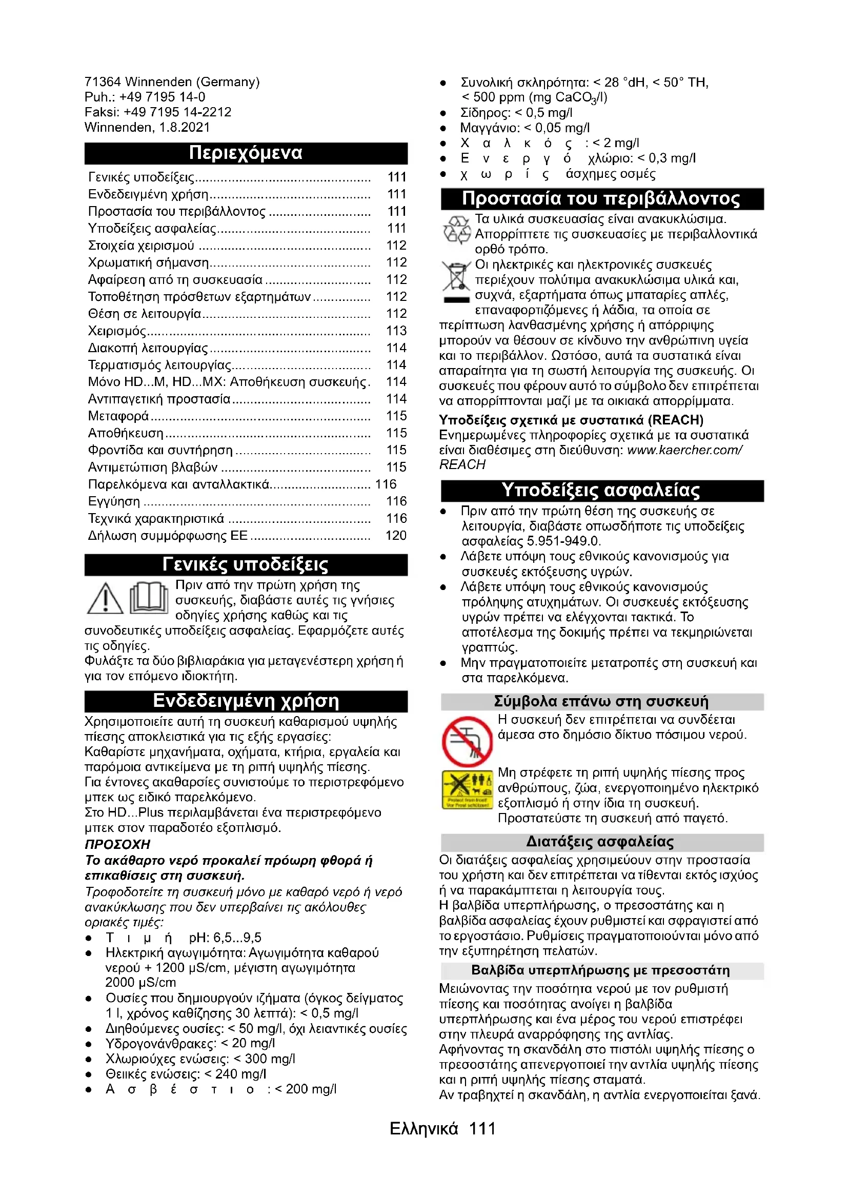 /l) ● Σίδηρος: < 0,5 mg/l ● Μαγγάνιο: < 0,05 mg/l ●Χαλκός: < 2 mg/l ●Ενεργό χλώριο: < 0,3 mg/l ●χωρίς άσχημες οσμές Προστασία του περιβάλλοντος Τα υλικά συσκευασίας είναι ανακυκλώσιμα. Απορρίπτετε τις συσκευασίες με περιβαλλοντικά ορθό τρόπο. Οι ηλεκτρικές και ηλεκτρονικές συσκευές περιέχουν πολύτιμα ανακυκλώσιμα υλικά και, συχνά, εξαρτήματα όπως μπαταρίες απλές, επαναφορτιζόμενες ή λάδια, τα οποία σε περίπτωση λανθασμένης χρήσης ή απόρριψης μπορούν να θέσουν σε κίνδυνο την ανθρώπινη υγεία και το περιβάλλον. Ωστόσο, αυτά τα συστατικά είναι απαραίτητα για τη σωστή λειτουργία της συσκευής. Οι συσκευές που φέρουν αυτό το σύμβολο δεν επιτρέπεται να απορρίπτονται μαζί με τα οικιακά απορρίμματα. Υποδείξεις σχετικά με συστατικά (REACH) Ενημερωμένες πληροφορίες σχετικά με τα συστατικά είναι διαθέσιμες στη διεύθυνση: www.kaercher.com/ REACH Υποδείξεις ασφαλείας ●Πριν από την πρώτη θέση της συσκευής σε λειτουργία, διαβάστε οπωσδήποτε τις υποδείξεις ασφαλείας 5.951-949.0. ●Λάβετε υπόψη τους εθνικούς κανονισμούς για συσκευές εκτόξευσης υγρών. ●Λάβετε υπόψη τους εθνικούς κανονισμούς πρόληψης ατυχημάτων. Οι συσκευές εκτόξευσης υγρών πρέπει να ελέγχονται τακτικά. Το αποτέλεσμα της δοκιμής πρέπει να τεκμηριώνεται