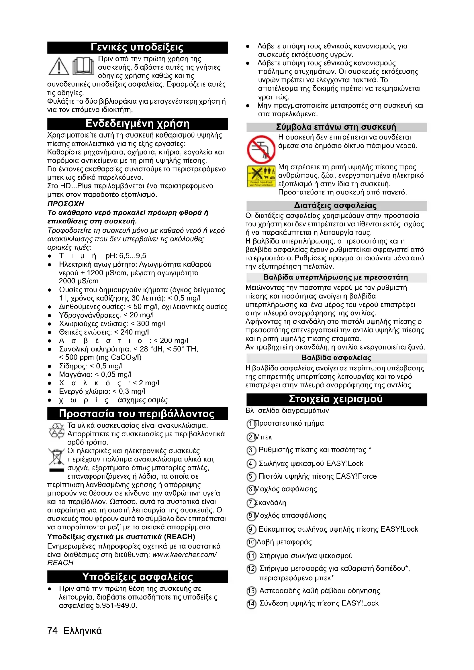 /l) ● Σίδηρος: < 0,5 mg/l ● Μαγγάνιο: < 0,05 mg/l ●Χαλκός: < 2 mg/l ● Ενεργό χλώριο: < 0,3 mg/l ●χωρίς άσχημες οσμές Προστασία του περιβάλλοντος Τα υλικά συσκευασίας είναι ανακυκλώσιμα. Απορρίπτετε τις συσκευασίες με περιβαλλοντικά ορθό τρόπο. Οι ηλεκτρικές και ηλεκτρονικές συσκευές περιέχουν πολύτιμα ανακυκλώσιμα υλικά και, συχνά, εξαρτήματα όπως μπαταρίες απλές, επαναφορτιζόμενες ή λάδια, τα οποία σε περίπτωση λανθασμένης χρήσης ή απόρριψης μπορούν να θέσουν σε κίνδυνο την ανθρώπινη υγεία και το περιβάλλον. Ωστόσο, αυτά τα συστατικά είναι απαραίτητα για τη σωστή λειτουργία της συσκευής. Οι συσκευές που φέρουν αυτό το σύμβολο δεν επιτρέπεται να απορρίπτονται μαζί με τα οικιακά απορρίμματα. Υποδείξεις σχετικά με συστατικά (REACH) Ενημερωμένες πληροφορίες σχετικά με τα συστατικά είναι διαθέσιμες στη διεύθυνση: www.kaercher.com/ REACH Υποδείξεις ασφαλείας ●Πριν από την πρώτη θέση της συσκευής σε λειτουργία, διαβάστε οπωσδήποτε τις υποδείξεις ασφαλείας 5.951-949.0. ●Λάβετε υπόψη τους εθνικούς κανονισμούς για συσκευές εκτόξευσης υγρών. ●Λάβετε υπόψη τους εθνικούς κανονισμούς πρόληψης ατυχημάτων. Οι συσκευές εκτόξευσης υγρών πρέπει να ελέγχονται τακτικά. Το αποτέλεσμα της δοκιμής πρέπει να τεκμηριώνεται