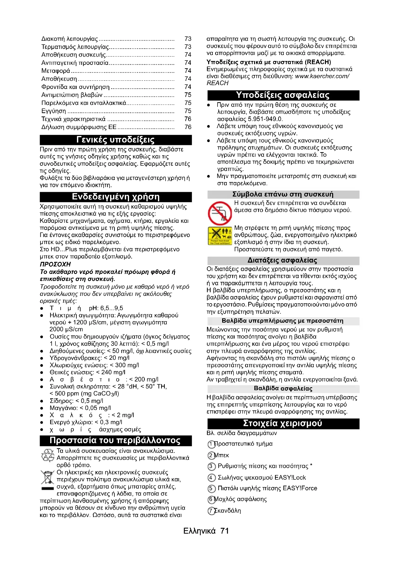 /l) ● Σίδηρος: < 0,5 mg/l ● Μαγγάνιο: < 0,05 mg/l ●Χαλκός: < 2 mg/l ● Ενεργό χλώριο: < 0,3 mg/l ●χωρίς άσχημες οσμές Προστασία του περιβάλλοντος Τα υλικά συσκευασίας είναι ανακυκλώσιμα. Απορρίπτετε τις συσκευασίες με περιβαλλοντικά ορθό τρόπο. Οι ηλεκτρικές και ηλεκτρονικές συσκευές περιέχουν πολύτιμα ανακυκλώσιμα υλικά και, συχνά, εξαρτήματα όπως μπαταρίες απλές, επαναφορτιζόμενες ή λάδια, τα οποία σε περίπτωση λανθασμένης χρήσης ή απόρριψης μπορούν να θέσουν σε κίνδυνο την ανθρώπινη υγεία και το περιβάλλον. Ωστόσο, αυτά τα συστατικά είναι απαραίτητα για τη σωστή λειτουργία της συσκευής. Οι συσκευές που φέρουν αυτό το σύμβολο δεν επιτρέπεται να απορρίπτονται μαζί με τα οικιακά απορρίμματα. Υποδείξεις σχετικά με συστατικά (REACH) Ενημερωμένες πληροφορίες σχετικά με τα συστατικά είναι διαθέσιμες στη διεύθυνση: www.kaercher.com/ REACH Υποδείξεις ασφαλείας ●Πριν από την πρώτη θέση της συσκευής σε λειτουργία, διαβάστε οπωσδήποτε τις υποδείξεις ασφαλείας 5.951-949.0. ●Λάβετε υπόψη τους εθνικούς κανονισμούς για συσκευές εκτόξευσης υγρών. ●Λάβετε υπόψη τους εθνικούς κανονισμούς πρόληψης ατυχημάτων. Οι συσκευές εκτόξευσης υγρών πρέπει να ελέγχονται τακτικά. Το αποτέλεσμα της δοκιμής πρέπει να τεκμηριώνεται