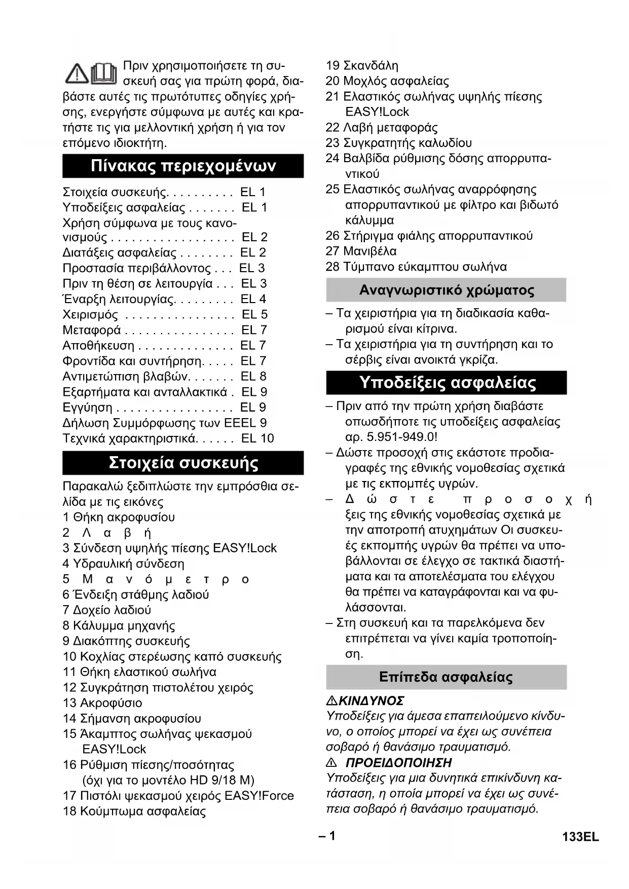 ΠΡΟΕΙΔΟΠΟΙΗΣΗ Υποδείξεις για μια δυνητικά επικίνδυνη κα- τάσταση, η οποία μπορεί να έχει ως συνέ- πεια σοβαρό ή θανάσιμο τραυματισμό. Πίνακας περιεχομένων Στοιχεία συσκευής. . . . . . . . . . EL 1 Υποδείξεις ασφαλείας . . . . . . . EL 1 Χρήση σύμφωνα με τους κανο- νισμούς . . . . . . . . . . . . . . . . . . EL 2 Διατάξεις ασφαλείας . . . . . . . . EL 2 Προστασία περιβάλλοντος . . . EL 3 Πριν τη θέση σε λειτουργία . . . EL 3 Έναρξη λειτουργίας. . . . . . . . . EL 4 Χειρισμός . . . . . . . . . . . . . . . . EL 5 Μεταφορά . . . . . . . . . . . . . . . . EL 7 Αποθήκευση . . . . . . . . . . . . . . EL 7 Φροντίδα και συντήρηση. . . . . EL 7 Αντιμετώπιση βλαβών. . . . . . . EL 8 Εξαρτήματα και ανταλλακτικά . EL 9 Εγγύηση . . . . . . . . . . . . . . . . . EL 9 Δήλωση Συμμόρφωσης των ΕEEL 9 Τεχνικά χαρακτηριστικά. . . . . . EL 10 Στοιχεία συσκευής Αναγνωριστικό χρώματος Υποδείξεις ασφαλείας Επίπεδα ασφαλείας 133EL– 2
