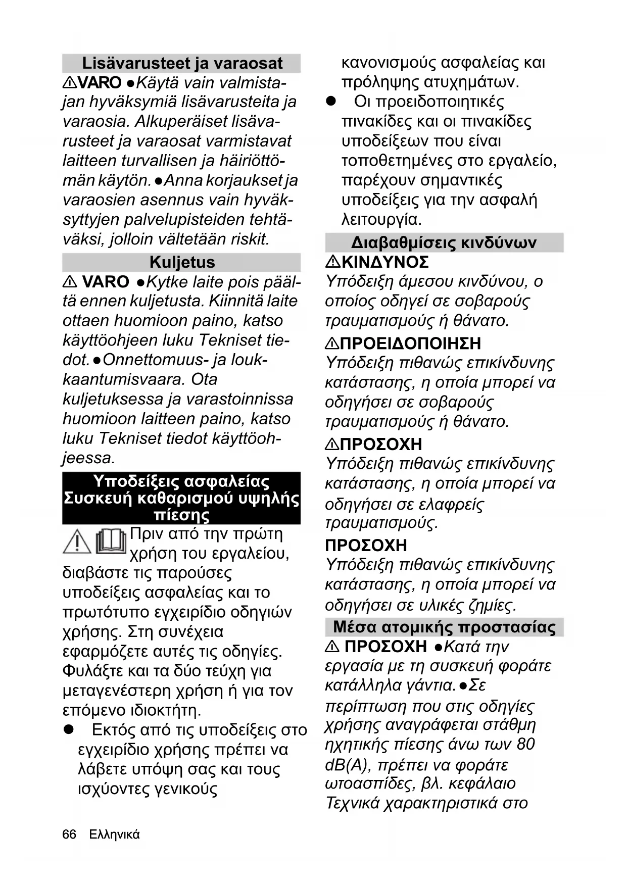 οδηγήσει σε υλικές ζημίες. Μέσα ατομικής προστασίας 몇 ΠΡΟΣΟΧΗ ●Κατά την εργασία με τη συσκευή φοράτε κατάλληλα γάντια. ●Σε περίπτωση που στις οδηγίες χρήσης αναγράφεται στάθμη ηχητικής πίεσης άνω των 80 dB(A), πρέπει να φοράτε ωτοασπίδες, βλ. κεφάλαιο Τεχνικά χαρακτηριστικά στοΕλληνικά 67 εγχειρίδιο χρήσης. ●Φοράτε κατάλληλη προστατευτική ενδυμασία και προστατευτικά γυαλιά για να προστατευτείτε από τα εξοστρακιζόμενα σταγονίδια ή τους ρύπους. ●Κατά τη χρήση των συσκευών καθαρισμού υψηλής πίεσης μπορεί να δημιουργηθούν αερολύματα. Η εισπνοή αερολυμάτων μπορεί να προκαλέσει βλάβες στην υγεία. Ο εργοδότης υποχρεούται να αποτιμήσει τον κίνδυνο, ώστε