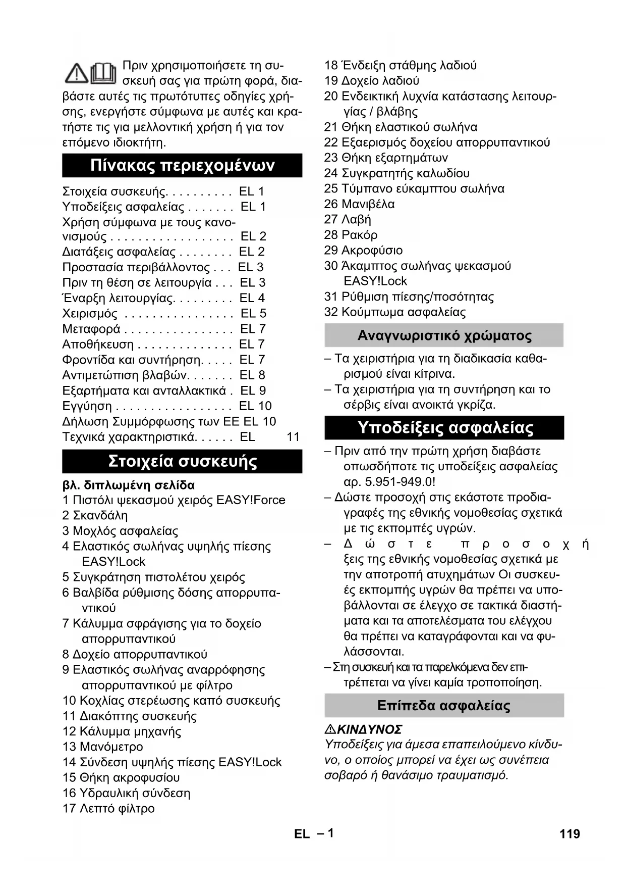 Υποδείξεις για άμεσα επαπειλούμενο κίνδυ- νο, ο οποίος μπορεί να έχει ως συνέπεια σοβαρό ή θανάσιμο τραυματισμό. Πίνακας περιεχομένων Στοιχεία συσκευής. . . . . . . . . . EL 1 Υποδείξεις ασφαλείας . . . . . . . EL 1 Χρήση σύμφωνα με τους κανο- νισμούς . . . . . . . . . . . . . . . . . . EL 2 Διατάξεις ασφαλείας . . . . . . . . EL 2 Προστασία περιβάλλοντος . . . EL 3 Πριν τη θέση σε λειτουργία . . . EL 3 Έναρξη λειτουργίας. . . . . . . . . EL 4 Χειρισμός . . . . . . . . . . . . . . . . EL 5 Μεταφορά . . . . . . . . . . . . . . . . EL 7 Αποθήκευση . . . . . . . . . . . . . . EL 7 Φροντίδα και συντήρηση. . . . . EL 7 Αντιμετώπιση βλαβών. . . . . . . EL 8 Εξαρτήματα και ανταλλακτικά . EL 9 Εγγύηση . . . . . . . . . . . . . . . . . EL 10 Δήλωση Συμμόρφωσης των ΕE EL 10 Τεχνικά χαρακτηριστικά. . . . . . EL 11 Στοιχεία συσκευής Αναγνωριστικό χρώματος Υποδείξεις ασφαλείας Επίπεδα ασφαλείας 119EL– 2 몇 ΠΡΟΕΙΔΟΠΟΙΗΣΗ Υποδείξεις για μια δυνητικά επικίνδυνη κα- τάσταση, η οποία μπορεί να έχει ως συνέ- πεια σοβαρό ή θανάσιμο τραυματισμό.