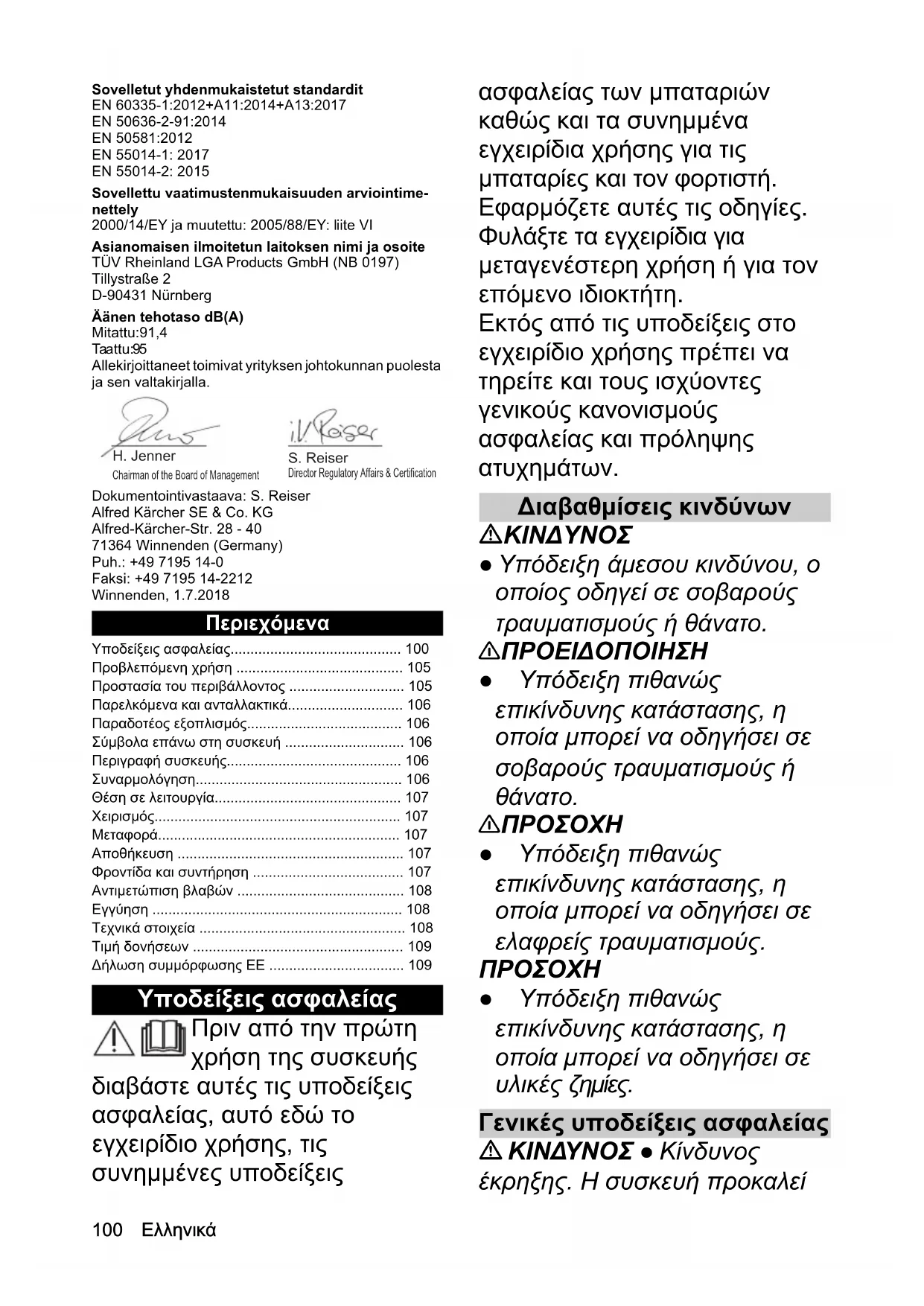 3,3 Epävarmuus K dB(A) 1,5 Mitat ja painot Pituus x leveys x korkeus mm 1474 x 3 46 x 511 Paino (ilman akkupakettia) kg 2,8100 Ελληνικά Sovelletut yhdenmukaistetut standardit EN 60335-1:2012+A11:2014+A13:2017 EN 50636-2-91:2014 EN 50581:2012 EN 55014-1: 2017 EN 55014-2: 2015 Sovellettu vaatimustenmukaisuuden arviointime- nettely 2000/14/EY ja muutettu: 2005/88/EY: liite VI Asianomaisen ilmoitetun laitoksen nimi ja osoite TÜV Rheinland LGA Products GmbH (NB 0197) Tillystraße 2 D-90431 Nürnberg Äänen tehotaso dB(A) Mitattu:91,4 Taattu:95 Allekirjoittaneet toimivat yrityksen johtokunnan puolesta ja sen valtakirjalla. Dokumentointivastaava: S. Reiser Alfred Kärcher SE & Co. KG Alfred-Kärcher-Str. 28 - 40 71364 Winnenden (Germany) Puh.: +49 7195 14-0 Faksi: +49 7195 14-2212 Winnenden, 1.7.2018 Περιεχόμενα Υποδείξεις ασφαλείας Πριν από την πρώτη χρήση της συσκευής διαβάστε αυτές τις υποδείξεις ασφαλείας, αυτό εδώ το εγχειρίδιο χρήσης, τις συνημμένες υποδείξεις ασφαλείας των μπαταριών καθώς και τα συνημμένα εγχειρίδια χρήσης για τις μπαταρίες και τον φορτιστή. Εφαρμόζετε αυτές τις οδηγίες. Φυλάξτε τα εγχειρίδια για μεταγενέστερη χρήση ή για τον επόμενο ιδιοκτήτη. Εκτός από τις υποδείξεις στο εγχειρίδιο χρήσης πρέπει να τηρείτε και τους ισχύοντες γενικούς κανονισμούς ασφαλείας και πρόληψης ατυχημάτων. Διαβαθμίσεις κινδύνων