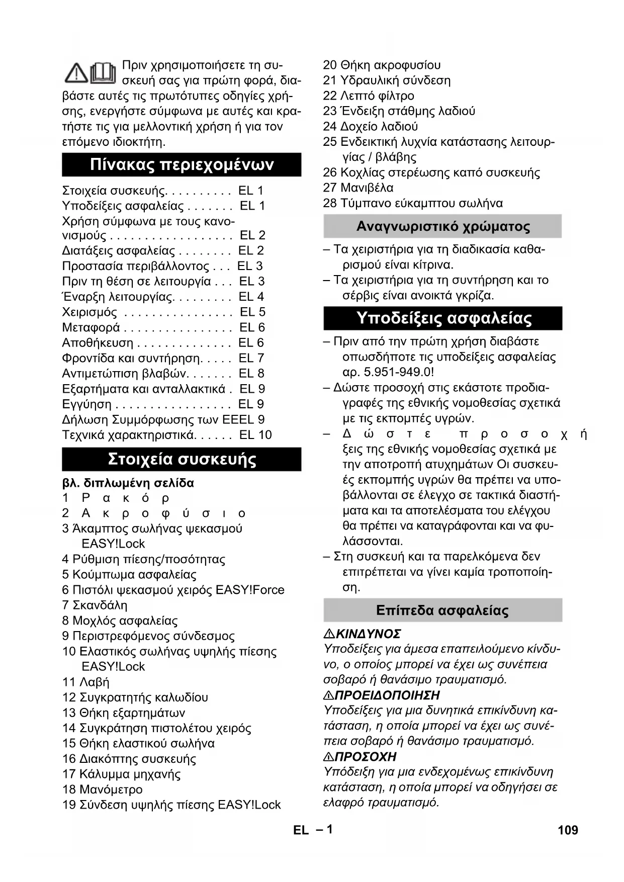 Υπόδειξη για μια ενδεχομένως επικίνδυνη κατάσταση, η οποία μπορεί να οδηγήσει σε ελαφρό τραυματισμό. Πίνακας περιεχομένων Στοιχεία συσκευής. . . . . . . . . . EL 1 Υποδείξεις ασφαλείας . . . . . . . EL 1 Χρήση σύμφωνα με τους κανο- νισμούς . . . . . . . . . . . . . . . . . . EL 2 Διατάξεις ασφαλείας . . . . . . . . EL 2 Προστασία περιβάλλοντος . . . EL 3 Πριν τη θέση σε λειτουργία . . . EL 3 Έναρξη λειτουργίας. . . . . . . . . EL 4 Χειρισμός . . . . . . . . . . . . . . . . EL 5 Μεταφορά . . . . . . . . . . . . . . . . EL 6 Αποθήκευση . . . . . . . . . . . . . . EL 6 Φροντίδα και συντήρηση. . . . . EL 7 Αντιμετώπιση βλαβών. . . . . . . EL 8 Εξαρτήματα και ανταλλακτικά . EL 9 Εγγύηση . . . . . . . . . . . . . . . . . EL 9 Δήλωση Συμμόρφωσης των ΕEEL 9 Τεχνικά χαρακτηριστικά. . . . . . EL 10 Στοιχεία συσκευής Αναγνωριστικό χρώματος Υποδείξεις ασφαλείας Επίπεδα ασφαλείας 109EL– 2