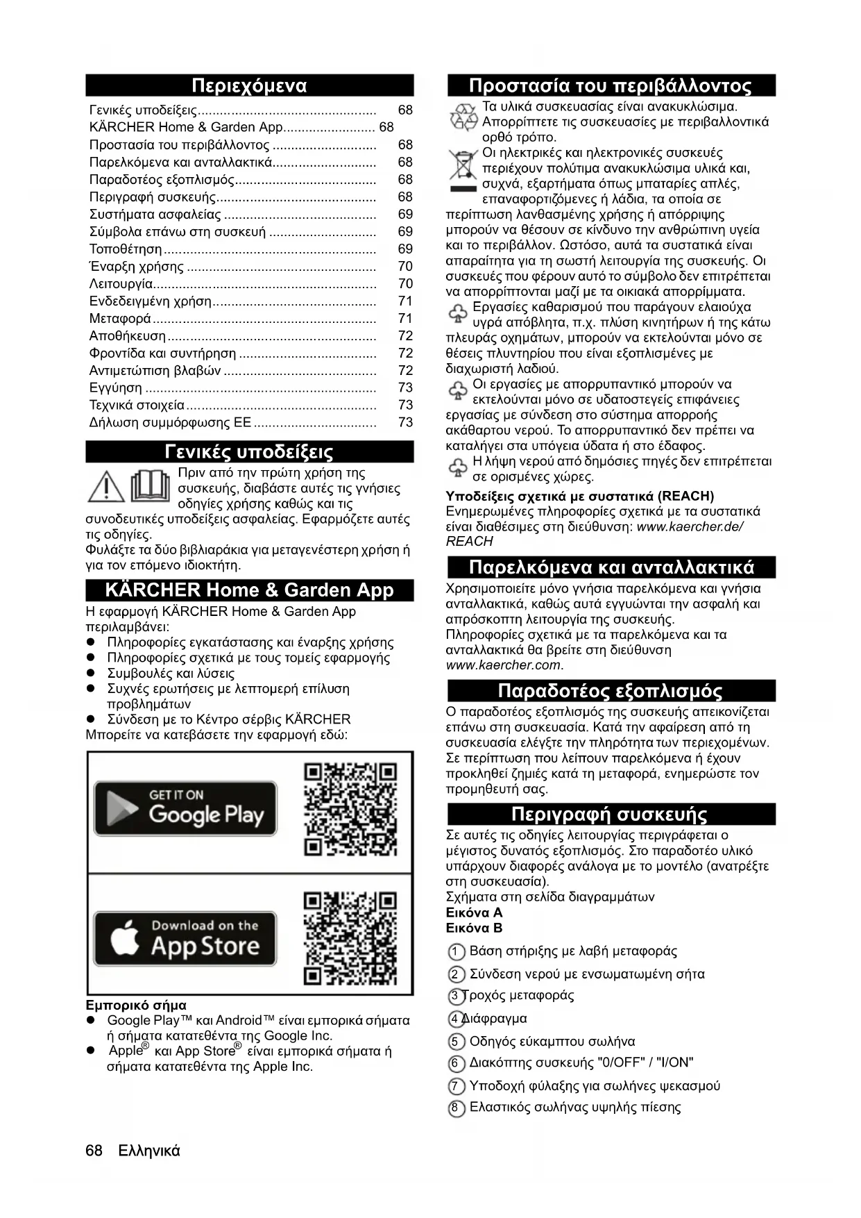 dB(A) 90 90 K 4 Premium Power Control Power Control Chairman of the Board of Management Director Regulatory Affairs & Certification H. Jenner S. Reiser68 Ελληνικά Περιεχόμενα Γενικές υποδείξεις Πριν από την πρώτη χρήση της συσκευής, διαβάστε αυτές τις γνήσιες οδηγίες χρήσης καθώς και τις συνοδευτικές υποδείξεις ασφαλείας. Εφαρμόζετε αυτές τις οδηγίες. Φυλάξτε τα δύο βιβλιαράκια για μεταγενέστερη χρήση ή για τον επόμενο ιδιοκτήτη. KÄRCHER Home & Garden App Η εφαρμογή KÄRCHER Home & Garden App περιλαμβάνει: Πληροφορίες εγκατάστασης και έναρξης χρήσης Πληροφορίες σχετικά με τους τομείς εφαρμογής Συμβουλές και λύσεις Συχνές ερωτήσεις με λεπτομερή επίλυση προβλημάτων Σύνδεση με το Κέντρο σέρβις KÄRCHER Μπορείτε να κατεβάσετε την εφαρμογή εδώ: Εμπορικό σήμα Google Play™ και Android™ είναι εμπορικά σήματα ή σήματα κατατεθέντα της Google Inc. Apple