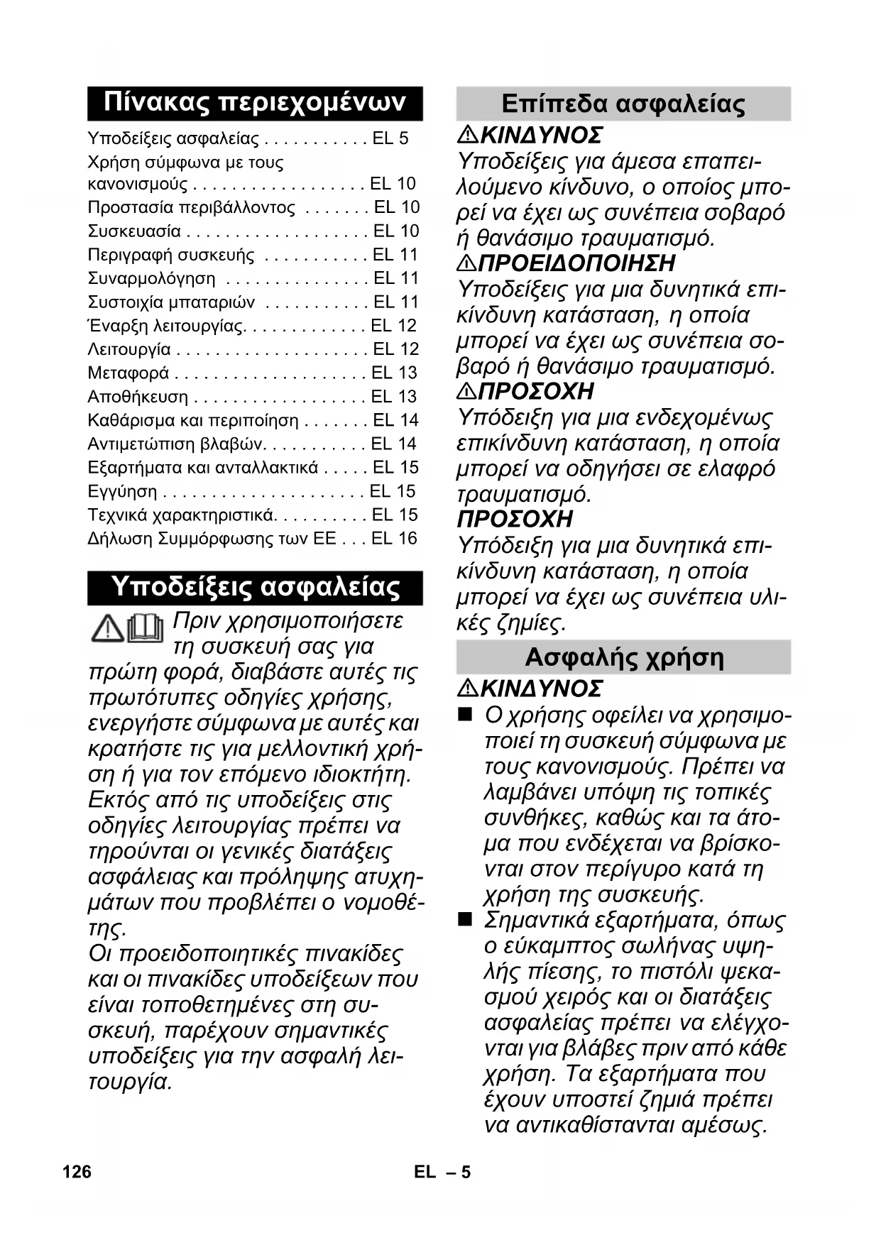 νται για βλάβες πριν από κάθε χρήση. Τα εξαρτήματα που έχουν υποστεί ζημιά πρέπει να αντικαθίστανται αμέσως. Πίνακας περιεχομένων Υποδείξεις ασφαλείας . . . . . . . . . . . EL 5 Χρήση σύμφωνα με τους κανονισμούς . . . . . . . . . . . . . . . . . . EL 10 Προστασία περιβάλλοντος . . . . . . . EL 10 Συσκευασία . . . . . . . . . . . . . . . . . . . EL 10 Περιγραφή συσκευής . . . . . . . . . . . EL 11 Συναρμολόγηση . . . . . . . . . . . . . . . EL 11 Συστοιχία μπαταριών . . . . . . . . . . . EL 11 Έναρξη λειτουργίας. . . . . . . . . . . . . EL 12 Λειτουργία . . . . . . . . . . . . . . . . . . . . EL 12 Μεταφορά . . . . . . . . . . . . . . . . . . . . EL 13 Αποθήκευση . . . . . . . . . . . . . . . . . . EL 13 Καθάρισμα και περιποίηση . . . . . . . EL 14 Αντιμετώπιση βλαβών. . . . . . . . . . . EL 14 Εξαρτήματα και ανταλλακτικά . . . . . EL 15 Εγγύηση . . . . . . . . . . . . . . . . . . . . . EL 15 Τεχνικά χαρακτηριστικά. . . . . . . . . . EL 15 Δήλωση Συμμόρφωσης των ΕE . . . EL 16 Υποδείξεις ασφαλείας Επίπεδα ασφαλείας Ασφαλής χρήση 126 EL– 6 Μην θέτετε σε λειτουργία μια συσκευή που έχει χαλασμένα εξαρτήματα. Οι δέσμες υψηλής πίεσης μπορεί να αποδειχτούν επι- κίνδυνες σε περίπτωση μη εν- δεδειγμένης χρήσης. Η δέσμη δεν πρέπει να κατευθύνεται πάνω σε άτομα, ζώα, ενεργο- ποιημένο ηλεκτρικό εξοπλι- σμό ή στην ίδια τη συσκευή. Μην στρέφετε τη ριπή υψηλής πίεσης σε άλλα άτομα ή στον εαυτό σας για να καθαρίσετε ρούχα ή παπούτσια. Τα ελαστικά οχημάτων/οι βαλ- βίδες ελαστικών μπορεί να υποστούν ζημιά και να διαρ- ραγούν από τη ριπή υψηλής πίεσης. Η πρώτη ένδειξη για κάτι τέτοιο είναι ο αποχρωματι- σμός του ελαστικού. Τα ελα- στικά οχημάτων /οι βαλβίδες ελαστικών που έχουν υποστεί ζημιά είναι επικίνδυνα για τη ζωή. Κατά τον καθαρισμό τη- ρείτε μια απόσταση ριπής του- λάχιστον 30 cm! 몇 ΠΡΟΕΙΔΟΠΟΙΗΣΗ Μην χρησιμοποιείτε τη συ- σκευή εάν υπάρχουν άλλα άτο- μα εντός του εύρους λειτουργί- ας της, εκτός εάν φορούν προ- στατευτικά ενδύματα. Δεν επιτρέπεται η χρήση