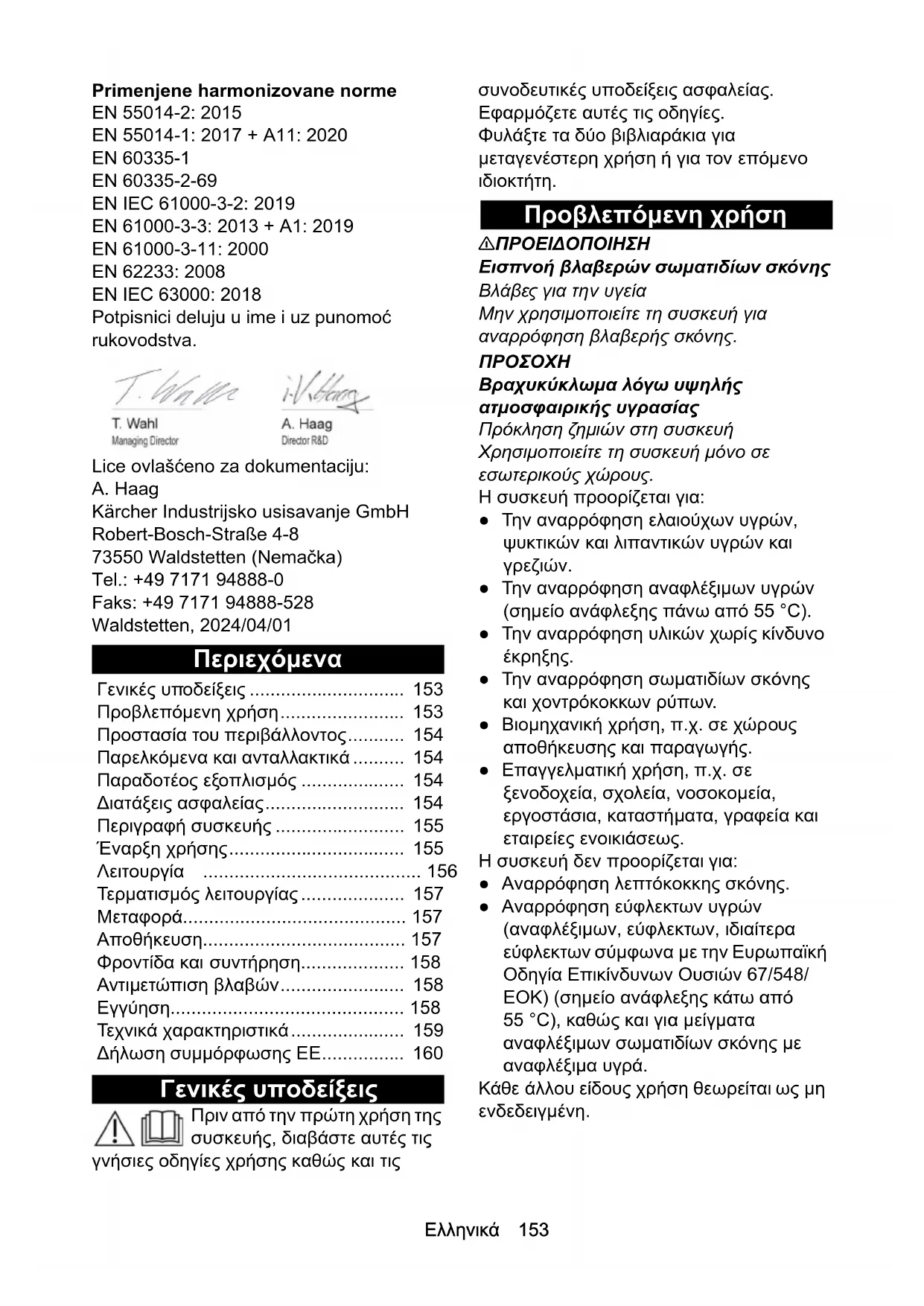 EN 61000-3-3: 2013 + A1: 2019 EN 61000-3-11: 2000 EN 62233: 2008 EN IEC 63000: 2018 Potpisnici deluju u ime i uz punomoć rukovodstva. Lice ovlašćeno za dokumentaciju: A. Haag Kärcher Industrijsko usisavanje GmbH Robert-Bosch-Straße 4-8 73550 Waldstetten (Nemačka) Tel.: +49 7171 94888-0 Faks: +49 7171 94888-528 Waldstetten, 2024/04/01 Περιεχόμενα Γενικές υποδείξεις Πριν από την πρώτη χρήση της συσκευής, διαβάστε αυτές τις γνήσιες οδηγίες χρήσης καθώς και τις συνοδευτικές υποδείξεις ασφαλείας. Εφαρμόζετε αυτές τις οδηγίες. Φυλάξτε τα δύο βιβλιαράκια για μεταγενέστερη χρήση ή για τον επόμενο