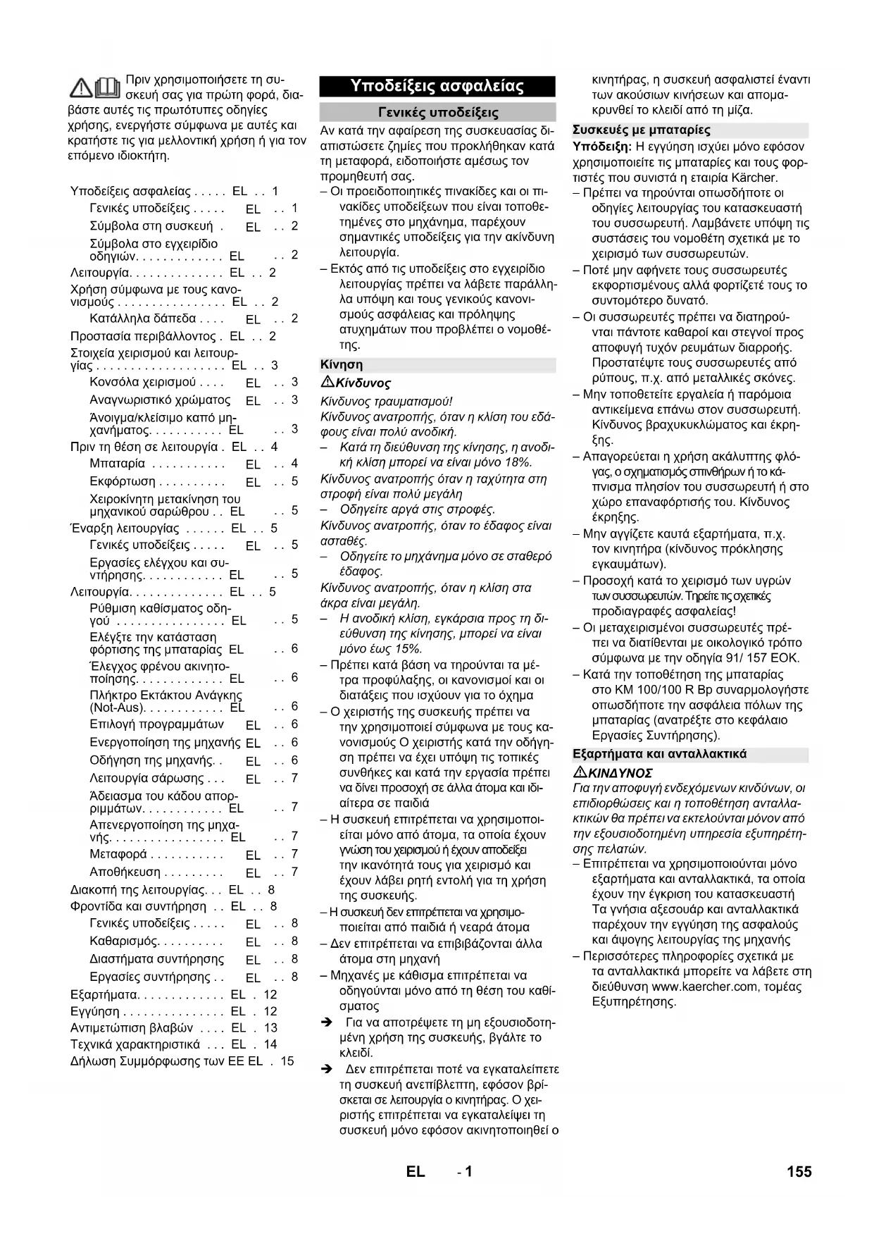 Για την αποφυγή ενδεχόμενων κινδύνων, οι επιδιορθώσεις και η τοποθέτηση ανταλλα- κτικών θα πρέπει να εκτελούνται μόνον από την εξουσιοδοτημένη υπηρεσία εξυπηρέτη- σης πελατών. – Επιτρέπεται να χρησιμοποιούνται μόνο εξαρτήματα και ανταλλακτικά, τα οποία έχουν την έγκριση του κατασκευαστή Τα γνήσια αξεσουάρ και ανταλλακτικά παρέχουν την εγγύηση της ασφαλούς και άψογης λειτουργίας της μηχανής – Περισσότερες πληροφορίες σχετικά με τα ανταλλακτικά μπορείτε να λάβετε στη διεύθυνση www.kaercher.com, τομέας Εξυπηρέτησης. Υποδείξεις ασφαλείας . . . . . EL . . 1 Γενικές υποδείξεις . . . . .