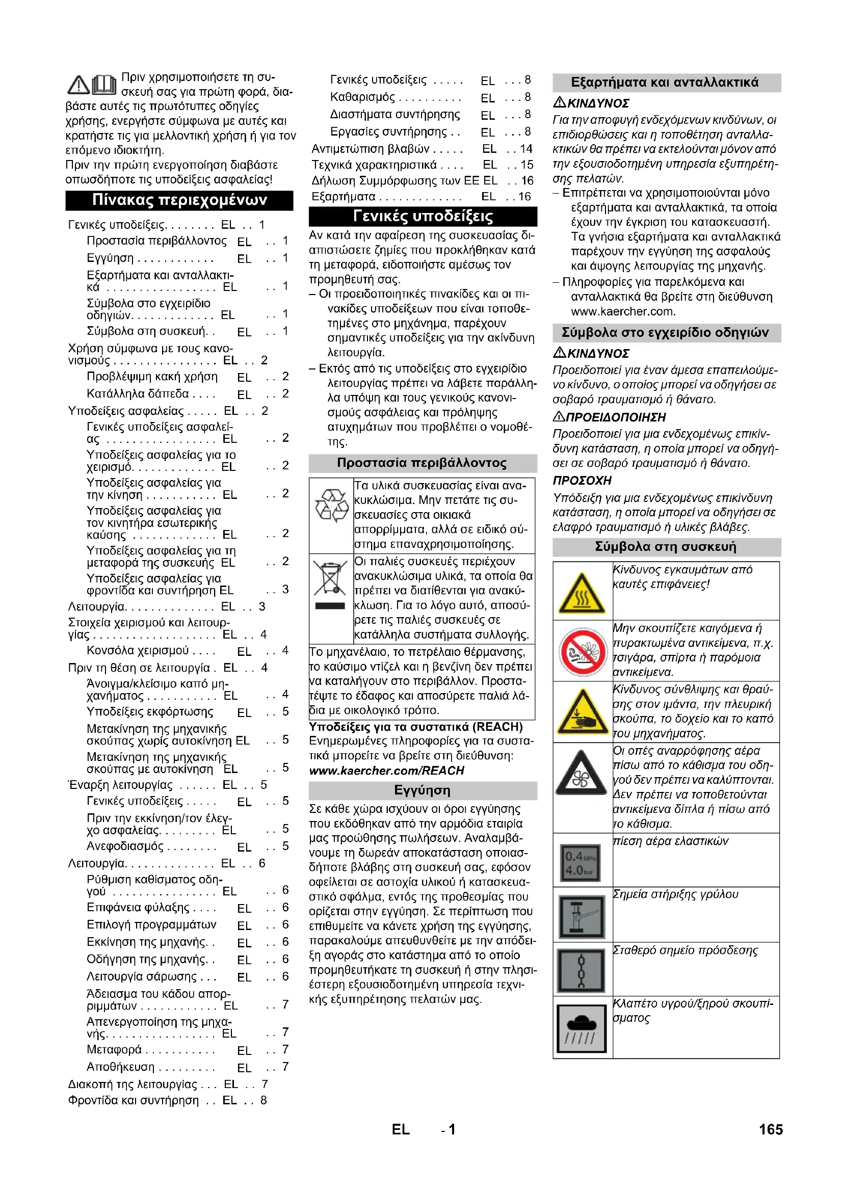 Sovellettu yhdenmukaisuuden analy- sointimenetelmä 2000/14/EY: Liite V Äänen tehotaso dB(A) Mitattu: 94 Taattu: 97 Chairman of the Board of Management Director Regulatory Affairs & Certification Tarvikkeet Sivuharja, vakio 6.906-132.0 Sisä- ja ulkopintojen puhdistamiseen. Sivuharja, kova 6.905-625.0 Piintyneen lian irrottamisseen ulkoalueilla, kosteudenkestävä. Sivuharja, pehmeä 6.905-626.0 Erityisesti tasaisten alustojen hienopölyla- kaisuun. Lakaisutela, vakio 4.762-430.0 Kulumisen- ja kosteudenkestävä. Yleishar- jaksilla sisä- ja ulkopuhdistukseen. Lakaisutela, pehmeä 4.762-442.0 Luonnonharjaksilla, erityisesti sisäaluei- den hienopintaisten lattioiden hienopölyla- kaisuun. Ei kosteudenkestävä, ei kuluttaville pinnoille. Lakaisutela, kova 4.762-443.0 Piintyneen lian irrottamisseen ulkoalueilla, kosteudenkestävä. Pölysuodatin 6.414-576.0 Lakaisutela, antistaat- tinen 4.762-441.0 Asennussarja Täysku- mirenkaat 2.641-129.0 Asennussarja Sivuhar- ja vasen 2.644-268.0 Pyörivän valon asen- nussarja 2.643-887.0 Setti Homebase -harja- pidike 4.035-523.0 Setti Homebase -kar- kealikapihti 4.035-524.0 164 FI- 1 Πριν χρησιμοποιήσετε τη συ- σκευή σας για πρώτη φορά, δια- βάστε αυτές τις πρωτότυπες οδηγίες χρήσης, ενεργήστε σύμφωνα με αυτές και κρατήστε τις για μελλοντική χρήση ή για τον επόμενο ιδιοκτήτη. Πριν την πρώτη ενεργοποίηση διαβάστε οπωσδήποτε τις υποδείξεις ασφαλείας! Αν κατά την αφαίρεση της συσκευασίας δι- απιστώσετε ζημίες που προκλήθηκαν κατά τη μεταφορά, ειδοποιήστε αμέσως τον προμηθευτή σας. – Οι προειδοποιητικές πινακίδες και οι πι- νακίδες υποδείξεων που είναι τοποθε- τημένες στο μηχάνημα, παρέχουν σημαντικές υποδείξεις για την ακίνδυνη λειτουργία. – Εκτός από τις υποδείξεις στο εγχειρίδιο λειτουργίας πρέπει να λάβετε παράλλη- λα υπόψη και τους γενικούς κανονι- σμούς ασφάλειας και πρόληψης ατυχημάτων που προβλέπει ο νομοθέ-