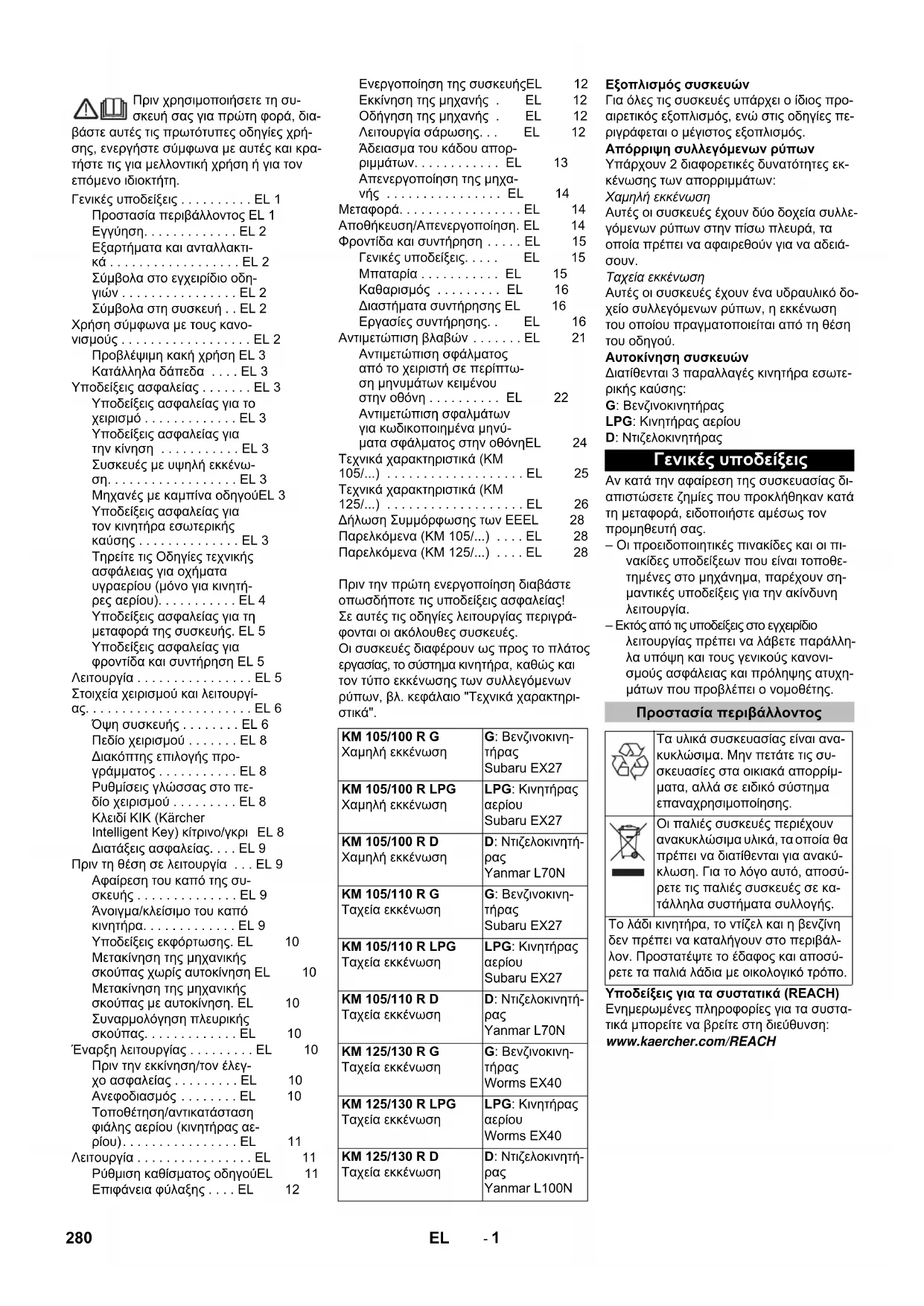 δείξεις εκφόρτωσης. EL 10 Μετακίνηση της μηχανικής σκούπας χωρίς αυτοκίνηση EL 10 Μετακίνηση της μηχανικής σκούπας με αυτοκίνηση. EL 10 Συναρμολόγηση πλευρικής σκούπας. . . . . . . . . . . . . EL 10 Έναρξη λειτουργίας . . . . . . . . . EL 10 Πριν την εκκίνηση/τον έλεγ- χο ασφαλείας . . . . . . . . . EL 10 Ανεφοδιασμός . . . . . . . . EL 10 Τοποθέτηση/αντικατάσταση φιάλης αερίου (κινητήρας αε- ρίου). . . . . . . . . . . . . . . . EL 11 Λειτουργία . . . . . . . . . . . . . . . . EL 11 Ρύθμιση καθίσματος οδηγούEL 11 Επιφάνεια φύλαξης . . . . EL 12 Ενεργοποίηση της συσκευήςEL 12 Εκκίνηση της μηχανής . EL 12 Οδήγηση της μηχανής . EL 12 Λειτουργία σάρωσης. . . EL 12 Άδειασμα του κάδου απορ- ριμμάτων. . . . . . . . . . . . EL 13 Απενεργοποίηση της μηχα- νής . . . . . . . . . . . . . . . . EL 14 Μεταφορά. . . . . . . . . . . . . . . . . EL 14 Αποθήκευση/Απενεργοποίηση. EL 14 Φροντίδα και συντήρηση . . . . . EL 15 Γενικές υποδείξεις. . . . . EL 15 Μπαταρία . . . . . . . . . . . EL 15 Καθαρισμός . . . . . . . . . EL 16 Διαστήματα συντήρησης EL 16 Εργασίες συντήρησης. . EL 16 Αντιμετώπιση βλαβών . . . . . . . EL 21 Αντιμετώπιση σφάλματος από το χειριστή σε περίπτω- ση μηνυμάτων κειμένου στην οθόνη . . . . . . . . . . EL 22 Αντιμετώπιση σφαλμάτων για κωδικοποιημένα μηνύ- ματα σφάλματος στην οθόνηEL 24 Τεχνικά χαρακτηριστικά (KM 105/...) . . . . . . . . . . . . . . . . . . . EL 25 Τεχνικά χαρακτηριστικά (KM 125/...) . . . . . . . . . . . . . . . . . . . EL 26 Δήλωση Συμμόρφωσης των ΕEEL 28 Παρελκόμενα (KM 105/...) . . . . EL 28 Παρελκόμενα (KM 125/...) . . . . EL 28 KM 105/100 R G Χαμηλή εκκένωση G: Βενζινοκινη-