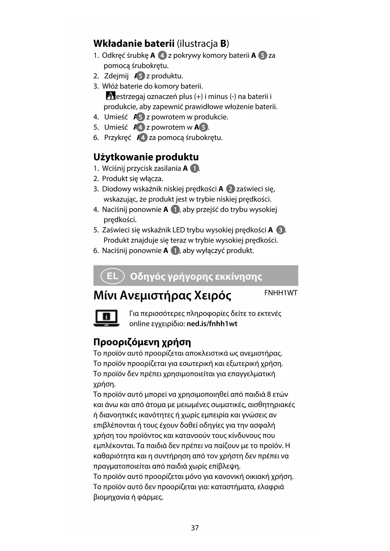 Οδηγός γρήγορης εκκίνησης Μίνι Ανεμιστήρας Χειρός FNHH1WTΓια περισσότερες πληροφορίες δείτε το εκτενές online εγχειρίδιο: ned.is/fnhh1wt Προοριζόμενη χρήση Το προϊόν αυτό προορίζεται αποκλειστικά ως ανεμιστήρας.Το προϊόν προορίζεται για εσωτερική και εξωτερική χρήση.Το προϊόν δεν πρέπει χρησιμοποιείται για επαγγελματική χρήση.Το προϊόν αυτό μπορεί να χρησιμοποιηθεί από παιδιά 8 ετών και άνω και από άτομα με μειωμένες σωματικές, αισθητηριακές ή διανοητικές ικανότητες ή χωρίς εμπειρία και γνώσεις αν επιβλέπονται ή τους έχουν δοθεί οδηγίες για την ασφαλή χρήση του προϊόντος και κατανοούν τους κίνδυνους που εμπλέκονται. Τα παιδιά δεν πρέπει να παίζουν με το προϊόν. Η καθαριότητα και η συντήρηση από τον χρήστη δεν πρέπει να πραγματοποιείται από παιδιά χωρίς επίβλεψη.Το προϊόν αυτό προορίζεται μόνο για κανονική οικιακή χρήση. Το προϊόν αυτό δεν προορίζεται για: καταστήματα, ελαφριά βιομηχανία ή φάρμες.38 Οποιαδήποτε τροποποίηση του προϊόντος μπορεί να έχει επιπτώσεις στην ασφάλεια, την εγγύηση και τη σωστή λειτουργία. Χαρακτηριστικά Προϊόν Μίνι Ανεμιστήρας Χειρός Αριθμός είδους FNHH1WT Διαστάσεις (μ x π x υ) 162 x 75 x 25 mm Βάρος 60 g χωρίς μπαταρίες Ισχύς 0,6 - 0,9 W Ρεύμα 180 - 270 mA Μπαταρία 2 x AA (δεν περιλαμβάνεται) Κύρια μέρη (εικόνα A) 1 Κουμπί ισχύος 2 Ένδειξη LED χαμηλής