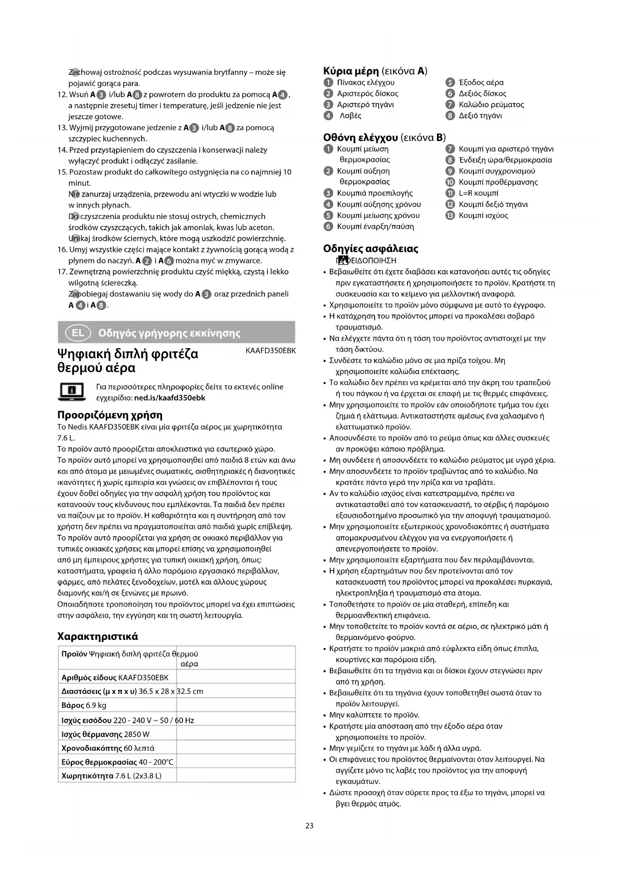 Οδηγός γρήγορης εκκίνησης Ψηφιακή διπλή φριτέζα θερμού αέρα KAAFD350EBKΓια περισσότερες πληροφορίες δείτε το εκτενές online εγχειρίδιο: ned.is/kaafd350ebk Προοριζόμενη χρήση Το Nedis KAAFD350EBK είναι μία φριτέζα αέρος με χωρητικότητα 7.6 L.Το προϊόν αυτό προορίζεται αποκλειστικά για εσωτερικό χώρο.Το προϊόν αυτό μπορεί να χρησιμοποιηθεί από παιδιά 8 ετών και άνω και από άτομα με μειωμένες σωματικές, αισθητηριακές ή διανοητικές ικανότητες ή χωρίς εμπειρία και γνώσεις αν επιβλέπονται ή τους έχουν δοθεί οδηγίες για την ασφαλή χρήση του προϊόντος και κατανοούν τους κίνδυνους που εμπλέκονται. Τα παιδιά δεν πρέπει να παίζουν με το προϊόν. Η καθαριότητα και η συντήρηση από τον χρήστη δεν πρέπει να πραγματοποιείται από παιδιά χωρίς επίβλεψη.Το προϊόν αυτό προορίζεται για χρήση σε οικιακό περιβάλλον για τυπικές οικιακές χρήσεις και μπορεί επίσης να χρησιμοποιηθεί από μη έμπειρους χρήστες για τυπική οικιακή χρήση, όπως: καταστήματα, γραφεία ή άλλo παρόμοιο εργασιακό περιβάλλον, φάρμες, από πελάτες ξενοδοχείων, μοτέλ και άλλους χώρους διαμονής και/ή σε ξενώνες με πρωινό.Οποιαδήποτε τροποποίηση του προϊόντος μπορεί να έχει επιπτώσεις στην ασφάλεια, την εγγύηση και τη σωστή λειτουργία. Χαρακτηριστικά Προϊόν Ψηφιακή διπλή φριτέζα θερμού Αριθμός είδους KAAFD350EBKΔιαστάσεις (μ x π x υ) 36.5 x 28 x 32.5 cmΒάρος 6.9 kgΙσχύς εισόδου 220 - 240 V ~ 50 / 60 HzΙσχύς θέρμανσης 2850 WΧρονοδιακόπτης 60 λεπτάΕύρος θερμοκρασίας 40 - 200°CΧωρητικότητα 7.6 L (2x3.8 L)24