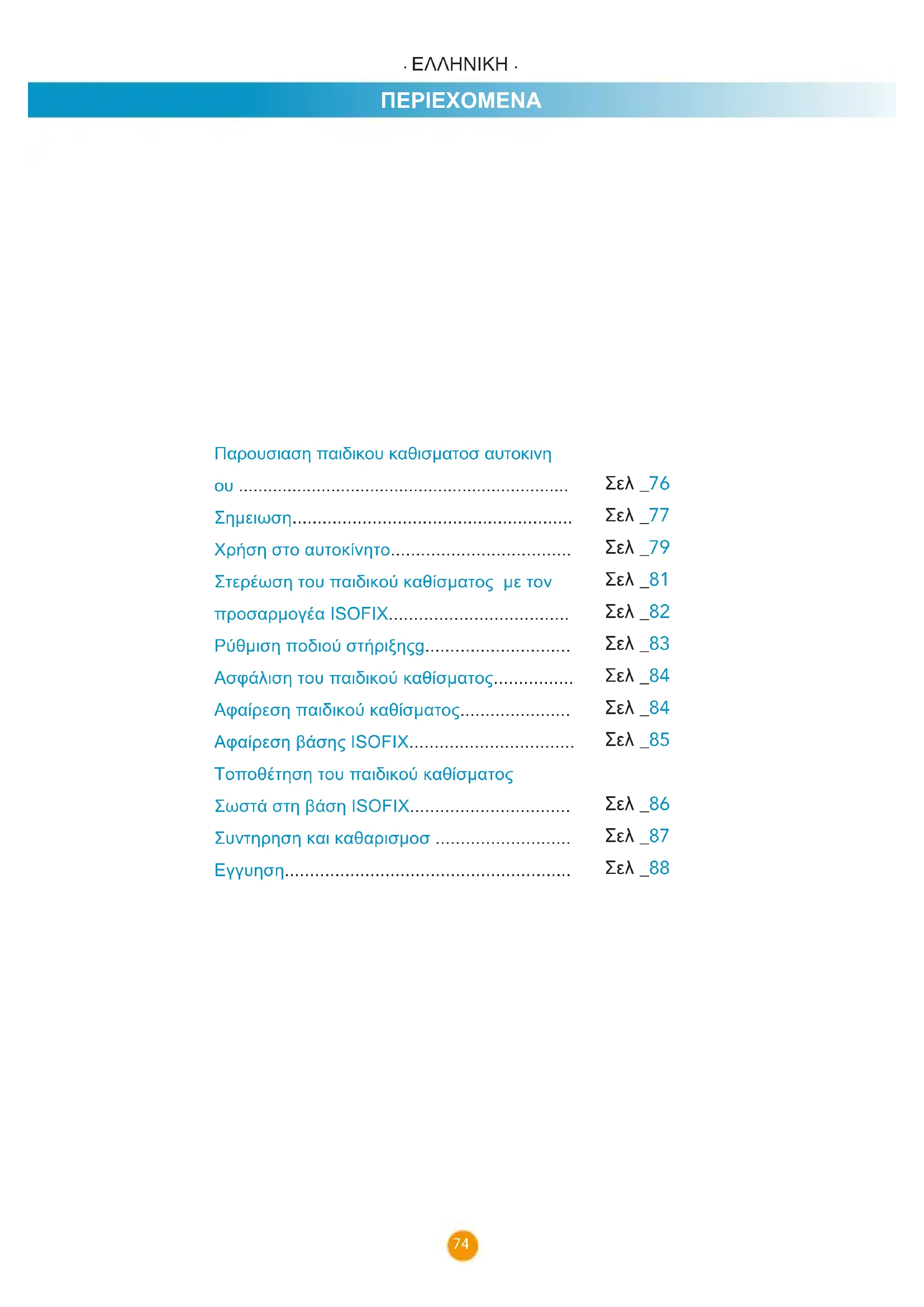 ΠΕΡΙΕΧΟΜΕΝΑ Παρουσιαση παιδικου καθισματοσ αυτοκινη ου .................................................................... Σημειωση........................................................ Χρήση στο αυτοκίνητο.................................... Στερέωση του παιδικού καθίσματος με τον προσαρμογέα ISOFIX.................................... Ρύθμιση ποδιού στήριξηςg............................. Ασφάλιση του παιδικού καθίσματος................ Αφαίρεση παιδικού καθίσματος...................... Αφαίρεση βάσης ISOFIX................................. Τοποθέτηση του παιδικού καθίσματος Σωστά στη βάση ISOFIX................................ Συντηρηση και καθαρισμοσ ........................... Εγγυηση......................................................... Σελ _76 Σελ _77 Σελ _79 Σελ _81 Σελ _82 Σελ _83 Σελ _84 Σελ _84 Σελ _85 Σελ _86 Σελ _87 Σελ _88• ΕΛΛΗΝΙΚΗ •