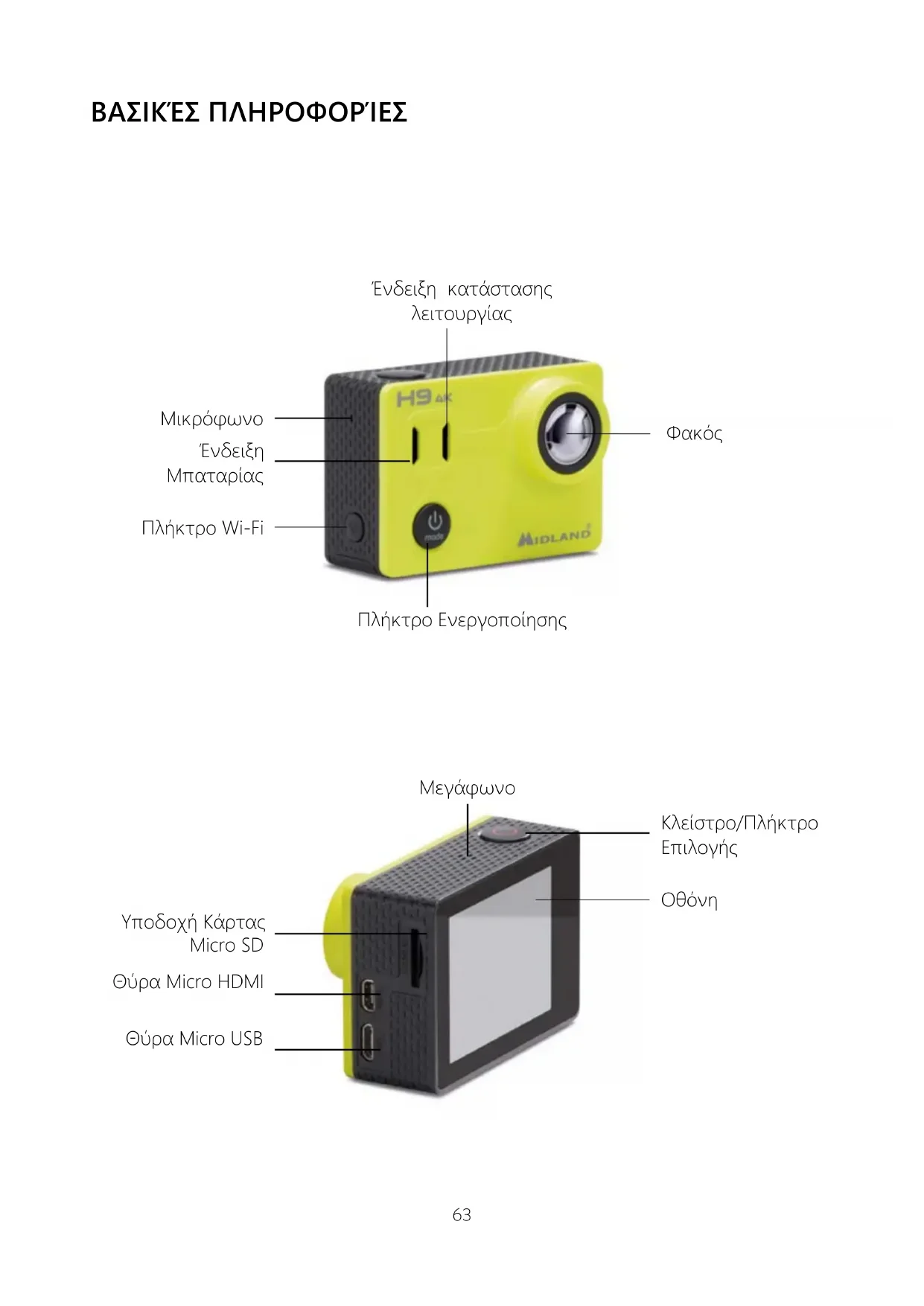 - Σύνδεση του προϊόντος με εξοπλισμό που δεν είναι συμβατός ή εγκεκριμένος από την Midland. • Ζημιές που προκαλούνται ενδεικτικά από ακραίες συνθήκες, αστραπές, νερό ή υγρασία, φωτιά, λάθος τάσεις του δικτύου παροχής ρεύματος ή οποιοδήποτε λόγο που είναι πέραν από τον έλεγχο του Αντιπροσώπου. 7. Η εγγύηση προσφέρεται σε οποιοδήποτε άτομο κατέχει νόμιμα το προϊόν μέσα στο χρόνο διάρκειάς της. 8. Η εγγύηση αποτελεί την πλήρη αποζημίωση του αγοραστή. Η CTE International Srl. και ο Αντιπρόσωπος Cobra Center Ltd. δεν ευθύνονται για οποιαδήποτε άλλη ζημιά εκτός από την επισκευή ή αντικατάσταση κατά τα ως άνω, που να σχετίζεται άμεσα ή έμμεσα με τη δυσλειτουργία του προϊόντος.73 ΤΕΧΝΊΚΆ ΧΑΡΑΚΤΗΡΊΣΤΊΚΆ › Βίντεο: 4K@30fps, 2.7@30fps, 1080p@30/60fps, 720@120fps MOV format › Φωτοραφία: 14 MP αρχεία τύπου jpg › Φακός : 170 ο › Σύνδεση Wi-Fi › Αδιάβροχη: σε βάθος εώς 30m, με τη χρήση της αδιάβροχης θήκης › Έγχρωμη LCD οθόνη 2” › Ενσωματωμένο μικρόφωνο και μεγάφωνο › Τρόποι λειτουργίας: Βίντεο (Video)/Φωτογραφική Μηχανή (Photo)/Λειτουργία Διαδοχικών Λήψεων (Time Lapse)/Αναπαραγωγή (Playback) › Πολύγλωσσο Μενού: Αγγλικά (Ε)/Γερμανικά (DE)/ Ιταλικά (ΙΤ)/ Ισπανικά (ES)/ Πορτογαλικά (PΤ)/ Γαλλικά (FR)/ Τσεχικά (CΖ)/ Πολωνικά (PL)/ Ρωσικά (RU)/ Ιαπωνικά (JP), Ολλανδικά (DU)/ Φιλανδικά (FIN)/ Δανέζικα (DK)/ Σουηδικά (SW)/ Νορβηγικά (NW)/ Ουγγρικά (HU)/ Σλαβικά (SL)/ Ελληνικά (GR) › Συνδέσεις: micro USB 2.0 & micro HDMI › Κάρτα Μνήμης: Micro SD class 10 έως 64GB › Μπαταρία Λιθίου 1050mAh › Διαστάσεις: 58x29x40mm › Βάρος: 65gr (χωρίς τη μπαταρία). Τα χαρακτηριστικά μπορεί να αλλάξουν χωρίς πρότερη ειδοποίηση.74