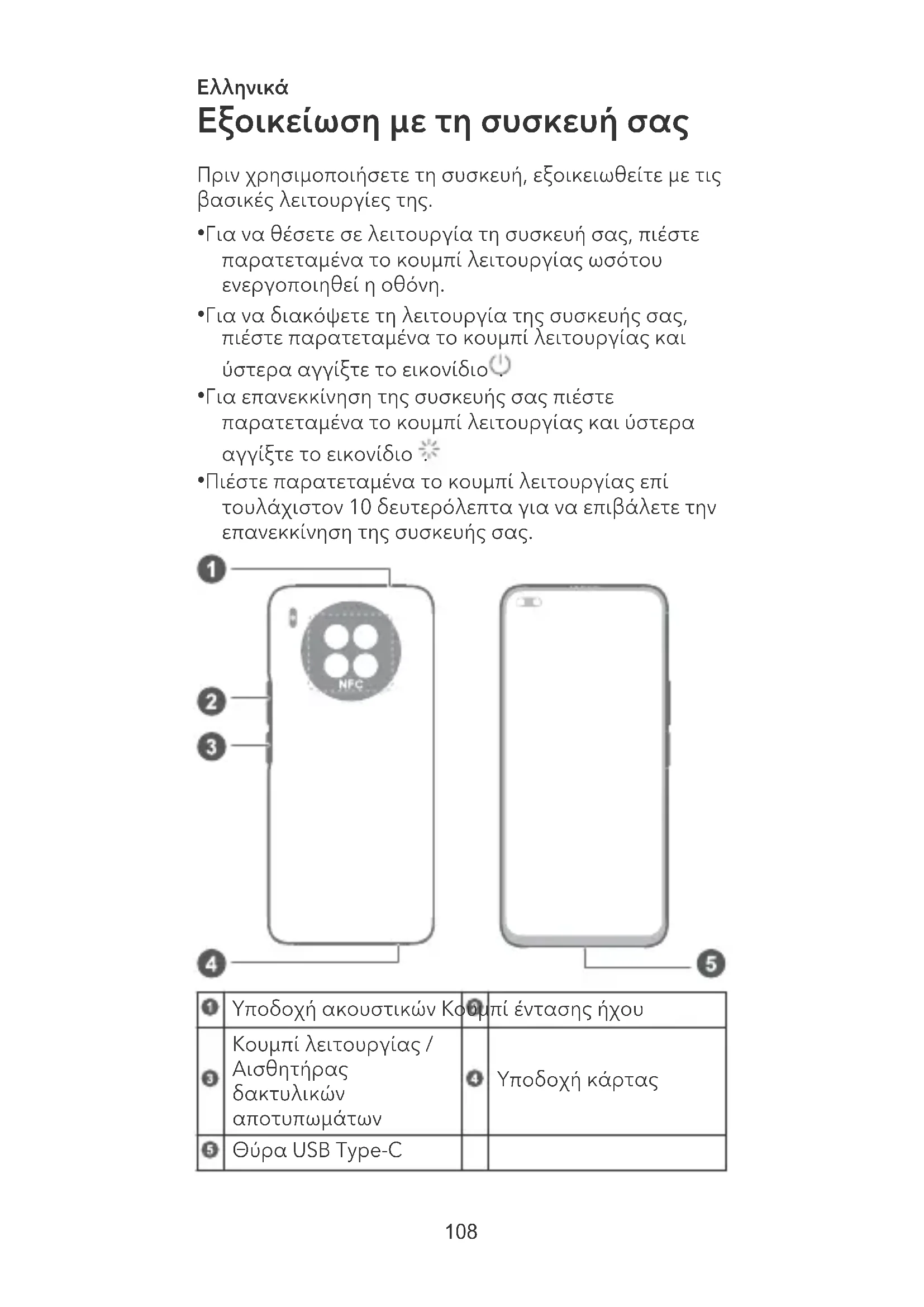 αποτυπωμάτων Υποδοχή κάρτας Θύρα USB Type-C 108• Κατά τη χρήση της λειτουργίας NFC πρέπει να φέρνετε και να κρατάτε την περιοχή NFC κοντά σε άλλες συσκευές ή άλλα αντικείμενα.