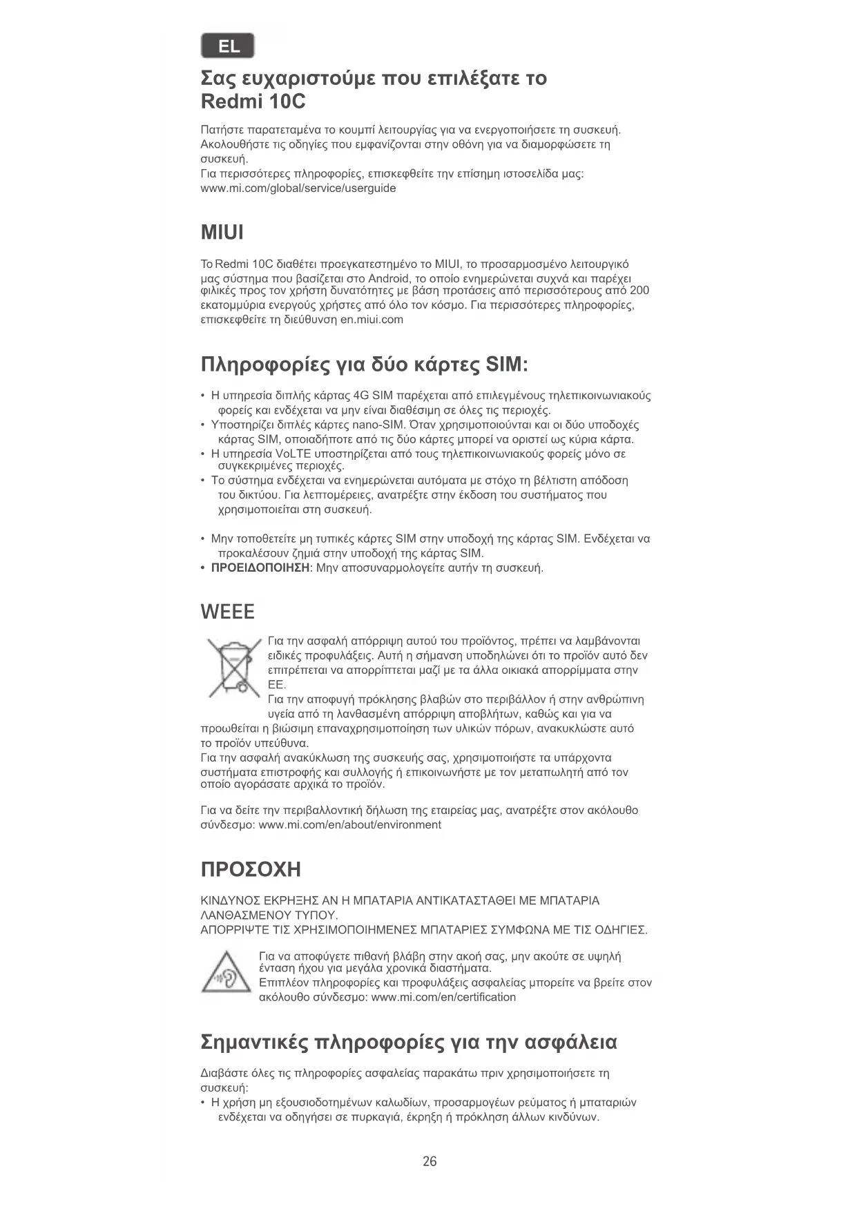 ΚΙΝΔΥΝΟΣ ΕΚΡΗΞΗΣ ΑΝ Η ΜΠΑΤΑΡΙΑ ΑΝΤΙΚΑΤΑΣΤΑΘΕΙ ΜΕ ΜΠΑΤΑΡΙΑ ΛΑΝΘΑΣΜΕΝΟΥ ΤΥΠΟΥ. ΑΠΟΡΡΙΨΤΕ ΤΙΣ ΧΡΗΣΙΜΟΠΟΙΗΜΕΝΕΣ ΜΠΑΤΑΡΙΕΣ ΣΥΜΦΩΝΑ ΜΕ ΤΙΣ ΟΔΗΓΙΕΣ. Για να αποφύγετε πιθανή βλάβη στην ακοή σας, μην ακούτε σε υψηλή ένταση ήχου για μεγάλα χρονικά διαστήματα. Επιπλέον πληροφορίες και προφυλάξεις ασφαλείας μπορείτε να βρείτε στον ακόλουθο σύνδεσμο: www.mi.com/en/certication Σημαντικές πληροφορίες για την ασφάλεια Διαβάστε όλες τις πληροφορίες ασφαλείας παρακάτω πριν χρησιμοποιήσετε τη