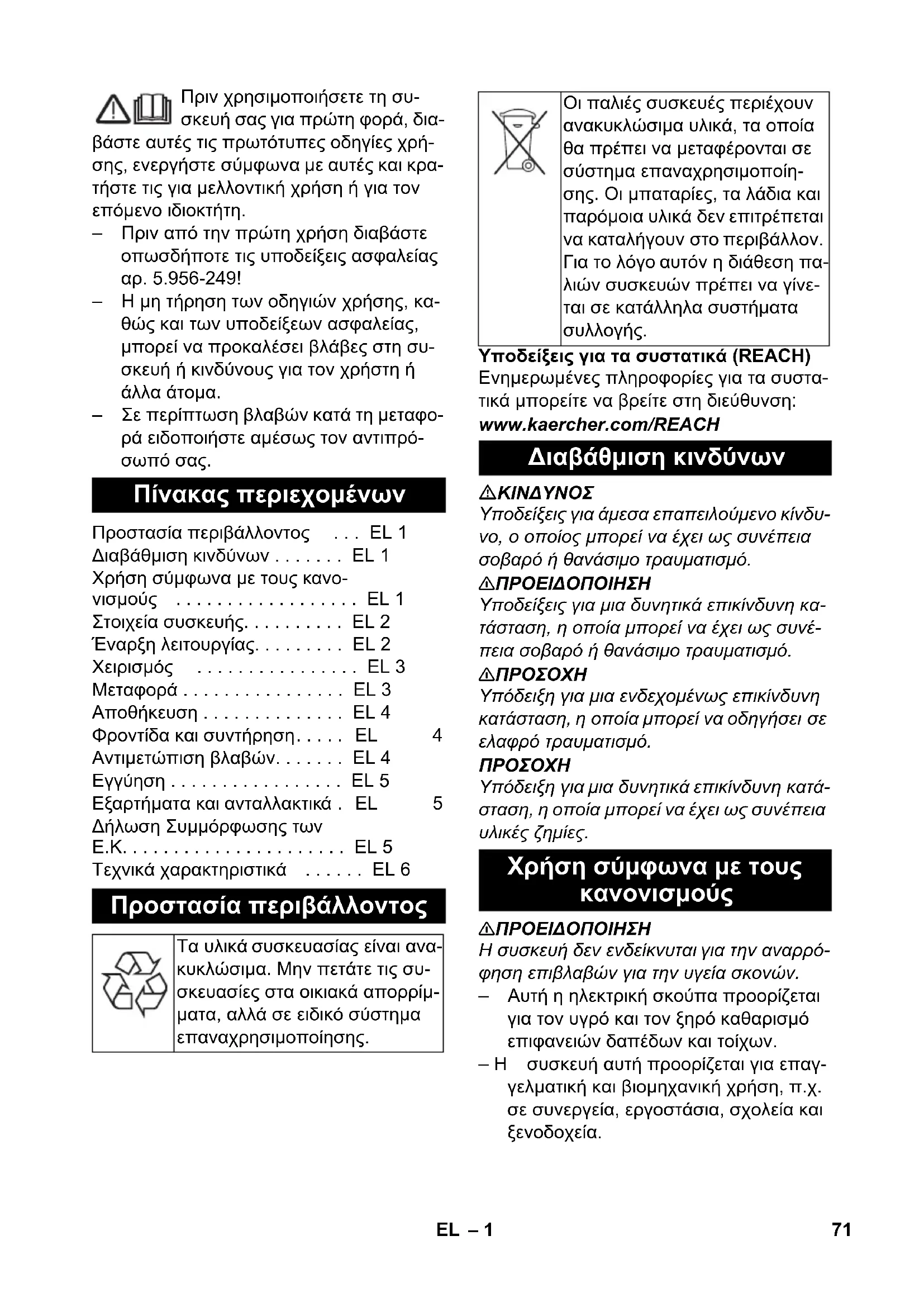 Υποδείξεις για τα συστατικά (REACH) Ενημερωμένες πληροφορίες για τα συστα- τικά μπορείτε να βρείτε στη διεύθυνση: www.kaercher.com/REACH