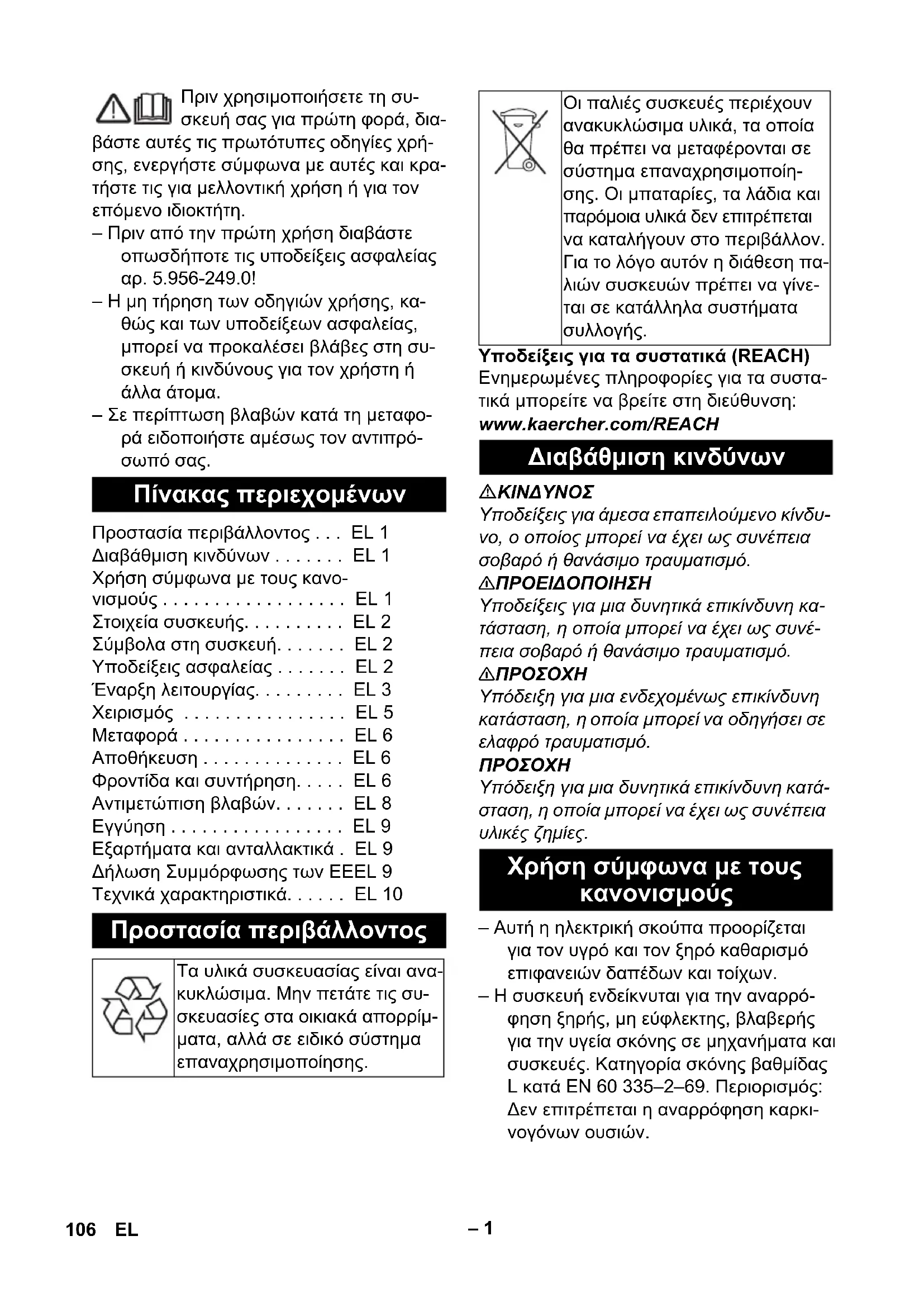 Υπόδειξη για μια δυνητικά επικίνδυνη κατά- σταση, η οποία μπορεί να έχει ως συνέπεια υλικές ζημίες. – Αυτή η ηλεκτρική σκούπα προορίζεται για τον υγρό και τον ξηρό καθαρισμό επιφανειών δαπέδων και τοίχων. – Η συσκευή ενδείκνυται για την αναρρό- φηση ξηρής, μη εύφλεκτης, βλαβερής για την υγεία σκόνης σε μηχανήματα και συσκευές. Κατηγορία σκόνης βαθμίδας L κατά EN 60 335–2–69. Περιορισμός: Δεν επιτρέπεται η αναρρόφηση καρκι- νογόνων ουσιών. Πίνακας περιεχομένων Προστασία περιβάλλοντος . . . EL 1 Διαβάθμιση κινδύνων . . . . . . . EL 1 Χρήση σύμφωνα με τους κανο- νισμούς . . . . . . . . . . . . . . . . . . EL 1 Στοιχεία συσκευής. . . . . . . . . . EL 2 Σύμβολα στη συσκευή. . . . . . . EL 2 Υποδείξεις ασφαλείας . . . . . . . EL 2 Έναρξη λειτουργίας. . . . . . . . . EL 3 Χειρισμός . . . . . . . . . . . . . . . . EL 5 Μεταφορά . . . . . . . . . . . . . . . . EL 6 Αποθήκευση . . . . . . . . . . . . . . EL 6 Φροντίδα και συντήρηση. . . . . EL 6 Αντιμετώπιση βλαβών. . . . . . . EL 8 Εγγύηση . . . . . . . . . . . . . . . . . EL 9 Εξαρτήματα και ανταλλακτικά . EL 9 Δήλωση Συμμόρφωσης των ΕEEL 9 Τεχνικά χαρακτηριστικά. . . . . . EL 10 Προστασία περιβάλλοντος Τα υλικά συσκευασίας είναι ανα- κυκλώσιμα. Μην πετάτε τις συ- σκευασίες στα οικιακά απορρίμ- ματα, αλλά σε ειδικό σύστημα επαναχρησιμοποίησης. Οι παλιές συσκευές περιέχουν ανακυκλώσιμα υλικά, τα οποία θα πρέπει να μεταφέρονται σε σύστημα επαναχρησιμοποίη- σης. Οι μπαταρίες, τα λάδια και παρόμοια υλικά δεν επιτρέπεται να καταλήγουν στο περιβάλλον. Για το λόγο αυτόν η διάθεση πα- λιών συσκευών πρέπει να γίνε- ται σε κατάλληλα συστήματα