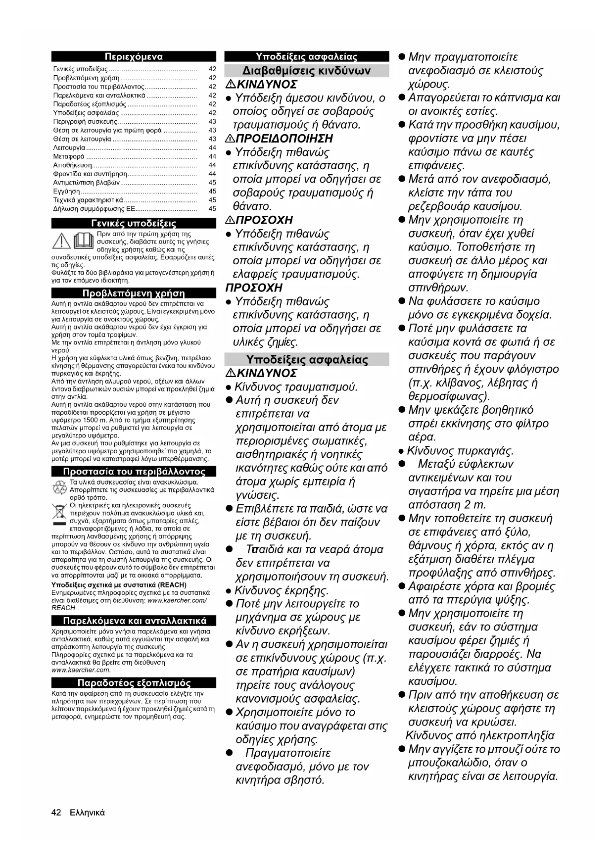 ή θέρμανσης απαγορεύεται ένεκα του κινδύνου πυρκαγιάς και έκρηξης. Από την άντληση αλμυρού νερού, οξέων και άλλων έντονα διαβρωτικών ουσιών μπορεί να προκληθεί ζημιά στην αντλία. Αυτή η αντλία ακάθαρτου νερού στην κατάσταση που παραδίδεται προορίζεται για χρήση σε μέγιστο υψόμετρο 1500 m. Από το τμήμα εξυπηρέτησης πελατών μπορεί να ρυθμιστεί για λειτουργία σε μεγαλύτερο υψόμετρο. Αν μια συσκευή που ρυθμίστηκε για λειτουργία σε μεγαλύτερο υψόμετρο χρησιμοποιηθεί πιο χαμηλά, το μοτέρ μπορεί να καταστραφεί λόγω υπερθέρμανσης. Προστασία του περιβάλλοντος Τα υλικά συσκευασίας είναι ανακυκλώσιμα. Απορρίπτετε τις συσκευασίες με περιβαλλοντικά ορθό τρόπο. Οι ηλεκτρικές και ηλεκτρονικές συσκευές περιέχουν πολύτιμα ανακυκλώσιμα υλικά και, συχνά, εξαρτήματα όπως μπαταρίες απλές, επαναφορτιζόμενες ή λάδια, τα οποία σε περίπτωση λανθασμένης χρήσης ή απόρριψης μπορούν να θέσουν σε κίνδυνο την ανθρώπινη υγεία και το περιβάλλον. Ωστόσο, αυτά τα συστατικά είναι απαραίτητα για τη σωστή λειτουργία της συσκευής. Οι συσκευές που φέρουν αυτό το σύμβολο δεν επιτρέπεται να απορρίπτονται μαζί με τα οικιακά απορρίμματα. Υποδείξεις σχετικά με συστατικά (REACH) Ενημερωμένες πληροφορίες σχετικά με τα συστατικά είναι διαθέσιμες στη διεύθυνση: www.kaercher.com/ REACH Παρελκόμενα και ανταλλακτικά Χρησιμοποιείτε μόνο γνήσια παρελκόμενα και γνήσια ανταλλακτικά, καθώς αυτά εγγυώνται την ασφαλή και απρόσκοπτη λειτουργία της συσκευής. Πληροφορίες σχετικά με τα παρελκόμενα και τα ανταλλακτικά θα βρείτε στη διεύθυνση www.kaercher.com. Παραδοτέος εξοπλισμός Κατά την αφαίρεση από τη συσκευασία ελέγξτε την πληρότητα των περιεχομένων. Σε περίπτωση που λείπουν παρελκόμενα ή έχουν προκληθεί ζημιές κατά τη μεταφορά, ενημερώστε τον προμηθευτή σας. Υποδείξεις ασφαλείας Διαβαθμίσεις κινδύνων