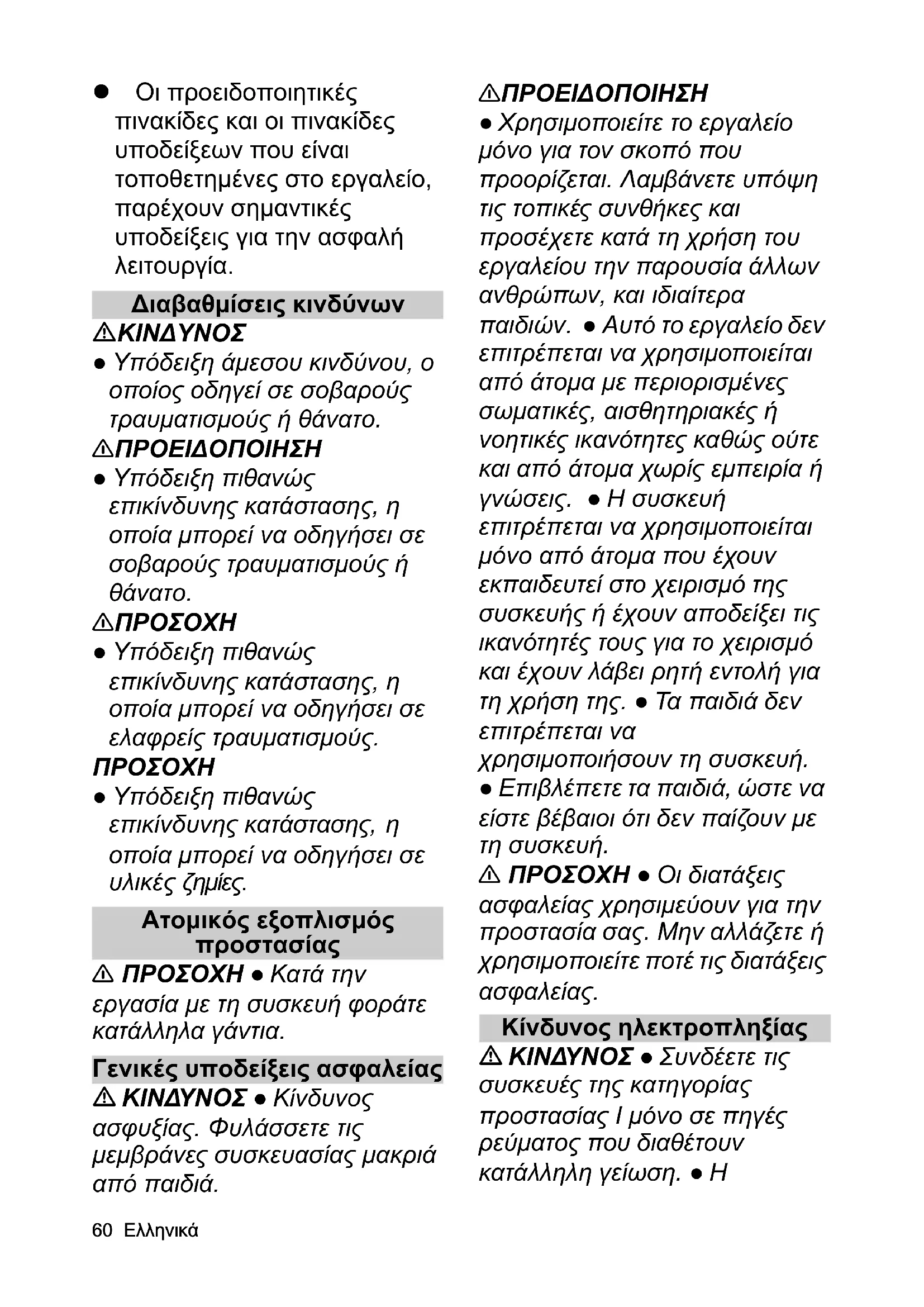 몇 ΠΡΟΣΟΧΗ ● Κατά την εργασία με τη συσκευή φοράτε κατάλληλα γάντια. Γενικές υποδείξεις ασφαλείας ΚΙΝΔΥΝΟΣ ● Κίνδυνος ασφυξίας. Φυλάσσετε τις μεμβράνες συσκευασίας μακριά από παιδιά. 몇 ΠΡΟΕΙΔΟΠΟΙΗΣΗ ● Χρησιμοποιείτε το εργαλείο μόνο για τον σκοπό που προορίζεται. Λαμβάνετε υπόψη τις τοπικές συνθήκες και προσέχετε κατά τη χρήση του εργαλείου την παρουσία άλλων ανθρώπων, και ιδιαίτερα παιδιών. ● Αυτό το εργαλείο δεν επιτρέπεται να χρησιμοποιείται από άτομα με περιορισμένες σωματικές, αισθητηριακές ή νοητικές ικανότητες καθώς ούτε
