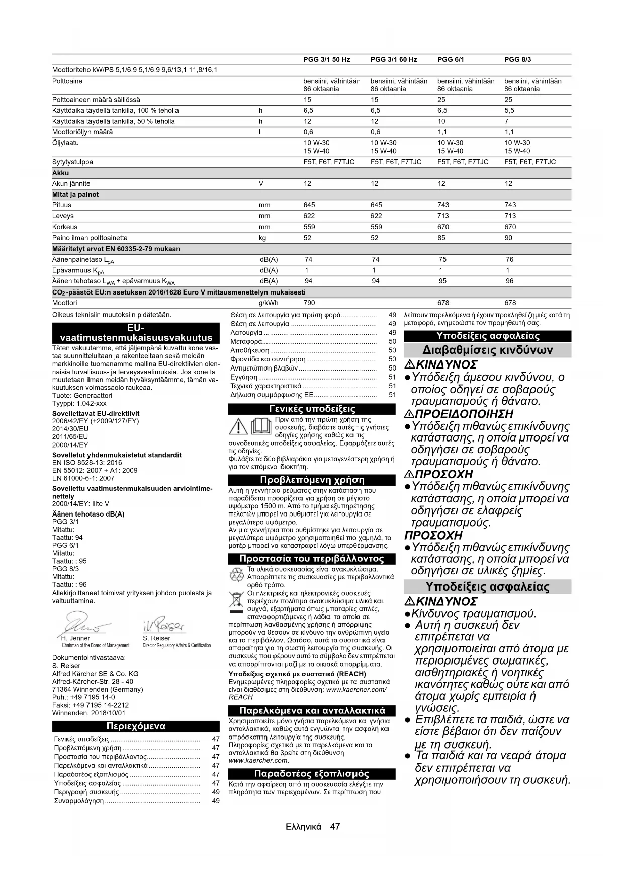 EN 55012: 2007 + A1: 2009 EN 61000-6-1: 2007 Sovellettu vaatimustenmukaisuuden arviointime- nettely 2000/14/EY: liite V Äänen tehotaso dB(A) PGG 3/1 Mitattu: Taattu: 94 PGG 6/1 Mitattu: Taattu: : 95 PGG 8/3 Mitattu: Taattu: : 96 Allekirjoittaneet toimivat yrityksen johdon puolesta ja valtuuttamina. Dokumentointivastaava: S. Reiser Alfred Kärcher SE & Co. KG Alfred-Kärcher-Str. 28 - 40 71364 Winnenden (Germany) Puh.: +49 7195 14-0 Faksi: +49 7195 14-2212 Winnenden, 2018/10/01 Περιεχόμενα Γενικές υποδείξεις Πριν από την πρώτη χρήση της συσκευής, διαβάστε αυτές τις γνήσιες οδηγίες χρήσης καθώς και τις συνοδευτικές υποδείξεις ασφαλείας. Εφαρμόζετε αυτές τις οδηγίες. Φυλάξτε τα δύο βιβλιαράκια για μεταγενέστερη χρήση ή για τον επόμενο ιδιοκτήτη. Προβλεπόμενη χρήση Αυτή η γεννήτρια ρεύματος στην κατάσταση που παραδίδεται προορίζεται για χρήση σε μέγιστο υψόμετρο 1500 m. Από το τμήμα εξυπηρέτησης πελατών μπορεί να ρυθμιστεί για λειτουργία σε μεγαλύτερο υψόμετρο. Αν μια γεννήτρια που ρυθμίστηκε για λειτουργία σε μεγαλύτερο υψόμετρο χρησιμοποιηθεί πιο χαμηλά, το μοτέρ μπορεί να καταστραφεί λόγω υπερθέρμανσης. Προστασία του περιβάλλοντος Τα υλικά συσκευασίας είναι ανακυκλώσιμα. Απορρίπτετε τις συσκευασίες με περιβαλλοντικά ορθό τρόπο. Οι ηλεκτρικές και ηλεκτρονικές συσκευές περιέχουν πολύτιμα ανακυκλώσιμα υλικά και, συχνά, εξαρτήματα όπως μπαταρίες απλές, επαναφορτιζόμενες ή λάδια, τα οποία σε περίπτωση λανθασμένης χρήσης ή απόρριψης μπορούν να θέσουν σε κίνδυνο την ανθρώπινη υγεία και το περιβάλλον. Ωστόσο, αυτά τα συστατικά είναι απαραίτητα για τη σωστή λειτουργία της συσκευής. Οι συσκευές που φέρουν αυτό το σύμβολο δεν επιτρέπεται να απορρίπτονται μαζί με τα οικιακά απορρίμματα. Υποδείξεις σχετικά με συστατικά (REACH) Ενημερωμένες πληροφορίες σχετικά με τα συστατικά είναι διαθέσιμες στη διεύθυνση: www.kaercher.com/ REACH Παρελκόμενα και ανταλλακτικά Χρησιμοποιείτε μόνο γνήσια παρελκόμενα και γνήσια ανταλλακτικά, καθώς αυτά εγγυώνται την ασφαλή και απρόσκοπτη λειτουργία της συσκευής. Πληροφορίες σχετικά με τα παρελκόμενα και τα ανταλλακτικά θα βρείτε στη διεύθυνση www.kaercher.com. Παραδοτέος εξοπλισμός Κατά την αφαίρεση από τη συσκευασία ελέγξτε την πληρότητα των περιεχομένων. Σε περίπτωση που λείπουν παρελκόμενα ή έχουν προκληθεί ζημιές κατά τη μεταφορά, ενημερώστε τον προμηθευτή σας. Υποδείξεις ασφαλείας Διαβαθμίσεις κινδύνων