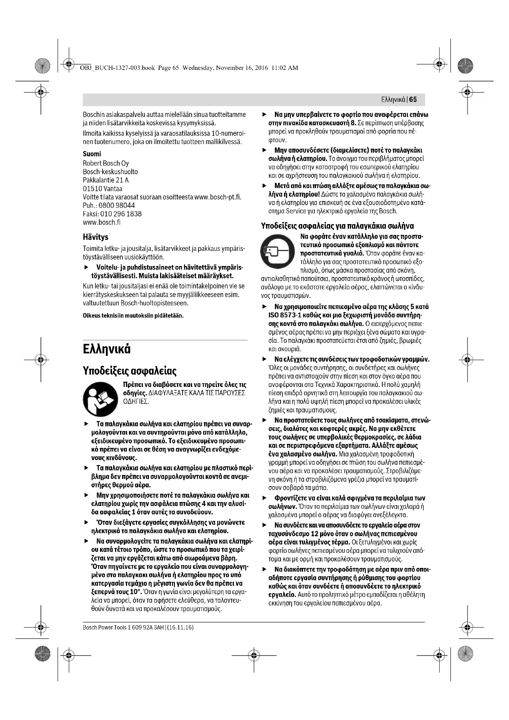 Μην αποσυνδέσετε (διαμελίσετε) ποτέ το παλαγκάκι σωλήνα ή ελατηρίου. Το άνοιγμα του περιβλήματος μπορεί να οδηγήσει στην καταστροφή του εσωτερικού ελατηρίου και σε αχρήστευση του παλαγκακιού σωλήνα ή ελατηρίου. Μετά από και πτώση αλλάξτε αμέσως τα παλαγκάκια σω- λήνα ή ελατηρίου! Δώστε τα χαλασμένα παλαγκάκια σωλή- να ή ελατηρίου για επισκευή σε ένα εξουσιοδοτημένο κατά- στημα Service για ηλεκτρικά εργαλεία της Bosch. Υποδείξεις ασφαλείας για παλαγκάκια σωλήνα Να φοράτε έναν κατάλληλο για σας προστα- τευτικό προσωπικό εξοπλισμό και πάντοτε προστατευτικά γυαλιά. Όταν φοράτε έναν κα- τάλληλο για σας προστατευτικό προσωπικό εξο- πλισμό, όπως μάσκα προστασίας από σκόνη, αντιολισθητικά παπούτσια, προστατευτικό κράνος ή ωτασπίδες, ανάλογα με το εκάστοτε εργαλείο αέρος, ελαττώνεται ο κίνδυ- νος τραυματισμών. Να χρησιμοποιείτε πεπιεσμένο αέρα της κλάσης 5 κατά ISO 8573-1 καθώς και μια ξεχωριστή μονάδα συντήρη- σης κοντά στο παλαγκάκι σωλήνα. Ο εισερχόμενος πεπιε- σμένος αέρας πρέπει να μην περιέχει ξένα σώματα και υγρα- σία. Το παλαγκάκι προστατεύεται έτσι από ζημιές, βρωμιές και σκουριά. Να ελέγχετε τις συνδέσεις των τροφοδοτικών γραμμών. Όλες οι μονάδες συντήρησης, οι συνδετήρες και σωλήνες πρέπει να αντιστοιχούν στην πίεση και στον όγκο αέρα που αναφέρονται στα Τεχνικά Χαρακτηριστικά. Η πολύ χαμηλή πίεση επιδρά αρνητικά στη λειτουργία του παλαγκακιού σω- λήνα και η πολύ υψηλή πίεση μπορεί να προκαλέσει υλικές ζημιές και τραυματισμους. Να προστατεύετε τους σωλήνες από τσακίσματα, στενώ- σεις, διαλύτες και κοφτερές ακμές. Να μην εκθέτετε τους σωλήνες σε υπερβολικές θερμοκρασίες, σε λάδια και σε περιστρεφόμενα εξαρτήματα. Αλλάξτε αμέσως ένα χαλασμένο σωλήνα. Μια χαλασμένη τροφοδοτική γραμμή μπορεί να οδηγήσει σε πτώση του σωλήνα πεπιεσμέ- νου αέρα και να προκαλέσει τραυματισμούς. Στροβιλιζόμε- νη σκόνη ή τα στροβιλιζόμενα γρέζια μπορεί να τραυματί- σουν σοβαρά τα μάτια. Φροντίζετε να είναι καλά σφιγμένα τα περιλαίμια των σωλήνων. Όταν τα περιλαίμια των σωλήνων είναι χαλαρά ή χαλασμένα μπορεί ο αέρας να διαφύγει ανεξέλεγκτα. Να συνδέετε και να αποσυνδέετε το εργαλείο αέρα στον ταχυσύνδεσμο 12 μόνο όταν ο σωλήνας πεπιεσμένου αέρα είναι τυλιγμένος τέρμα. Οι ξετυλιγμένοι και χωρίς φορτίο σωλήνες πεπιεσμένου αέρα μπορεί να τυλιχτούν από- τομα και με ορμή και προκαλέσουν τραυματισμούς. Να διακόπτετε την τροφοδότηση με αέρα πριν από οποι- αδήποτε εργασία συντήρησης ή ρύθμισης του φορτίου καθώς και όταν συνδέετε ή αποσυνδέετε το ηλεκτρικό εργαλείο. Αυτό το προληπτικό μέτρο εμποδίζεται η αθέλητη εκκίνηση του εργαλείου πεπιεσμένου αέρα. OBJ_BUCH-1327-003.book Page 65 Wednesday, November 16, 2016 11:02 AM66 | Ελληνικά 1 609 92A 3AH | (16.11.16) Bosch Power Tools Να ελέγχετε καθημερινά την ανάρτηση και την ασφά- λεια πτώσης μήπως παρουσιάζουν ζημιές ή σκουριές. Το παλαγκάκι και ιδιαίτερα ο σωλήνας πεπιεσμένου αέρα πρέπει να ελέγχονται από έναν ειδικό τουλάχιστον μια φορά ετησίως σύμφωνα με τις εθνικές διατάξεις της εκάστοτε χώρας. Το παλαγκάκι σωλήνα δεν επιτρέπεται να χρησιμοποιηθεί πλέον όταν έχει υποστεί κάποια βλάβη. Υποδείξεις ασφαλείας για παλαγκάκια ελατηρίου Να μην χρησιμοποιείτε το παλαγκάκι ελατηρίου σα γερα- νό. Η χρήση του παλαγκακιού ελατηρίου σα γερανό μπορεί να προκαλέσει υλικές ζημιές και τραυματισμούς. Η ανάρτηση του φορτίου πρέπει να διεξάγεται μόνο όταν το συρματόσχοινο είνα