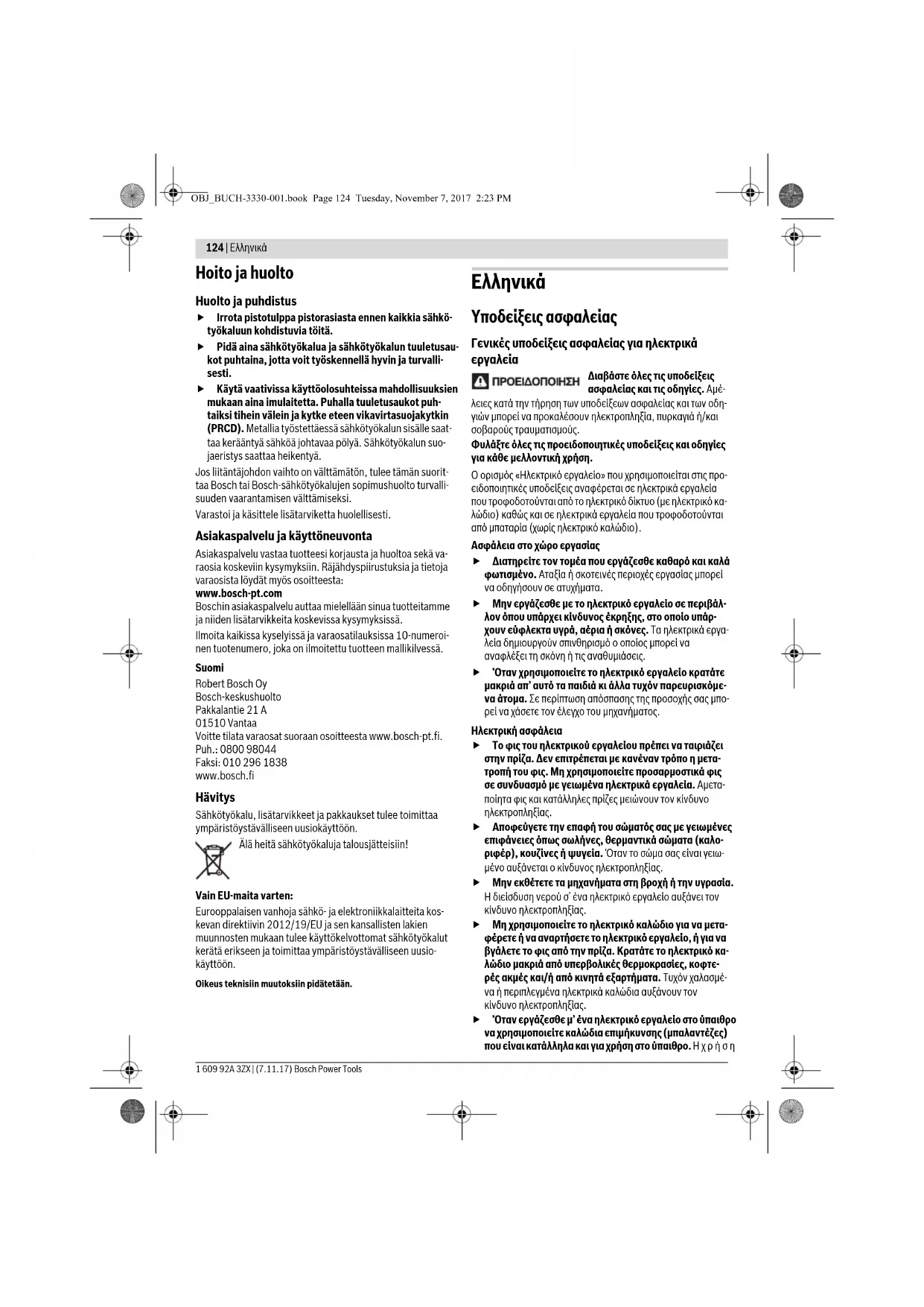 Διαβάστε όλες τις υποδείξεις ασφαλείας και τις οδηγίες. Αμέ- λειες κατά την τήρηση των υποδείξεων ασφαλείας και των οδη- γιών μπορεί να προκαλέσουν ηλεκτροπληξία, πυρκαγιά ή/και σοβαρούς τραυματισμούς. Φυλάξτε όλες τις προειδοποιητικές υποδείξεις και οδηγίες για κάθε μελλοντική χρήση. Ο ορισμός «Ηλεκτρικό εργαλείο» που χρησιμοποιείται στις προ- ειδοποιητικές υποδείξεις αναφέρεται σε ηλεκτρικά εργαλεία που τροφοδοτούνται από το ηλεκτρικό δίκτυο (με ηλεκτρικό κα- λώδιο) καθώς και σε ηλεκτρικά εργαλεία που τροφοδοτούνται από μπαταρία (χωρίς ηλεκτρικό καλώδιο). Ασφάλεια στο χώρο εργασίας Διατηρείτε τον τομέα που εργάζεσθε καθαρό και καλά φωτισμένο. Αταξία ή σκοτεινές περιοχές εργασίας μπορεί να οδηγήσουν σε ατυχήματα. Μην εργάζεσθε με το ηλεκτρικό εργαλείο σε περιβάλ- λον όπου υπάρχει κίνδυνος έκρηξης, στο οποίο υπάρ- χουν εύφλεκτα υγρά, αέρια ή σκόνες. Τα ηλεκτρικά εργα- λεία δημιουργούν σπινθηρισμό ο οποίος μπορεί να αναφλέξει τη σκόνη ή τις αναθυμιάσεις. Όταν χρησιμοποιείτε το ηλεκτρικό εργαλείο κρατάτε μακριά απ’ αυτό τα παιδιά κι άλλα τυχόν παρευρισκόμε- να άτομα. Σε περίπτωση απόσπασης της προσοχής σας μπο- ρεί να χάσετε τον έλεγχο του μηχανήματος. Ηλεκτρική ασφάλεια Το φις του ηλεκτρικού εργαλείου πρέπει να ταιριάζει στην πρίζα. Δεν επιτρέπεται με κανέναν τρόπο η μετα- τροπή του φις. Μη χρησιμοποιείτε προσαρμοστικά φις σε συνδυασμό με γειωμένα ηλεκτρικά εργαλεία. Αμετα- ποίητα φις και κατάλληλες πρίζες μειώνουν τον κίνδυνο ηλεκτροπληξίας. Αποφεύγετε την επαφή του σώματός σας με γειωμένες επιφάνειες όπως σωλήνες, θερμαντικά σώματα (καλο- ριφέρ), κουζίνες ή ψυγεία. Όταν το σώμα σας είναι γειω- μένο αυξάνεται ο κίνδυνος ηλεκτροπληξίας. Μην εκθέτετε τα μηχανήματα στη βροχή ή την υγρασία. Η διείσδυση νερού σ’ ένα ηλεκτρικό εργαλείο αυξάνει τον κίνδυνο ηλεκτροπληξίας. Μη χρησιμοποιείτε το ηλεκτρικό καλώδιο για να μετα- φέρετε ή να αναρτήσετε το ηλεκτρικό εργαλείο, ή για να βγάλετε το φις από την πρίζα. Κρατάτε το ηλεκτρικό κα- λώδιο μακριά από υπερβολικές θερμοκρασίες, κοφτε- ρές ακμές και/ή από κινητά εξαρτήματα. Τυχόν χαλασμέ- να ή περιπλεγμένα ηλεκτρικά καλώδια αυξάνουν τον κίνδυνο ηλεκτροπληξίας. Όταν εργάζεσθε μ’ ένα ηλεκτρικό εργαλείο στο ύπαιθρο να χρησιμοποιείτε καλώδια επιμήκυνσης (μπαλαντέζες) που είναι κατάλληλα και για χρήση στο ύπαιθρο. Ηχρήση OBJ_BUCH-3330-001.book Page 124 Tuesday, November 7, 2017 2:23 PMΕλληνικά | 125 Bosch Power Tools 1 609 92A 3ZX | (7.11.17) καλωδίων επιμήκυνσης κατάλληλων για υπαίθριους χώρους ελαττώνει τον κίνδυνο ηλεκτροπληξίας. Όταν η χρήση του ηλεκτρικού εργαλείου σε υγρό περι- βάλλον είναι αναπόφευκτη, τότε χρησιμοποιήστε έναν προστατευτικό διακόπτη διαρροής (διακόπτη FI/RCD). Η χρήση ενός προστατευτικού διακόπτη διαρροής ελαττώνει τον κίνδυνο ηλεκτροπληξίας. Ασφάλεια προσώπων Να είστε πάντοτε προσεκτικός/προσεκτική, να δίνετε προσοχή στην εργασία που κάνετε και να χειρίζεστε το μηχάνημα με περίσκεψη. Μη χρησιμοποιήσετε ένα ηλε- κτρικό εργαλείο όταν είστε κουρασμένος/κουρασμένη ή όταν βρίσκεστε υπό την επήρεια ναρκωτικών, οινοπνεύ- ματος ή φαρμάκων. Μια στιγμιαία απροσεξία κατά το χειρι- σμό του ηλεκτρικού εργαλείου μπορεί να οδηγήσει σε σοβα- ρούς τραυματισμούς. Φοράτε έναν κατάλληλο για σας προστατευτικό εξοπλι- σμό και πάντοτε προστατευτικά γυαλιά. Όταν φοράτε έναν κατάλληλο προστατευτικό εξοπλισμό όπως μάσκα προ- στασί