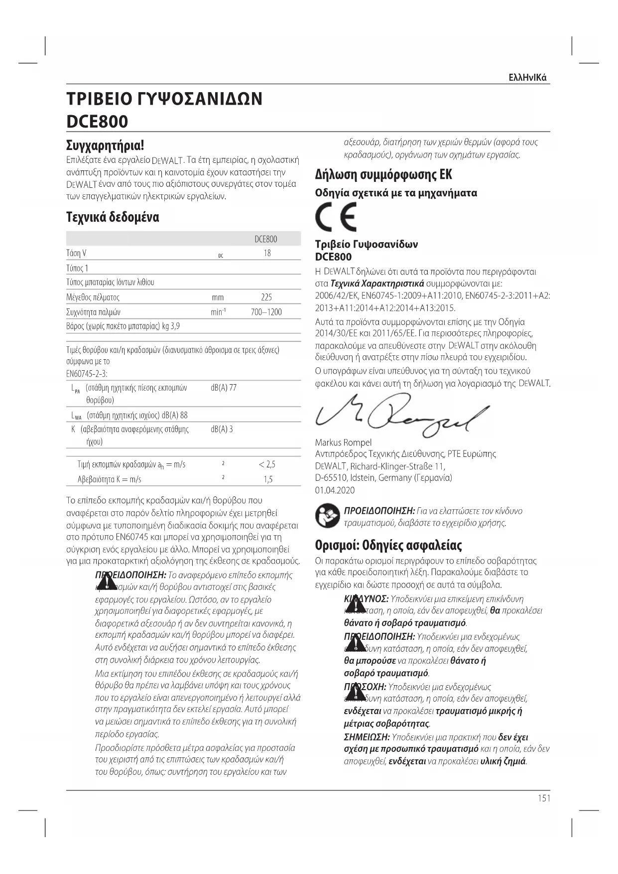 1,5 Συγχαρητήρια! Επιλέξατε ένα εργαλείο DeWALT . Τα έτη εμπειρίας, η σχολαστική ανάπτυξη προϊόντων και ηκαινοτομία έχουν καταστήσει την DeWALT έναν από τους πιο αξιόπιστους συνεργάτες στον τομέα των επαγγελματικών ηλεκτρικώνεργαλείων. Τεχνικά δεδομένα Ελληνικά (μετάφραση από τις πρωτότυπες οδηγίες) ΤΡΙΒΕΙΟ ΓΥΨΟΣΑΝΙΔΩΝ DCE800152