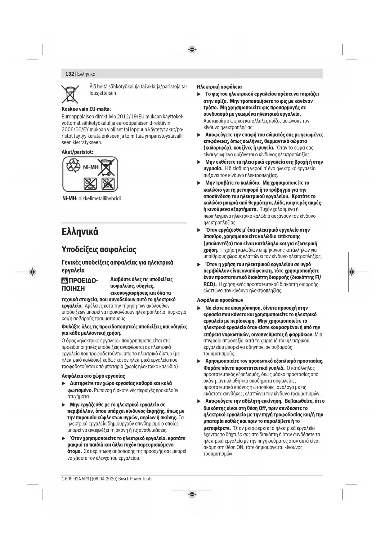 u Μην εργάζεσθε με το ηλεκτρικό εργαλείο σε περιβάλλον, όπου υπάρχει κίνδυνος έκρηξης, όπως με την παρουσία εύφλεκτων υγρών, αερίων ή σκόνης. Τα ηλεκτρικά εργαλεία δημιουργούν σπινθηρισμό ο οποίος μπορεί να αναφλέξει τη σκόνη ή τις αναθυμιάσεις. u Όταν χρησιμοποιείτε το ηλεκτρικό εργαλείο, κρατάτε μακριά τα παιδιά και άλλα τυχόν παρευρισκόμενα άτομα. Σε περίπτωση απόσπασης της προσοχής σας μπορεί να χάσετε τον έλεγχο του εργαλείου. Ηλεκτρική ασφάλεια u Το φις του ηλεκτρικού εργαλείου πρέπει να ταιριάζει στην πρίζα. Μην τροποποιήσετε το φις με κανέναν τρόπο. Μη χρησιμοποιείτε φις προσαρμογής σε συνδυασμό με γειωμένα ηλεκτρικά εργαλεία. Αμεταποίητα φις και κατάλληλες πρίζες μειώνουν τον κίνδυνο ηλεκτροπληξίας. u Αποφεύγετε την επαφή του σώματός σας με γειωμένες επιφάνειες, όπως σωλήνες, θερμαντικά σώματα (καλοριφέρ), κουζίνες ή ψυγεία. Όταν το σώμα σας είναι γειωμένο αυξάνεται ο κίνδυνος ηλεκτροπληξίας. u Μην εκθέτετε τα ηλεκτρικά εργαλεία στη βροχή ή στην υγρασία. Η διείσδυση νερού σ’ ένα ηλεκτρικό εργαλείο αυξάνει τον κίνδυνο ηλεκτροπληξίας. u Μην τραβάτε το καλώδιο. Μη χρησιμοποιείτε το καλώδιο για τη μεταφορά ή το τράβηγμα για την αποσύνδεση του ηλεκτρικού εργαλείου. Κρατάτε το καλώδιο μακριά από θερμότητα, λάδι, κοφτερές ακμές ή κινούμενα εξαρτήματα. Τυχόν χαλασμένα ή περιπλεγμένα ηλεκτρικά καλώδια αυξάνουν τον κίνδυνο ηλεκτροπληξίας. u Όταν εργάζεσθε μ’ ένα ηλεκτρικό εργαλείο στην ύπαιθρο, χρησιμοποιείτε καλώδιο επέκτασης (μπαλαντέζα) που είναι κατάλληλο και για εξωτερική χρήση. Ηχρήση καλωδίων επιμήκυνσης κατάλληλων για υπαίθριους χώρους ελαττώνει τον κίνδυνο ηλεκτροπληξίας. u Όταν η χρήση του ηλεκτρικού εργαλείου σε υγρό περιβάλλον είναι αναπόφευκτη, τότε χρησιμοποιήστε έναν προστατευτικό διακόπτη διαρροής (διακόπτηςFI/ RCD). Ηχρήση ενός προστατευτικού διακόπτη διαρροής ελαττώνει τον κίνδυνο ηλεκτροπληξίας. Ασφάλεια προσώπων u Να είστε σε επαγρύπνηση, δίνετε προσοχή στην εργασία που κάνετε και χρησιμοποιείτε το ηλεκτρικό εργαλείο με περίσκεψη. Μην χρησιμοποιείτε το ηλεκτρικό εργαλείο όταν είστε κουρασμένοι ή υπό την επήρεια ναρκωτικών, οινοπνεύματος ή φαρμάκων. Μια στιγμιαία απροσεξία κατά το χειρισμό του ηλεκτρικού εργαλείου μπορεί να οδηγήσει σε σοβαρούς τραυματισμούς. u Χρησιμοποιείτε τον προσωπικό εξοπλισμό προστασίας. Φοράτε πάντα προστατευτικά γυαλιά. Ο κατάλληλος προστατευτικός εξοπλισμός, όπως μάσκα προστασίας από σκόνη, αντιολισθητικά υποδήματα ασφαλείας, προστατευτικό κράνος ή ωτασπίδες, ανάλογα με τις εκάστοτε συνθήκες, ελαττώνει τον κίνδυνο τραυματισμών. u Αποφεύγετε την αθέλητη εκκίνηση. Βεβαιωθείτε, ότι ο διακόπτης είναι στη θέση Off, πριν συνδέσετε το ηλεκτρικό εργαλείο με την πηγή τροφοδοσίας και/ή την μπαταρία καθώς και πριν το παραλάβετε ή το μεταφέρετε. Όταν μεταφέρετε τα ηλεκτρικά εργαλεία έχοντας το δάχτυλό σας στο διακόπτη ή όταν συνδέσετε τα ηλεκτρικά εργαλεία με την πηγή ρεύματος όταν αυτά είναι ακόμη στη θέση ΟΝ, τότε δημιουργείται κίνδυνος τραυματισμών. 1 609 92A 5P3 | (06.04.2020) Bosch Power ToolsΕλληνικά | 133 u Απομακρύνετε από το ηλεκτρικό εργαλείο τυχόν εξαρτήματα ρύθμισης ή κλειδιά πριν θέσετε το ηλεκτρικό εργαλείο σε λειτουργία. Ένα εργαλείο ή κλειδί συναρμολογημένο σ’ ένα περιστρεφόμενο τμήμα ενός ηλεκτρικού εργαλείου μπορεί να οδηγήσει σε τραυματισμούς. u Προσέχετε πως στέκεστε. Φροντίζετ