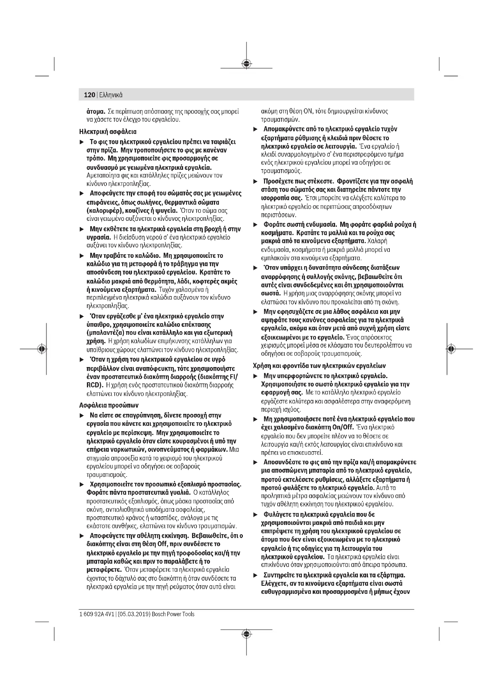u Μην εργάζεσθε με το ηλεκτρικό εργαλείο σε περιβάλλον, όπου υπάρχει κίνδυνος έκρηξης, όπως με την παρουσία εύφλεκτων υγρών, αερίων ή σκόνης. Τα ηλεκτρικά εργαλεία δημιουργούν σπινθηρισμό ο οποίος μπορεί να αναφλέξει τη σκόνη ή τις αναθυμιάσεις. u Όταν χρησιμοποιείτε το ηλεκτρικό εργαλείο, κρατάτε μακριά τα παιδιά και άλλα τυχόν παρευρισκόμενα Bosch Power Tools 1 609 92A 4V1 | (05.03.2019)120 | Ελληνικά άτομα. Σε περίπτωση απόσπασης της προσοχής σας μπορεί να χάσετε τον έλεγχο του εργαλείου. Ηλεκτρική ασφάλεια u Το φις του ηλεκτρικού εργαλείου πρέπει να ταιριάζει στην πρίζα. Μην τροποποιήσετε το φις με κανέναν τρόπο. Μη χρησιμοποιείτε φις προσαρμογής σε συνδυασμό με γειωμένα ηλεκτρικά εργαλεία. Αμεταποίητα φις και κατάλληλες πρίζες μειώνουν τον κίνδυνο ηλεκτροπληξίας. u Αποφεύγετε την επαφή του σώματός σας με γειωμένες επιφάνειες, όπως σωλήνες, θερμαντικά σώματα (καλοριφέρ), κουζίνες ή ψυγεία. Όταν το σώμα σας είναι γειωμένο αυξάνεται ο κίνδυνος ηλεκτροπληξίας. u Μην εκθέτετε τα ηλεκτρικά εργαλεία στη βροχή ή στην υγρασία. Η διείσδυση νερού σ’ ένα ηλεκτρικό εργαλείο αυξάνει τον κίνδυνο ηλεκτροπληξίας. u Μην τραβάτε το καλώδιο. Μη χρησιμοποιείτε το καλώδιο για τη μεταφορά ή το τράβηγμα για την αποσύνδεση του ηλεκτρικού εργαλείου. Κρατάτε το καλώδιο μακριά από θερμότητα, λάδι, κοφτερές ακμές ή κινούμενα εξαρτήματα. Τυχόν χαλασμένα ή περιπλεγμένα ηλεκτρικά καλώδια αυξάνουν τον κίνδυνο ηλεκτροπληξίας. u Όταν εργάζεσθε μ’ ένα ηλεκτρικό εργαλείο στην ύπαιθρο, χρησιμοποιείτε καλώδιο επέκτασης (μπαλαντέζα) που είναι κατάλληλο και για εξωτερική χρήση. Ηχρήση καλωδίων επιμήκυνσης κατάλληλων για υπαίθριους χώρους ελαττώνει τον κίνδυνο ηλεκτροπληξίας. u Όταν η χρήση του ηλεκτρικού εργαλείου σε υγρό περιβάλλον είναι αναπόφευκτη, τότε χρησιμοποιήστε έναν προστατευτικό διακόπτη διαρροής (διακόπτηςFI/ RCD). Ηχρήση ενός προστατευτικού διακόπτη διαρροής ελαττώνει τον κίνδυνο ηλεκτροπληξίας. Ασφάλεια προσώπων u Να είστε σε επαγρύπνηση, δίνετε προσοχή στην εργασία που κάνετε και χρησιμοποιείτε το ηλεκτρικό εργαλείο με περίσκεψη. Μην χρησιμοποιείτε το ηλεκτρικό εργαλείο όταν είστε κουρασμένοι ή υπό την επήρεια ναρκωτικών, οινοπνεύματος ή φαρμάκων. Μια στιγμιαία απροσεξία κατά το χειρισμό του ηλεκτρικού εργαλείου μπορεί να οδηγήσει σε σοβαρούς τραυματισμούς. u Χρησιμοποιείτε τον προσωπικό εξοπλισμό προστασίας. Φοράτε πάντα προστατευτικά γυαλιά. Ο κατάλληλος προστατευτικός εξοπλισμός, όπως μάσκα προστασίας από σκόνη, αντιολισθητικά υποδήματα ασφαλείας, προστατευτικό κράνος ή ωτασπίδες, ανάλογα με τις εκάστοτε συνθήκες, ελαττώνει τον κίνδυνο τραυματισμών. u Αποφεύγετε την αθέλητη εκκίνηση. Βεβαιωθείτε, ότι ο διακόπτης είναι στη θέση Off, πριν συνδέσετε το ηλεκτρικό εργαλείο με την πηγή τροφοδοσίας και/ή την μπαταρία καθώς και πριν το παραλάβετε ή το μεταφέρετε. Όταν μεταφέρετε τα ηλεκτρικά εργαλεία έχοντας το δάχτυλό σας στο διακόπτη ή όταν συνδέσετε τα ηλεκτρικά εργαλεία με την πηγή ρεύματος όταν αυτά είναι ακόμη στη θέση ΟΝ, τότε δημιουργείται κίνδυνος τραυματισμών. u Απομακρύνετε από το ηλεκτρικό εργαλείο τυχόν εξαρτήματα ρύθμισης ή κλειδιά πριν θέσετε το ηλεκτρικό εργαλείο σε λειτουργία. Ένα εργαλείο ή κλειδί συναρμολογημένο σ’ ένα περιστρεφόμενο τμήμα ενός ηλεκτρικού εργαλείου μπορεί να οδηγήσει σε τραυματισμούς. u Προσέχετε πως στέκεστε. Φροντίζετ