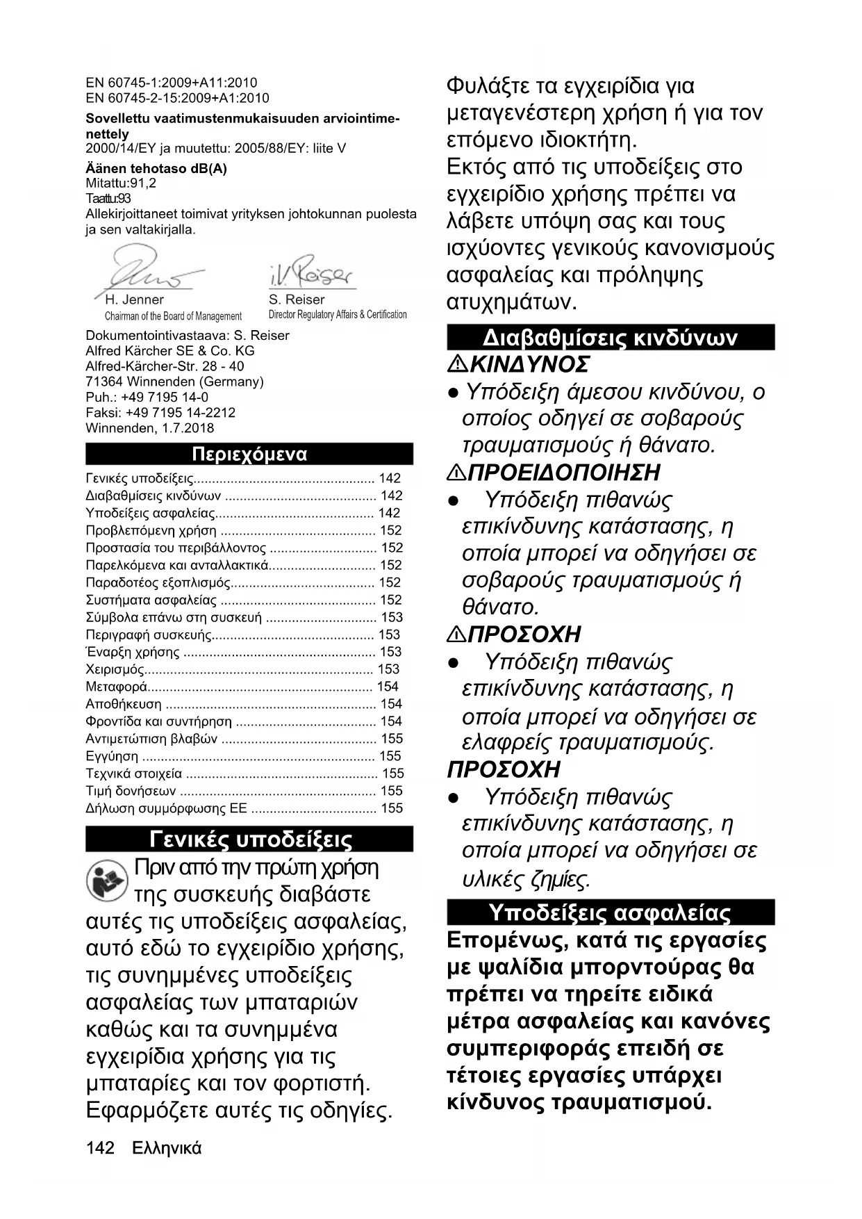 Leikkuuterän pituus mm 500 Paino (ilman akkupakettia) kg 2,7142 Ελληνικά EN 60745-1:2009+A11:2010 EN 60745-2-15:2009+A1:2010 Sovellettu vaatimustenmukaisuuden arviointime- nettely 2000/14/EY ja muutettu: 2005/88/EY: liite V Äänen tehotaso dB(A) Mitattu:91,2 Taattu:93 Allekirjoittaneet toimivat yrityksen johtokunnan puolesta ja sen valtakirjalla. Dokumentointivastaava: S. Reiser Alfred Kärcher SE & Co. KG Alfred-Kärcher-Str. 28 - 40 71364 Winnenden (Germany) Puh.: +49 7195 14-0 Faksi: +49 7195 14-2212 Winnenden, 1.7.2018 Περιεχόμενα Γενικές υποδείξεις Πριν από την πρώτη χρήση της συσκευής διαβάστε αυτές τις υποδείξεις ασφαλείας, αυτό εδώ το εγχειρίδιο χρήσης, τις συνημμένες υποδείξεις ασφαλείας των μπαταριών καθώς και τα συνημμένα εγχειρίδια χρήσης για τις μπαταρίες και τον φορτιστή. Εφαρμόζετε αυτές τις οδηγίες. Φυλάξτε τα εγχειρίδια για μεταγενέστερη χρήση ή για τον επόμενο ιδιοκτήτη. Εκτός από τις υποδείξεις στο εγχειρίδιο χρήσης πρέπει να λάβετε υπόψη σας και τους ισχύοντες γενικούς κανονισμούς ασφαλείας και πρόληψης ατυχημάτων. Διαβαθμίσεις κινδύνων
