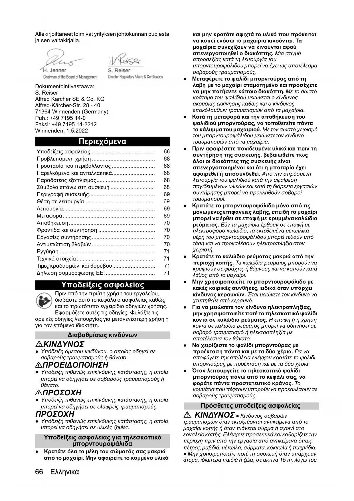 1,566 Ελληνικά Allekirjoittaneet toimivat yrityksen johtokunnan puolesta ja sen valtakirjalla. Dokumentointivastaava: S. Reiser Alfred Kärcher SE & Co. KG Alfred-Kärcher-Str. 28 - 40 71364 Winnenden (Germany) Puh.: +49 7195 14-0 Faksi: +49 7195 14-2212 Winnenden, 1.5.2022 Περιεχόμενα Υποδείξεις ασφαλείας Πριν από την πρώτη χρήση του εργαλείου, διαβάστε αυτό το κεφάλαιο ασφαλείας καθώς και το πρωτότυπο εγχειρίδιο οδηγιών χρήσης. Εφαρμόζετε αυτές τις οδηγίες. Φυλάξτε τις αρχικές οδηγίες λειτουργίας για μεταγενέστερη χρήση ή για τον επόμενο ιδιοκτήτη. Διαβαθμίσεις κινδύνων