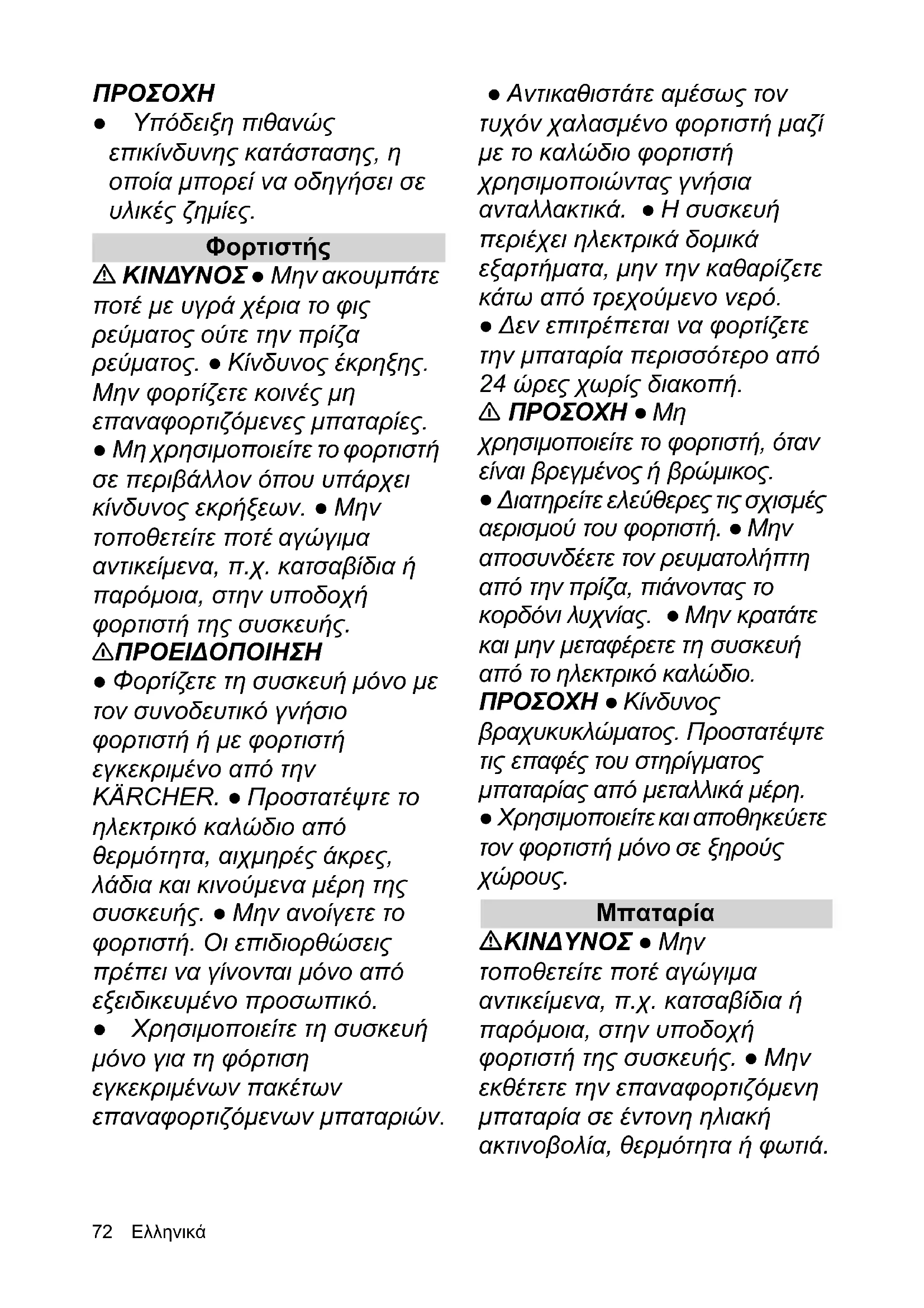 αντικείμενα, π.χ. κατσαβίδια ή παρόμοια, στην υποδοχή φορτιστή της συσκευής. 몇 ΠΡΟΕΙΔΟΠΟΙΗΣΗ ● Φορτίζετε τη συσκευή μόνο με τον συνοδευτικό γνήσιο φορτιστή ή με φορτιστή εγκεκριμένο από την KÄRCHER. ● Προστατέψτε το ηλεκτρικό καλώδιο από θερμότητα, αιχμηρές άκρες, λάδια και κινούμενα μέρη της συσκευής. ● Μην ανοίγετε το φορτιστή. Οι επιδιορθώσεις πρέπει να γίνοντ