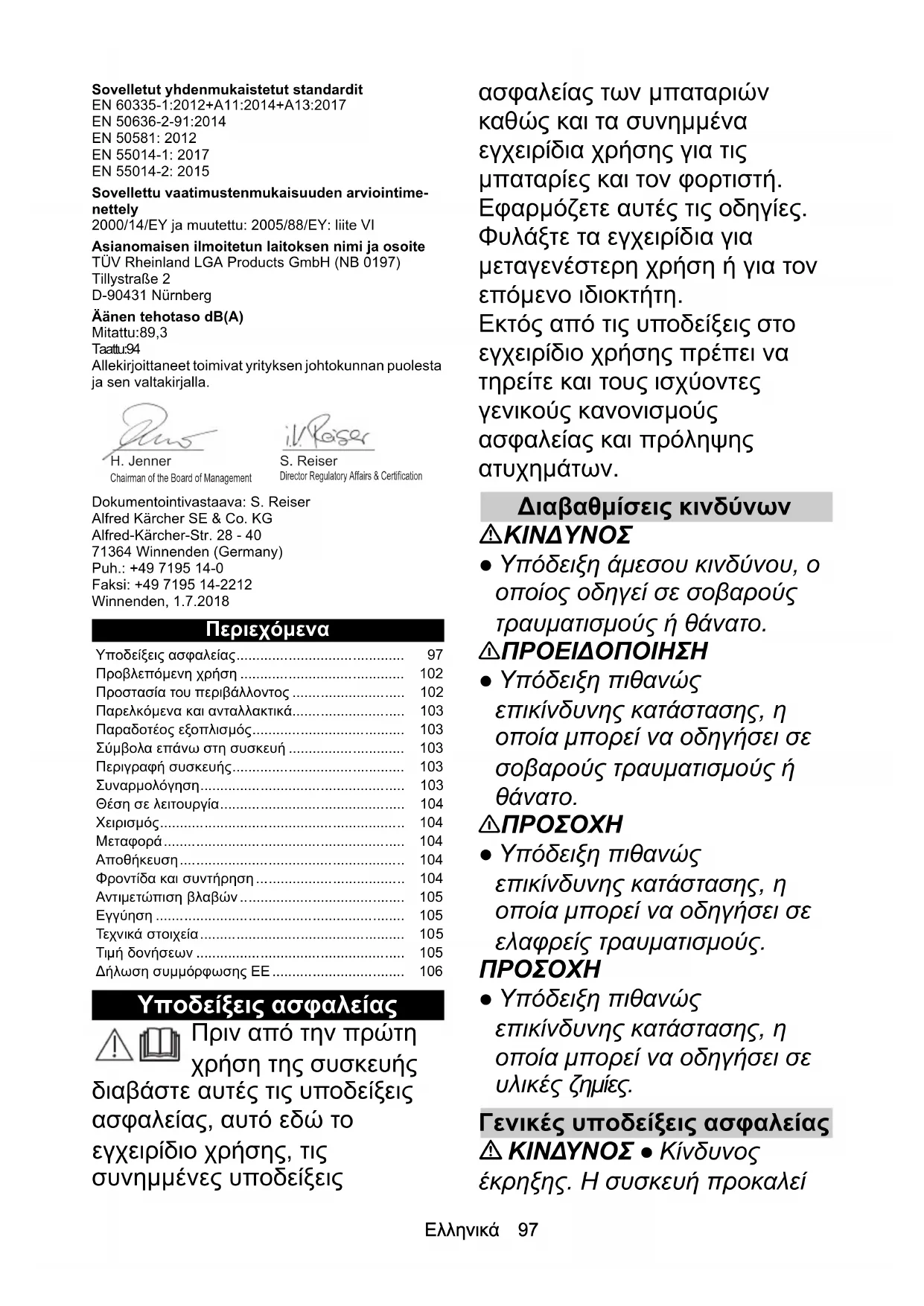 2,1 Epävarmuus K dB(A) 1,5 Mitat ja painot Pituus x leveys x korkeus mm 1773 x 366 x 277 Paino (ilman akkupakettia) kg 4,0Ελληνικά 97 Sovelletut yhdenmukaistetut standardit EN 60335-1:2012+A11:2014+A13:2017 EN 50636-2-91:2014 EN 50581: 2012 EN 55014-1: 2017 EN 55014-2: 2015 Sovellettu vaatimustenmukaisuuden arviointime- nettely 2000/14/EY ja muutettu: 2005/88/EY: liite VI Asianomaisen ilmoitetun laitoksen nimi ja osoite TÜV Rheinland LGA Products GmbH (NB 0197) Tillystraße 2 D-90431 Nürnberg Äänen tehotaso dB(A) Mitattu:89,3 Taattu:94 Allekirjoittaneet toimivat yrityksen johtokunnan puolesta ja sen valtakirjalla. Dokumentointivastaava: S. Reiser Alfred Kärcher SE & Co. KG Alfred-Kärcher-Str. 28 - 40 71364 Winnenden (Germany) Puh.: +49 7195 14-0 Faksi: +49 7195 14-2212 Winnenden, 1.7.2018 Περιεχόμενα Υποδείξεις ασφαλείας Πριν από την πρώτη χρήση της συσκευής διαβάστε αυτές τις υποδείξεις ασφαλείας, αυτό εδώ το εγχειρίδιο χρήσης, τις συνημμένες υποδείξεις ασφαλείας των μπαταριών καθώς και τα συνημμένα εγχειρίδια χρήσης για τις μπαταρίες και τον φορτιστή. Εφαρμόζετε αυτές τις οδηγίες. Φυλάξτε τα εγχειρίδια για μεταγενέστερη χρήση ή για τον επόμενο ιδιοκτήτη. Εκτός από τις υποδείξεις στο εγχειρίδιο χρήσης πρέπει να τηρείτε και τους ισχύοντες γενικούς κανονισμούς ασφαλείας και πρόληψης ατυχημάτων. Διαβαθμίσεις κινδύνων