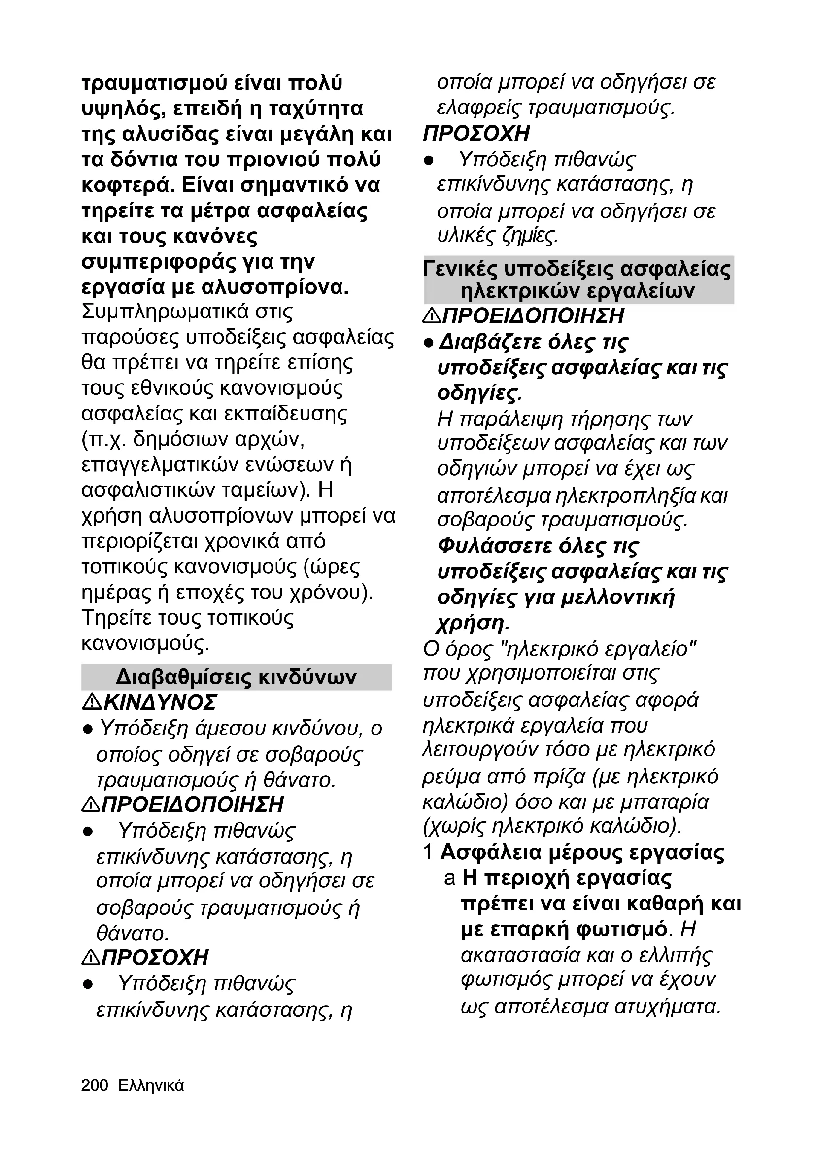 Υπόδειξη ● Σε μερικές χώρες μπορεί να υπάρχουν κανονισμοί που περιορίζουν τη χρήση αυτής της συσκευής. ΕνημερωθείτεΕλληνικά 205 σχετικά από τις κατά τόπον αρμόδιες υπηρεσίες. ΚΙΝΔΥΝΟΣ ● Κίνδυνος θανατηφόρου τραυματισμού από κόψιμο λόγω ανεξέλεγκτης κίνησης του εργαλείου. Κρατήστε τα μέλη του σώματος μακριά από τα κινούμενα μέρη. ● Κίνδυνος τραυματισμού από αντικείμενα που εκτοξεύονται ή πέφτουν. Ποτέ μην χρησιμοποιείτε τη συσκευή αν υπάρχουν άτομα, ιδιαίτερα παιδιά ή ζώα, σε ακτίνα 15 m.
