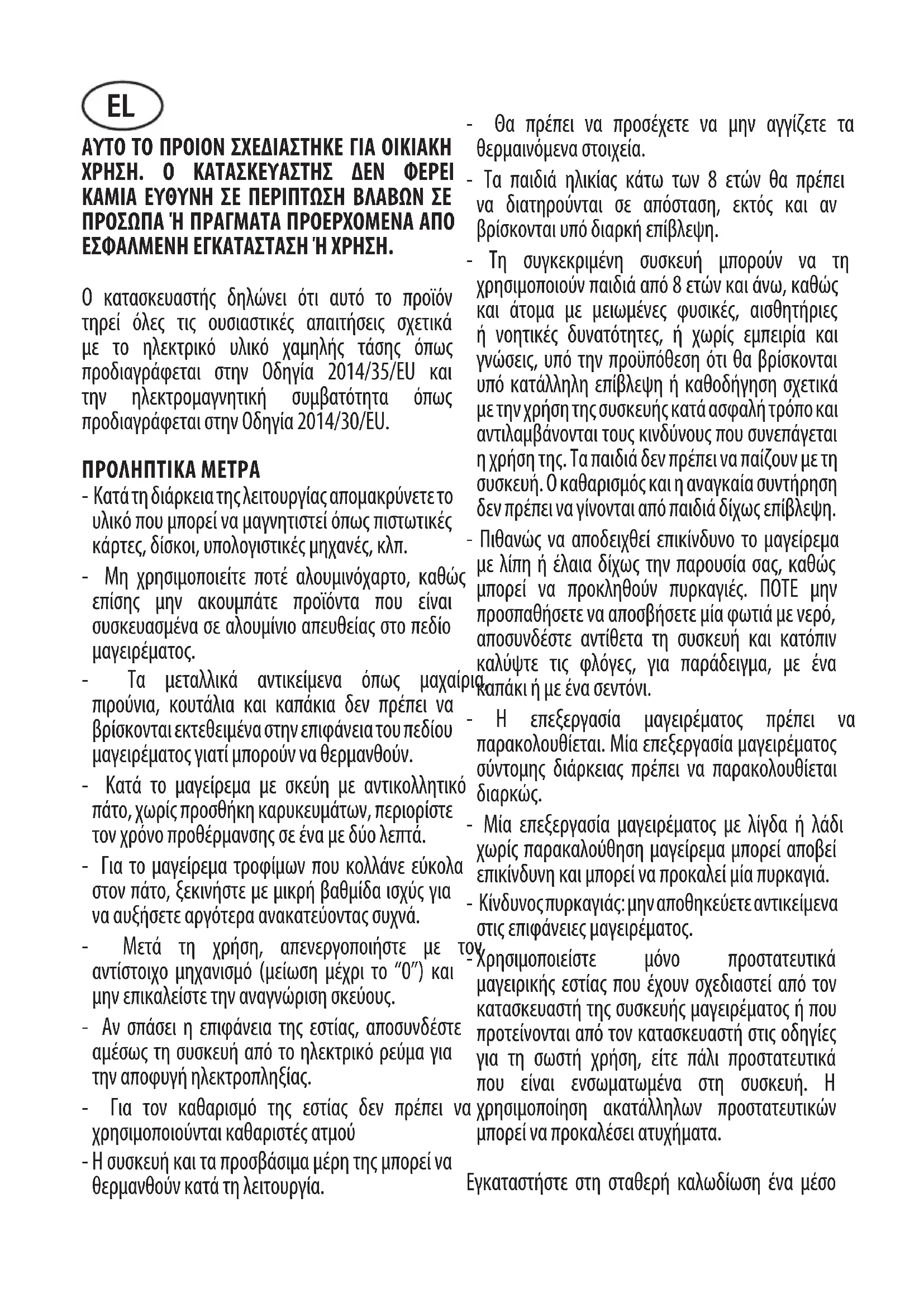 - Μία επεξεργασία μαγειρέματος με λίγδα ή λάδι χωρίς παρακαλούθηση μαγείρεμα μπορεί αποβεί επικίνδυνη και μπορεί να προκαλεί μία πυρκαγιά. - Κίνδυνος πυρκαγιάς: μην αποθηκεύετε αντικείμενα στις επιφάνειες μαγειρέματος. - Χρησιμοποιείστε μόνο προστατευτικά μαγειρικής εστίας που έχουν σχεδιαστεί από τον κατασκευαστή της συσκευής μαγειρέματος ή που προτείνονται από τον κατασκευαστή στις οδηγίες για τη σωστή χρήση, είτε πάλι προστατευτικά που είναι ενσωματωμένα στη συσκευή. Η χρησιμοποίηση ακατάλληλων προστατευτικών μπορεί να προκαλέσει ατυχήματα. Εγκαταστήστε στη σταθερή καλωδίωση ένα µέσο ELαποσύνδεσης από το ηλεκτρικό δίκτυο µε αφαίρεση επαφής σε όλους τους πόλους που να επιτρέπει την πλήρη αποσύνδεση σε συνθήκες υπέρτασης κατηγορίας ΙΙΙ, σύµφωνα µε τον κανονισµό περί καλωδιώσεων. Με την εγκατάσταση της συσκευής πρέπει να εξασφαλίζεται η εύκολη πρόσβαση της πρίζας και του διακόπτη. Αυτή η συσκευή δεν προβλέπεται να λειτουργεί µέσω εξωτερικού χρονοδιακόπτη ή ξεχωριστού συστήµατος µε τηλεχειριστήριο. Ο κατασκευαστής δε φέρει καµία ευθύνη στην περίπτωση που τα προαναφερόµενα και οι συνήθεις κανονισµοί δεν τηρηθούν. Το καλώδιο τροφοδοσίας σε περίπτωση ζηµιάς, θα πρέπει να αντικατασταθεί από την κατασκευάστρια εταιρία ή της Τεχνικής Υπηρεσίας της ή από έναν εξειδικευµένο τεχνικό, για αποφυγή κάθε κινδύνου. ΒΑΣΙΚΕΣ ΑΡΧΕΣ ΛΕΙΤΟΥΡΓΙΑΣ ΕΙΚ. 1 Βασίζεται στις ηλεκτροµαγνητικές ιδιότητες των περισσοτέρων σκευών µαγειρέµατος. Το πηνίο που παράγει τον ηλεκτροµαγνητικό πεδίο χρησιµοποιείται και ελέγχεται από το ηλεκτρονικό κύκλωµα (επαγωγή). Η θερµότητα µεταδίδεται από το ίδιο το σκεύος στα τρόφιµα. Η διαδικασία µαγειρέµατος πραγµατοποιείται όπως περιγράφεται παρακάτω. - ελάχιστη διάχυση (υψηλή απόδοση) - η αποµάκρυνση του σκεύους (ή µόνο το σήκωµά του) προκαλεί αυτόµατα το κλείδωµα του συστήµατος. - το ηλεκτρονικό κύκλωµα επιτρέπει τη µέγιστη ευελιξία και ρύθµιση ακριβείας. (Εικ. 1) 1 Σκεύος 2 Επαγωγικό ρεύµα 3 Μαγνητικό πεδίο 4 Επαγωγέας 5 Ηλεκτρονικό κύκλωµα 6 Ηλεκτρική τροφοδότηση Οδηγίε για τον χρήστη (Εικ. 2) 1 Άναµµα/σβήσιµο ON/OFF 2 Μείον – 3 Συν + 4 Ζώνη µαγειρέµατος 5 Οθόνη επιπέδου ισχύος 6 Πλήκτρο επιλογής ζώνης Εγκατάσταση Όλες οι ενέργειες σχετικά µε την εγκατάσταση (ηλεκτρική σύνδεση) πρέπει να γίνουν από εξειδικευµένο προσωπικό σύµφωνα µε τους ισχύοντες κανονισµούς. Για τις ειδικές οδηγίες ανατρέξτε στην ενότητα που απευθύνεται στον τεχνικό εγκατάστασης. Ενεργοποίηση/απενεργοποίηση του πεδίου χειρισµού αφή Touch Control (Έλεγχο µε αφή) Μετά τη σύνδεση στο ηλεκτρικό δίκτυο, απαιτείται ένα δευτερόλεπτο περίπου για να λειτουργήσει το πεδίο χειρισµού αφής Τouch. Μετά το reset (επανέναρξη) όλες οι ενδείξεις και οι φωτεινοί δείκτες LEDS αναβοσβήνουν για ένα δευτερόλεπτο περίπου. Αφού περάσει αυτό το χρονικό διάστηµα οι ενδείξεις βαθµίδων µαγειρέµατος και οι δείκτες LEDS απενεργοποιούνται και το πεδίο χειρισµού αφής Τouch εισέρχεται σε κατάσταση αναµονής. Για να ανάψει το touch πρέπει να πιέσετε το πλήκτρο ανάφλεξης (1). Οι ενδείξεις των ζωνών µαγειρέµατος απεικονίζουν το “0“. Στην περίπτωση που µια ζώνη µαγειρέµατος “καίει” (υψηλή θερµοκρασία), θα απεικονιστεί η ένδειξη “H“ αντί για “0“. Η κουκίδα που βρίσκεται κάτω δεξιά σε όλες τις ενδείξεις βαθµίδων µαγειρέµατος αναβοσβήνει µε συχνότητα ενός δευτερολέπτου για να υποδείξει ότι µέχρι εκε
