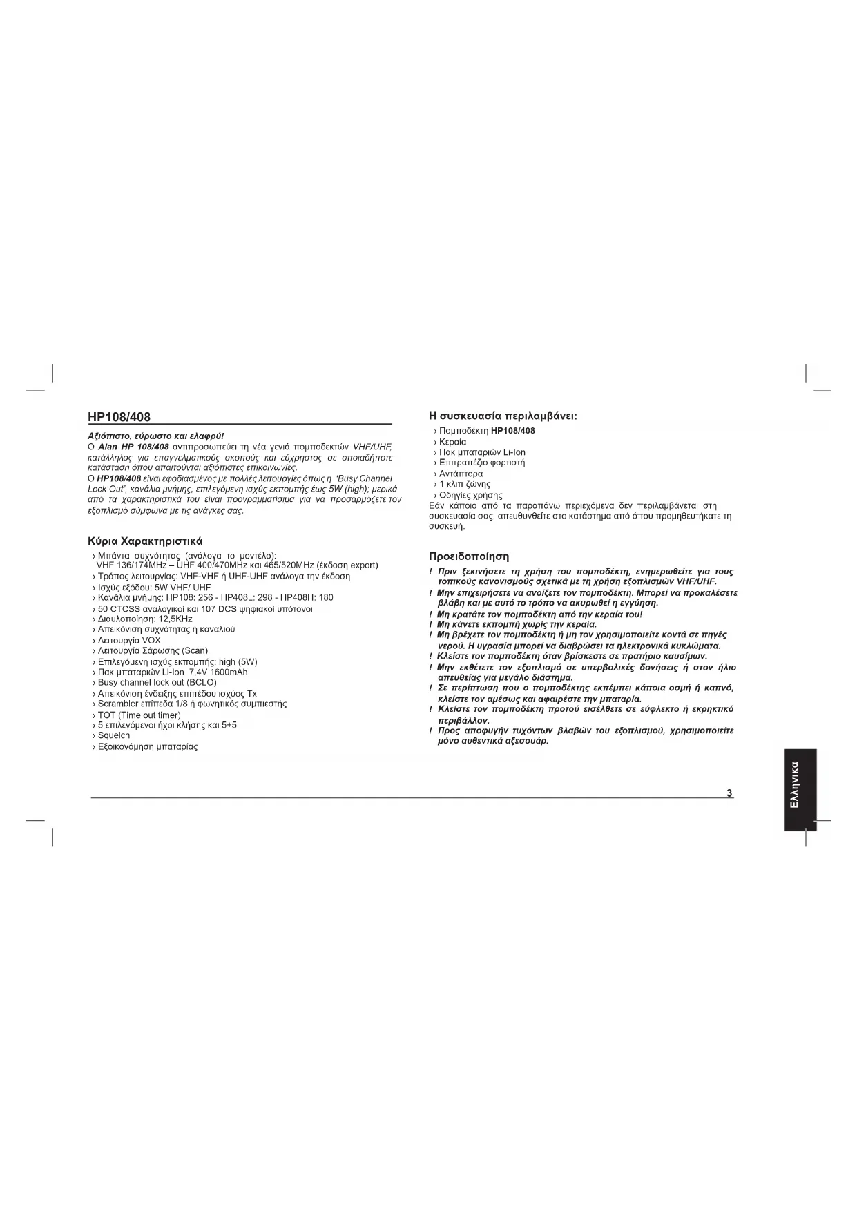 Χαρακτηριστικά Μονάδα Αξία/Μετρήσεις Συχνότητα MHz HP108:από 136 έως 174; HP408L:από 400 έως 470; HP408H (έκδοση export):από 465 έως 520 Αριθμός Προγραμματιζόμενων Καναλιών - HP108: 256; HP408L: 298; HP408H (έκδοση export): 180 Απόσταση διαύλων KHz 12.5 Κατανάλωση παροχής ισχύος Vdc 7.4 Αυτονομία μπαταρίας mAh Li-Ion 1.600 Κύκλος Εργασιών ώρες 5% σε TX στη μέγιστη ισχύ 85% σε RX στο 60 % της μέγιστης υπολογιζόμενης A.F. ισχύος 90% σε RX με κλειστό squelch σε κατάσταση εξοικονόμησης ισχύος Αντίσταση κεραίας Ohm 50 Αντίσταση μεγαφώνου Ohm 4 Σταθερότητα συχνότητας ppm ±2.5 Εύρος θερμοκρασίας λειτουργίας °C Από: –25 to +55