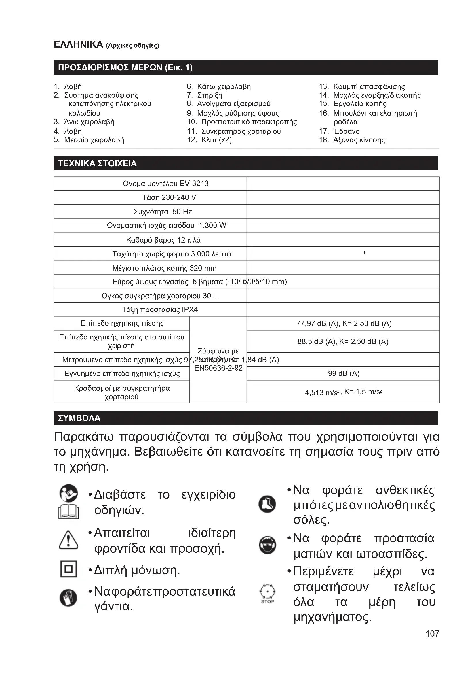 ΤΕΧΝΙΚΑ ΣΤΟΙΧΕΙΑ Όνομα μοντέλου EV-3213 Τάση 230-240 V Συχνότητα 50 Hz Ονομαστική ισχύς εισόδου 1.300 W Καθαρό βάρος 12 κιλά Ταχύτητα χωρίς φορτίο 3.000 λεπτό