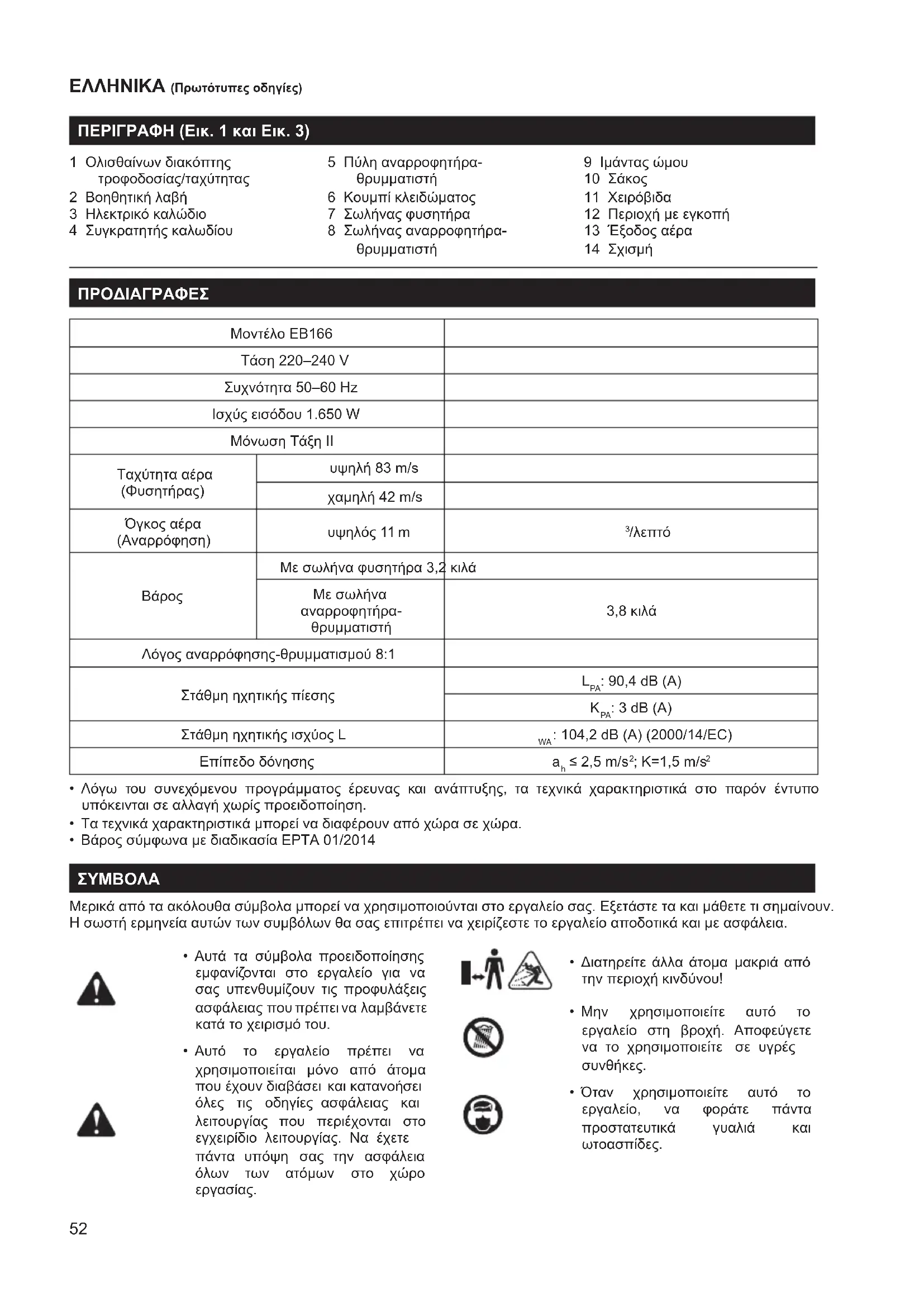 genindstil om nødvendigt. EF-KONFORMITETSERKLÆRING Kun for lande i Europa EF-konformitetserklæringen er inkluderet som Tillæg A til denne instruktionsvejledning.52 ΕΛΛΗΝΙΚΑ (Πρωτότυπες οδηγίες) ΠΕΡΙΓΡΑΦΗ (Εικ. 1 και Εικ. 3) 1 Ολισθαίνων διακόπτης τροφοδοσίας/ταχύτητας 2 Βοηθητική λαβή 3 Ηλεκτρικό καλώδιο 4 Συγκρατητής καλωδίου 5 Πύλη αναρροφητήρα- θρυμματιστή 6 Κουμπί κλειδώματος 7 Σωλήνας φυσητήρα 8 Σωλήνας αναρροφητήρα- θρυμματιστή 9 Ιμάντας ώμου 10 Σάκος 11 Χειρόβιδα 12 Περιοχή με εγκοπή 13 Έξοδος αέρα 14 Σχισμή ΠΡΟΔΙΑΓΡΑΦΕΣ Μοντέλο EB166 Τάση 220–240 V Συχνότητα 50–60 Hz Ισχύς εισόδου 1.650 W Μόνωση Τάξη II Ταχύτητα αέρα (Φυσητήρας) υψηλή 83 m/s χαμηλή 42 m/s