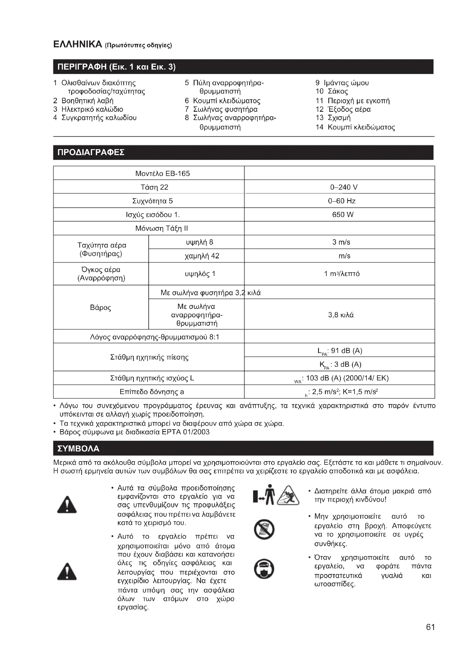 Ιμάντας ώμου 10 Σάκος 11 Περιοχή με εγκοπή 12 Έξοδος αέρα 13 Σχισμή 14 Κουμπί κλειδώματος ΠΡΟΔΙΑΓΡΑΦΕΣ Μοντέλο EB-165 Τάση 22 0–240 V Συχνότητα 5 0–60 Hz Ισχύς εισόδου 1. 650 W Μόνωση Τάξη II Ταχύτητα αέρα (Φυσητήρας) υψηλή 8 3 m/s χαμηλή 42 m/s