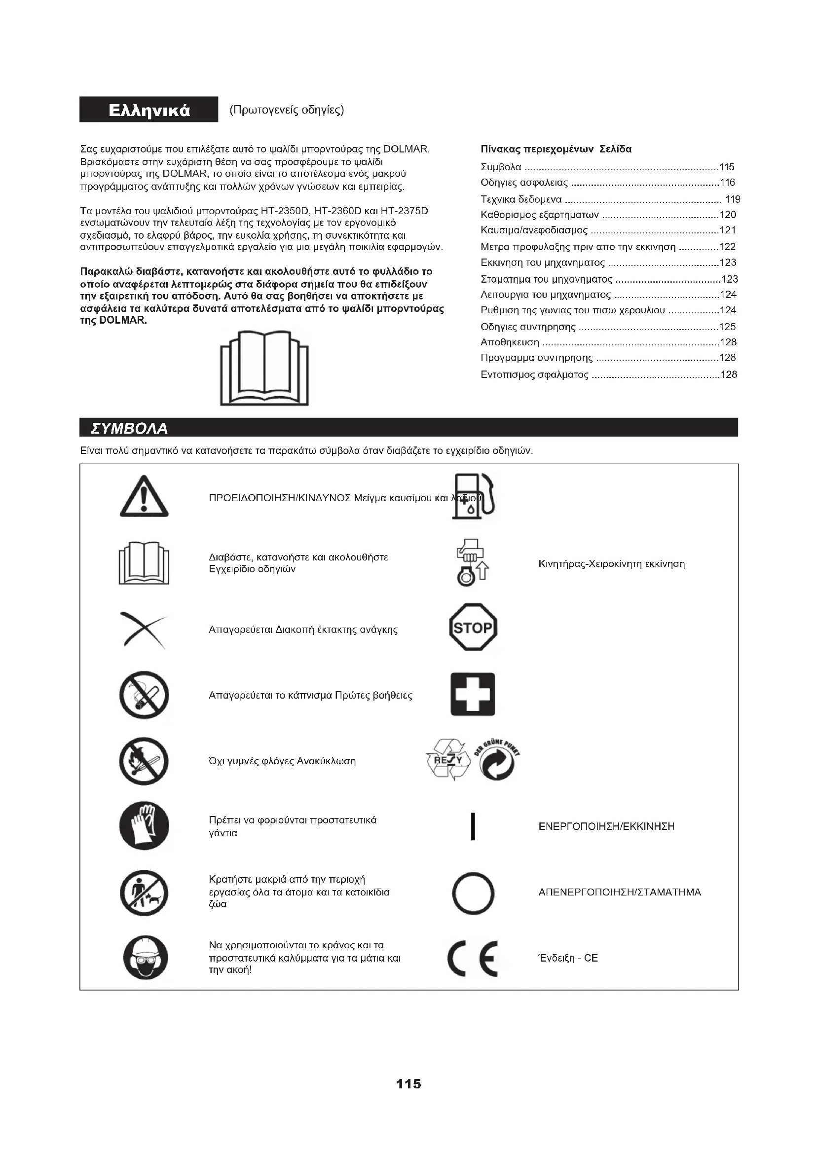 - Ένδειξη - CE (Πρωτογενείς οδηγίες) Πίνακας περιεχομένων Σελίδα Συμβολα p. 115