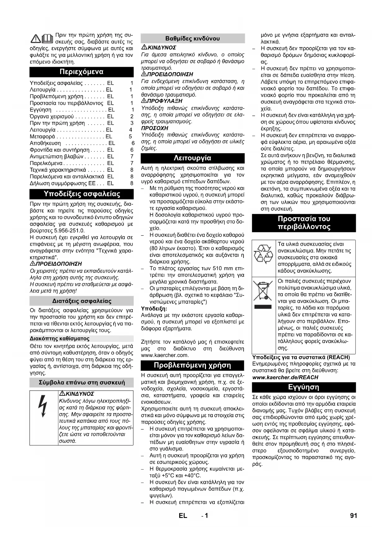 Chairman of the Board of Management Director Regulatory Affairs & Certification 90 FI- 1 Πριν την πρώτη χρήση της συ- σκευής σας, διαβάστε αυτές τις οδηγίες, ενεργήστε σύμφωνα με αυτές και φυλάξτε τις για μελλοντική χρήση ή για τον επόμενο ιδιοκτήτη. Πριν την πρώτη χρήση της συσκευής, δια- βάστε και τηρείτε τις παρούσες οδηγίες χρήσης και το συνοδευτικό έντυπο οδηγιών ασφαλείας για συσκευές καθαρισμού με βούρτσες 5.956-251.0. Η συσκευή έχει εγκριθεί για λειτουργία σε επιφάνειες με τη μέγιστη ανωφέρεια, που αναγράφεται στην ενότητα "Τεχνικά χαρα- κτηριστικά". 몇 ΠΡΟΕΙΔΟΠΟΙΗΣΗ Οι χειριστές πρέπει να εκπαιδευτούν κατάλ- ληλα στη χρήση αυτής της συσκευής. Η συσκευή πρέπει να σταθμεύεται με ασφά- λεια μετά τη χρήση! Οι διατάξεις ασφαλείας χρησιμεύουν για την προστασία του χρήστη και δεν επιτρέ- πεται να τίθενται εκτός λειτουργίας ή να πα- ρακάμπτονται οι λειτουργίες τους. Θέτει τον κινητήρα εκτός λειτουργίας, μετά από σύντομη καθυστέρηση, όταν ο οδηγός φύγει από τη θέση του στη διάρκεια της ερ- γασίας ή, αντίστοιχα, στη διάρκεια της οδή-