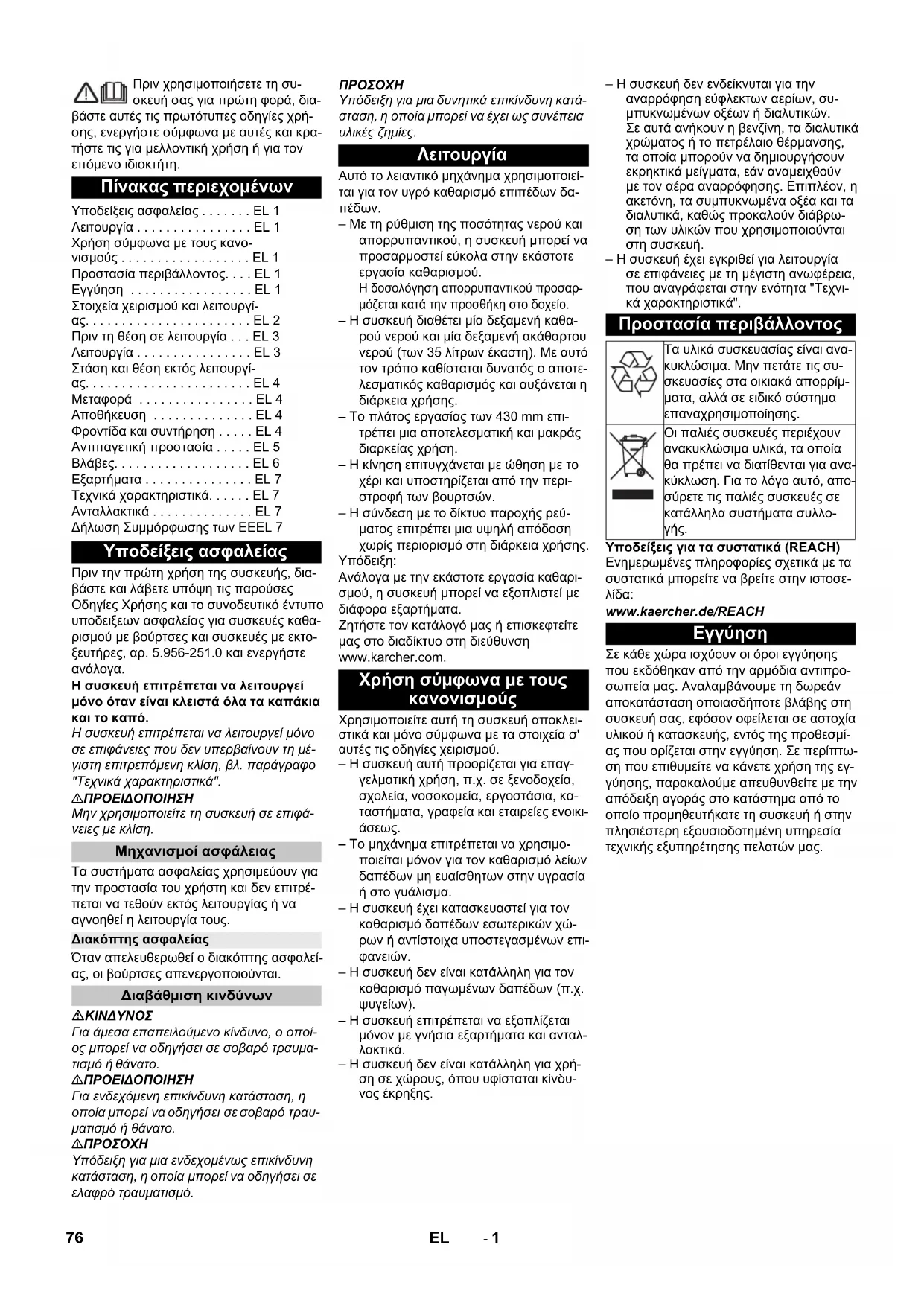 www.kaercher.de/REACH Σε κάθε χώρα ισχύουν οι όροι εγγύησης που εκδόθηκαν από την αρμόδια αντιπρο- σωπεία μας. Αναλαμβάνουμε τη δωρεάν αποκατάσταση οποιασδήποτε βλάβης στη συσκευή σας, εφόσον οφείλεται σε αστοχία υλικού ή κατασκευής, εντός της προθεσμί- ας που ορίζεται στην εγγύηση. Σε περίπτω- ση που επιθυμείτε να κάνετε χρήση της εγ- γύησης, παρακαλούμε απευθυνθείτε με την απόδειξη αγοράς στο κατάστημα από το οποίο προμηθευτήκατε τη συσκευή ή στην πλησιέστερη εξουσιοδοτημένη υπηρεσία τεχνικής εξυπηρέτησης πελατών μας. Πίνακας περιεχομένων Υποδείξεις ασφαλείας . . . . . . . EL 1 Λειτουργία . . . . . . . . . . . . . . . . EL 1 Χρήση σύμφωνα με τους κανο- νισμούς . . . . . . . . . . . . . . . . . . EL 1 Προστασία περιβάλλοντος. . . . EL 1 Εγγύηση . . . . . . . . . . . . . . . . . EL 1 Στοιχεία χειρισμού και λειτουργί- ας. . . . . . . . . . . . . . . . . . . . . . . EL 2 Πριν τη θέση σε λειτουργία . . . EL 3 Λειτουργία . . . . . . . . . . . . . . . . EL 3 Στάση και θέση εκτός λειτουργί- ας. . . . . . . . . . . . . . . . . . . . . . . EL 4 Μεταφορά . . . . . . . . . . . . . . . . EL 4 Αποθήκευση . . . . . . . . . . . . . . EL 4 Φροντίδα και συντήρηση . . . . . EL 4 Αντιπαγετική προστασία . . . . . EL 5 Βλάβες. . . . . . . . . . . . . . . . . . . EL 6 Εξαρτήματα . . . . . . . . . . . . . . . EL 7 Τεχνικά χαρακτηριστικά. . . . . . EL 7 Ανταλλακτικά . . . . . . . . . . . . . . EL 7 Δήλωση Συμμόρφωσης των ΕEEL 7 Υποδείξεις ασφαλείας Μηχανισμοί ασφάλειας Διακόπτης ασφαλείας Διαβάθμιση κινδύνων