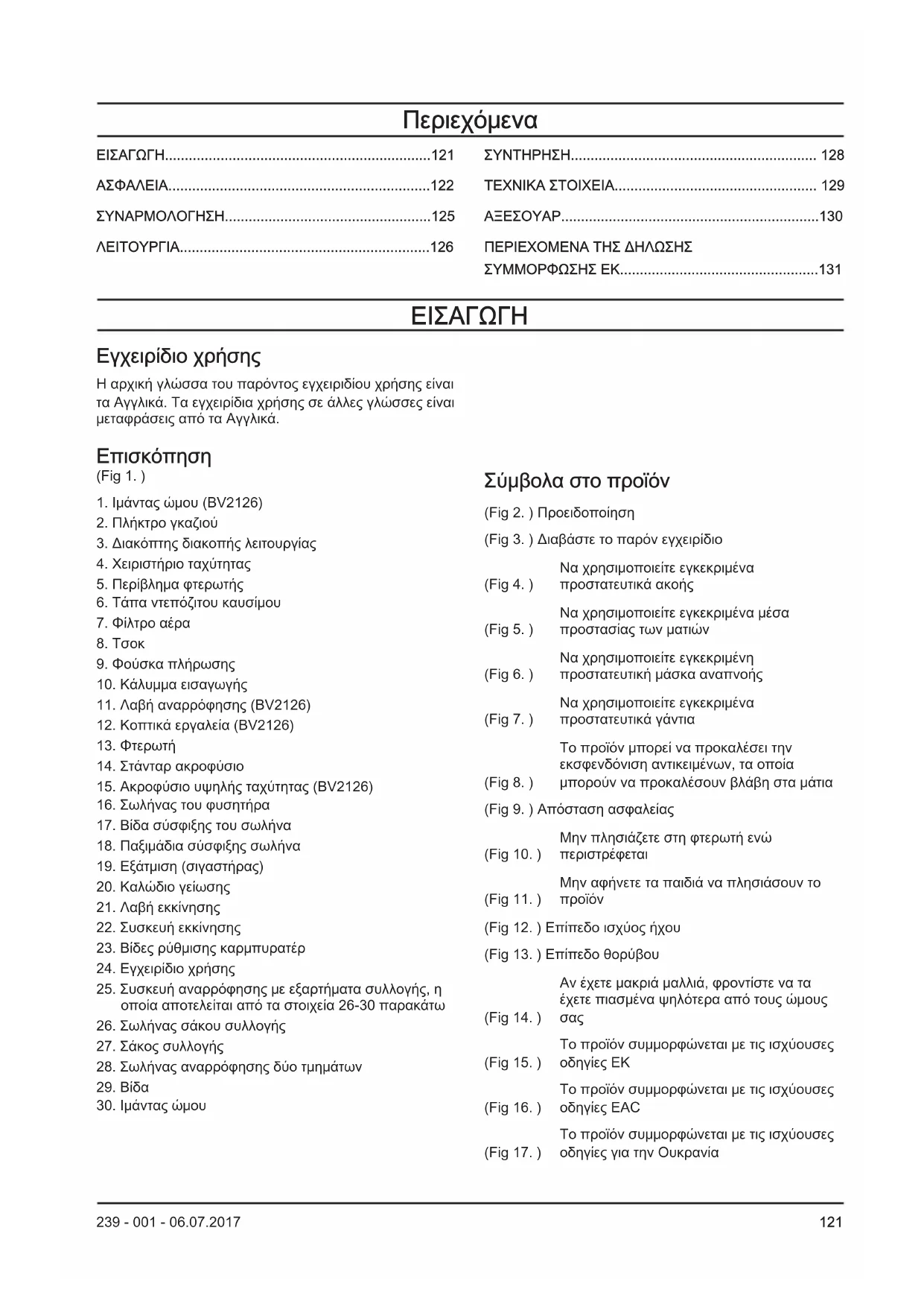 Πλατφόρμα125B28HV, που αντιστοιχεί στο μοντέλο B2126, BV2126 Παρτίδα Αριθμός σειράς με ημερομηνία 2013 και μεταγενέστερη συμμορφώνεται πλήρως με τις ακόλουθες οδηγίες της ΕΕ και τους κανονισμούς: Οδηγία/κανονισμού Περιγραφή 2006/42/EC "σχετικά με τα μηχανήματα" 2014/30/EU "σχετικά με την ηλεκτρομαγνητική συμβατότητα" 2000/14/EC "σχετικά με το θόρυβο σε εξωτερικούς χώρους" Τα εναρμονισμένα πρότυπα ή/και οι τεχνικές προδιαγραφές που εφαρμόζονται είναι τα εξής: EN ISO